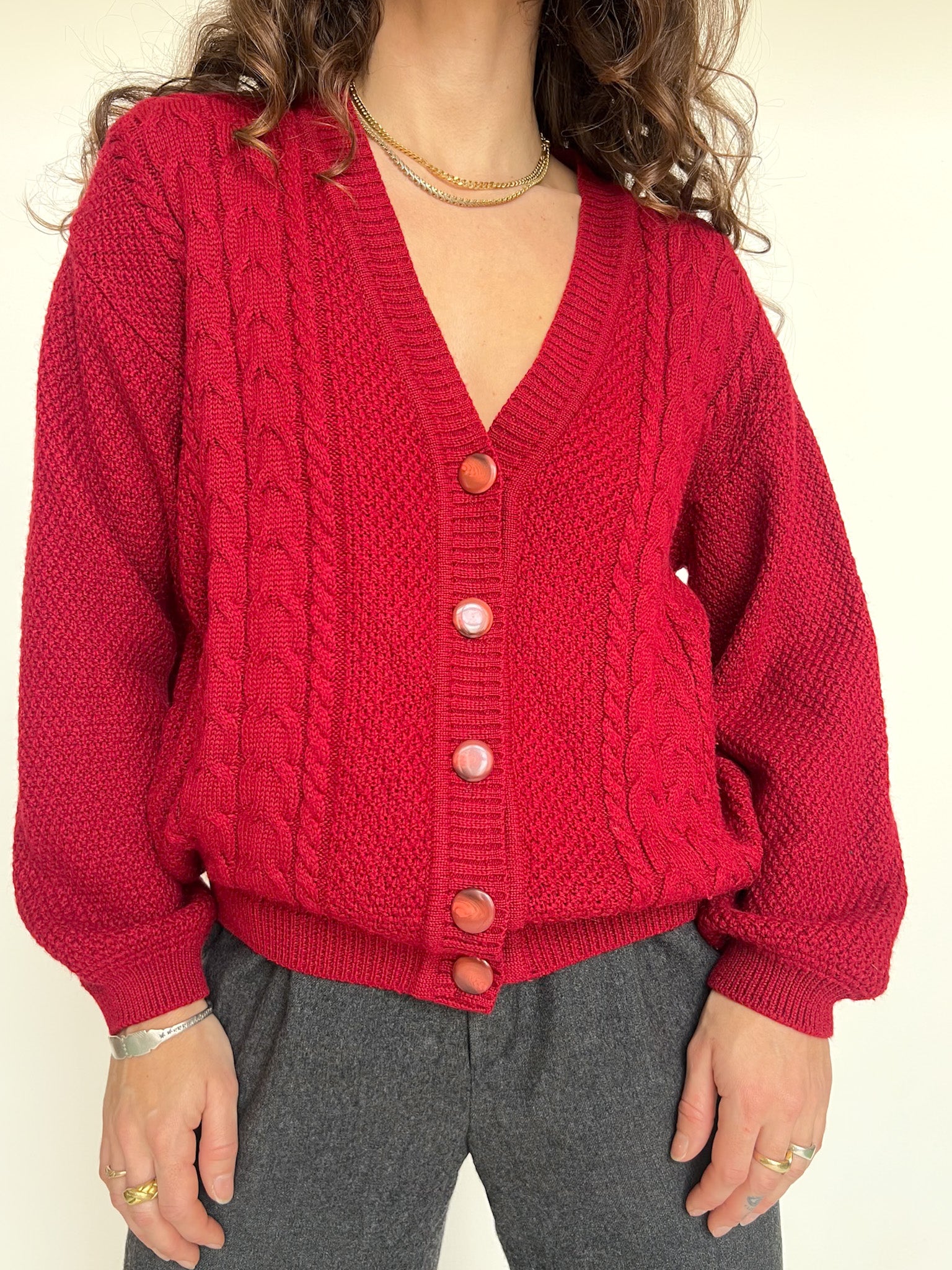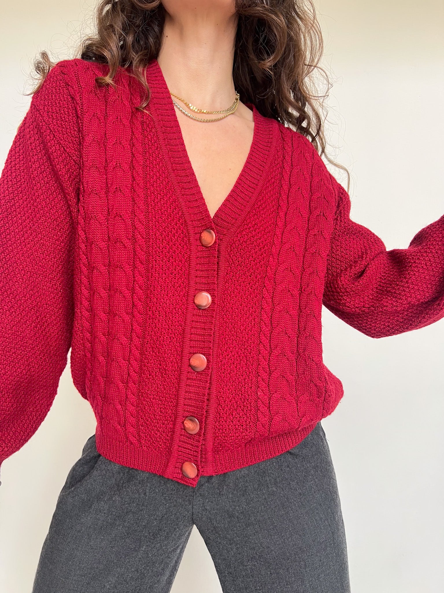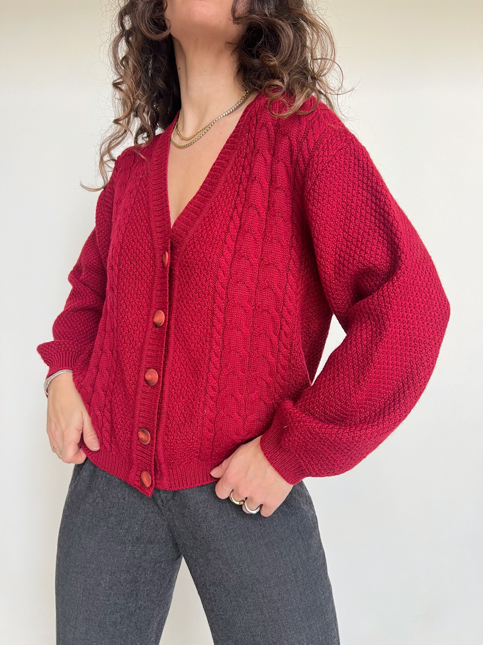 - Special features: Loose silhouette, rich red color, classic knit texture, elegant statement buttons
