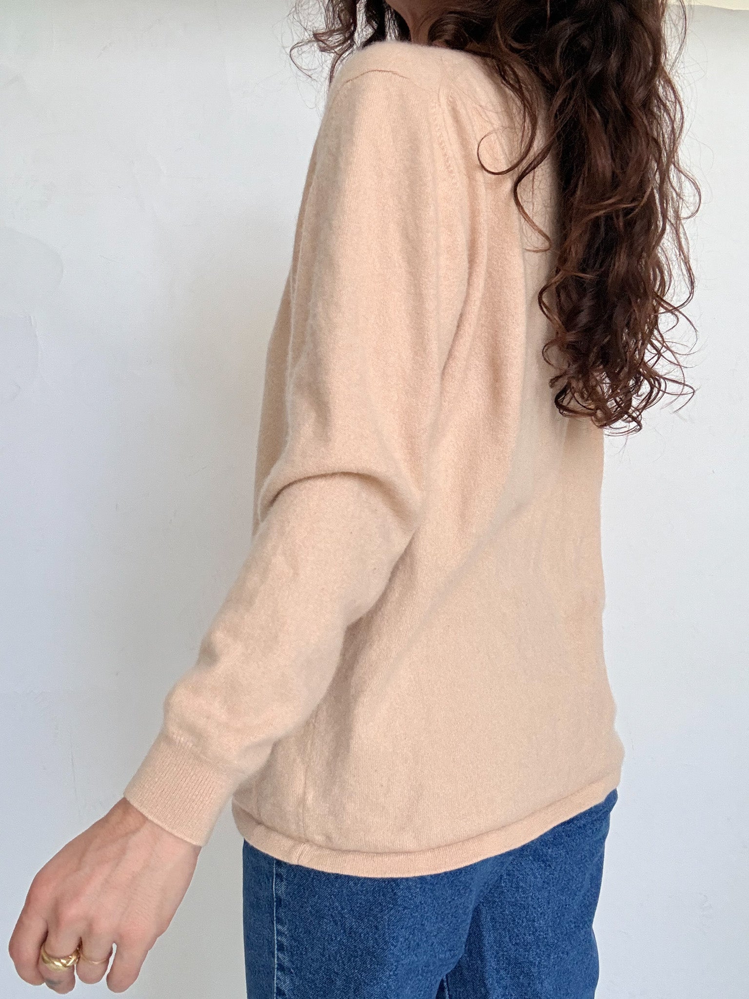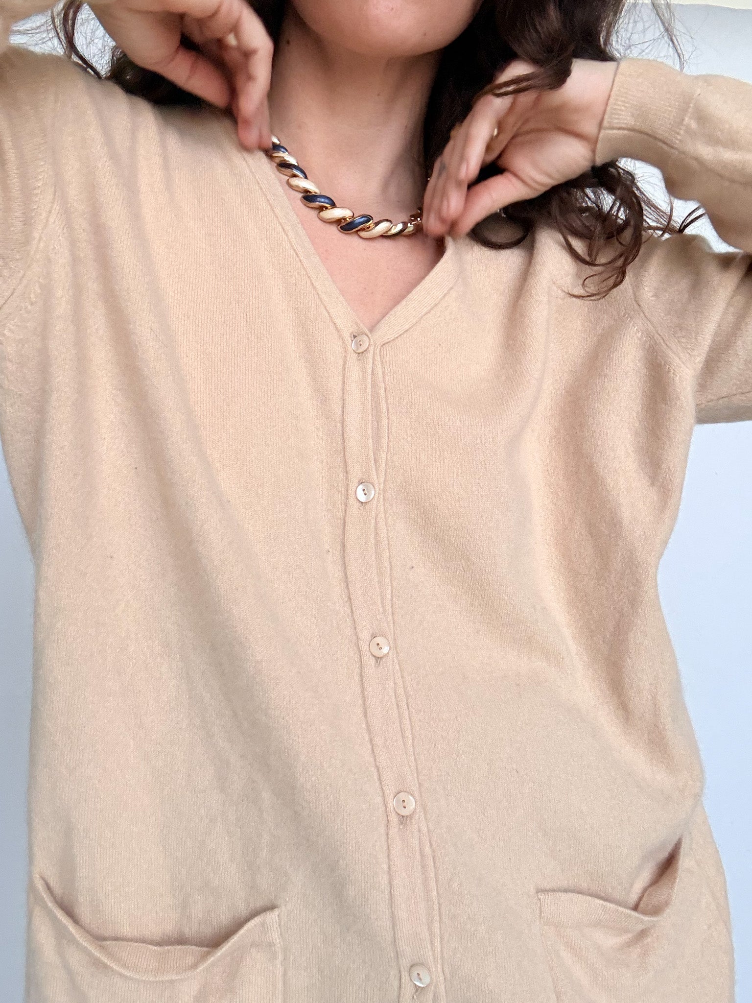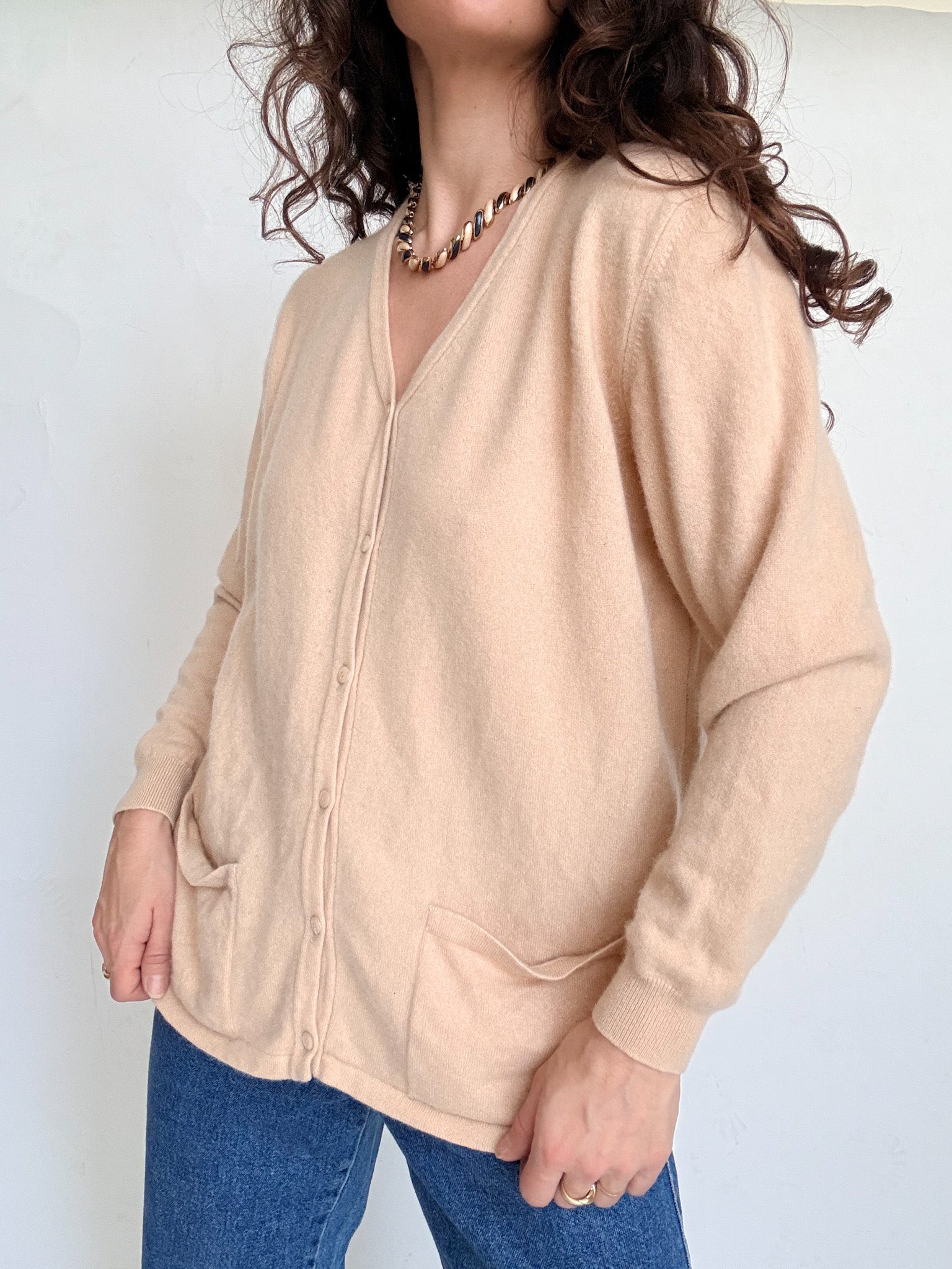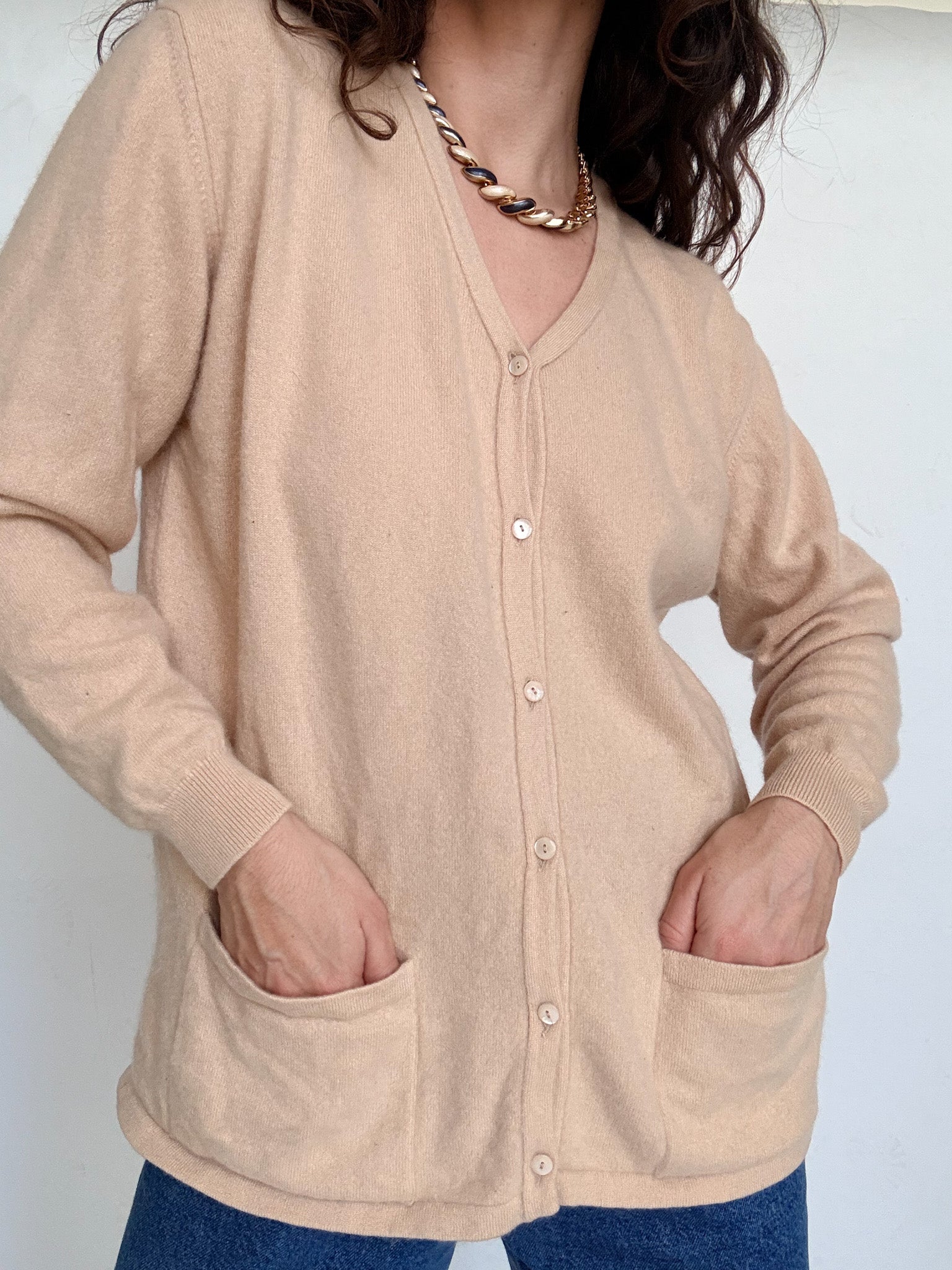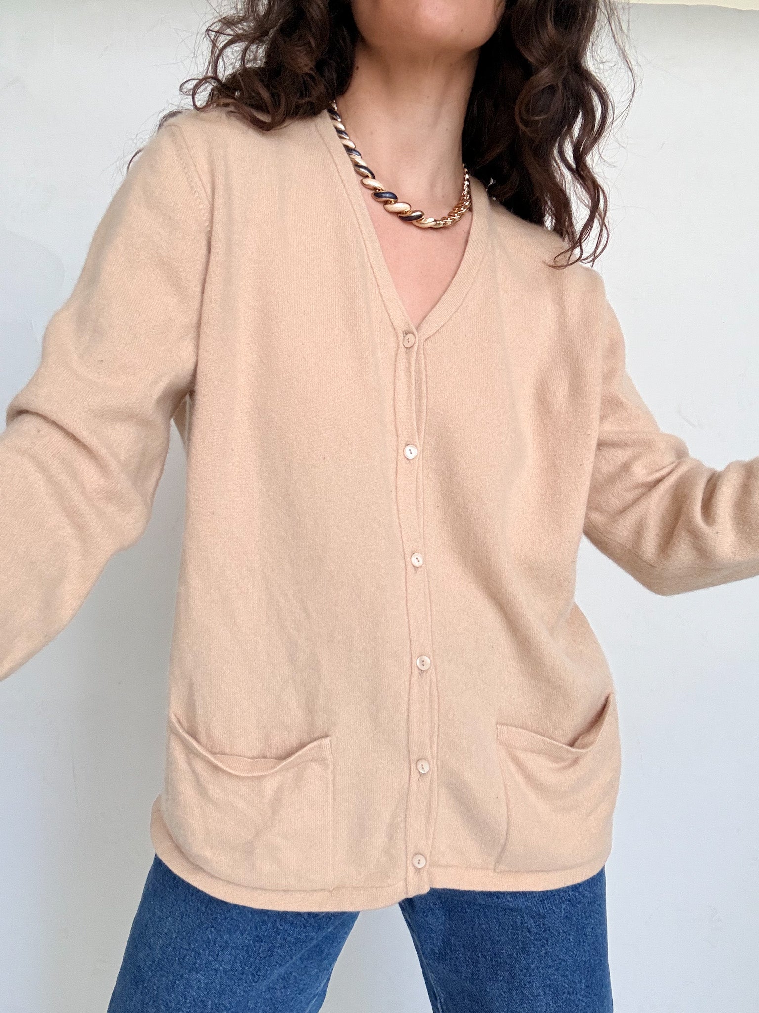 Chosen for its exceptional Scottish cashmere quality and its soft light beige tone, this vintage cardigan is the definition of an effortless essential. The knit feels incredibly smooth and refined, offering warmth without weight, while the clean cut and subtle pockets make it an easy everyday piece. Selected for its timeless simplicity, its versatility and its luxurious feel, it’s the kind of cardigan that works with absolutely everything.