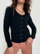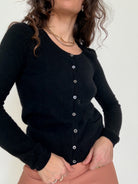 - Special features: Fine cashmere knit, classic round neckline, full button front, fitted and versatile silhouette, timeless black tone