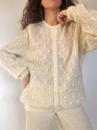 Selected for its beautiful mohair texture and refined craftsmanship, this vintage cardigan feels light, soft, and effortlessly elevated. The loose knit gives it that airy, delicate look, while the relaxed silhouette makes it easy to wear every day. Its subtle detailing and creamy tone bring a quiet sophistication — a simple piece with real quality behind it.