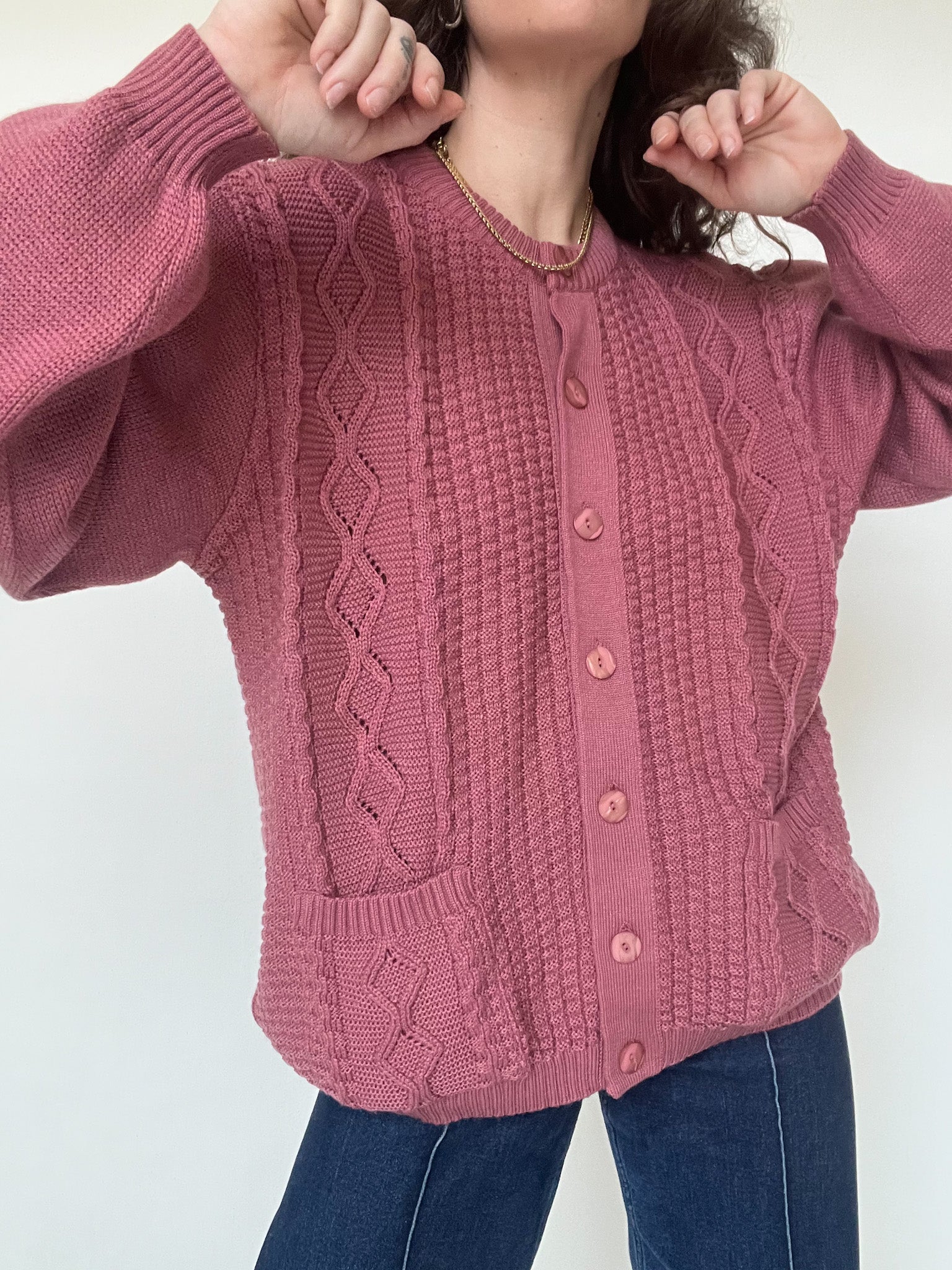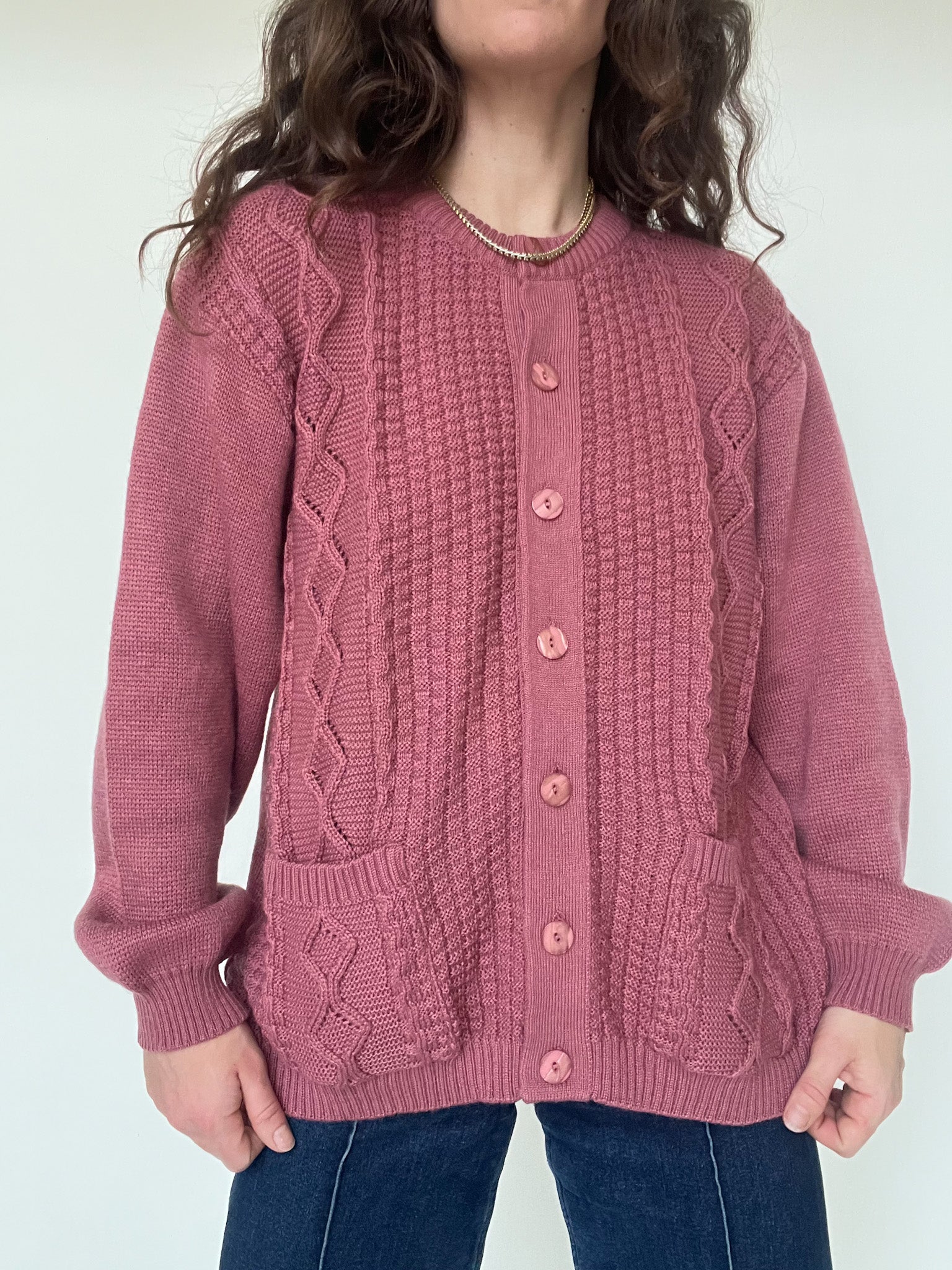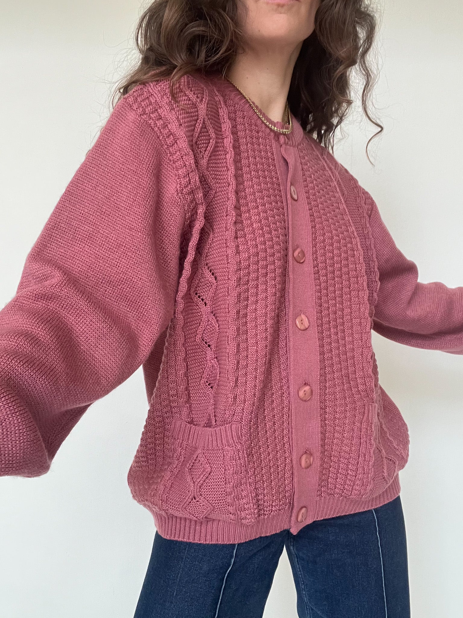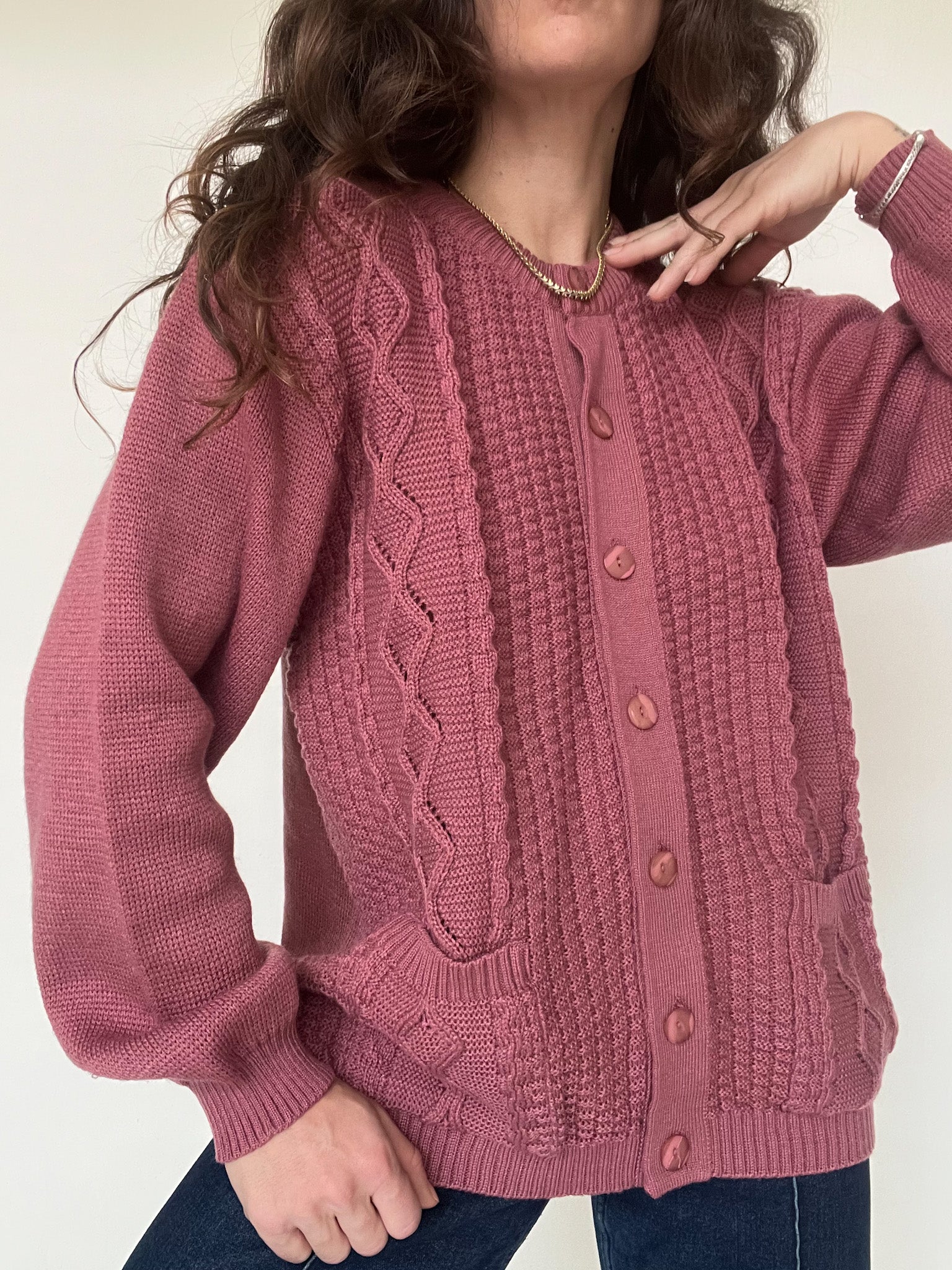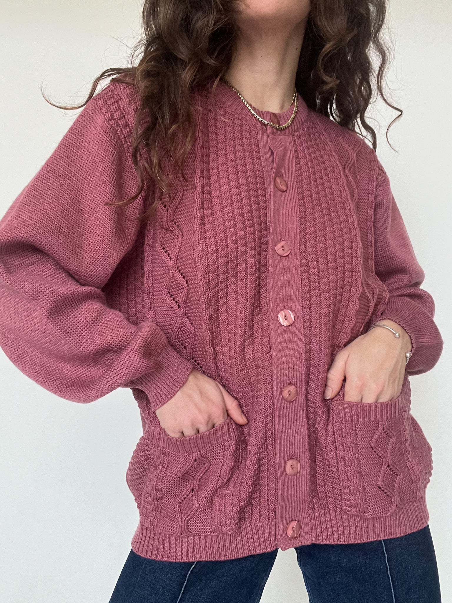 This vintage 90’s knit piece stands out with its deep plum shade and beautifully textured stitches. The knit is soft, flexible, and comfortable, offering an effortless silhouette that feels as good as it looks. The buttoned front and detailed knit panels add character without overdoing it, making it an easy everyday piece with a strong vintage identity. A timeless pullover-style cardigan that brings warmth, depth, and subtle confidence to any wardrobe.