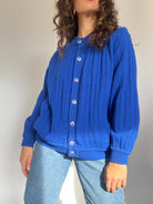 A timeless piece with a striking blue hue, this vintage cable knit cardigan embodies effortless sophistication. The textured cable knit pattern adds depth to its classic silhouette, while the tonal buttons enhance its refined aesthetic. Designed for both comfort and style, this cardigan is the perfect layering piece for any season.