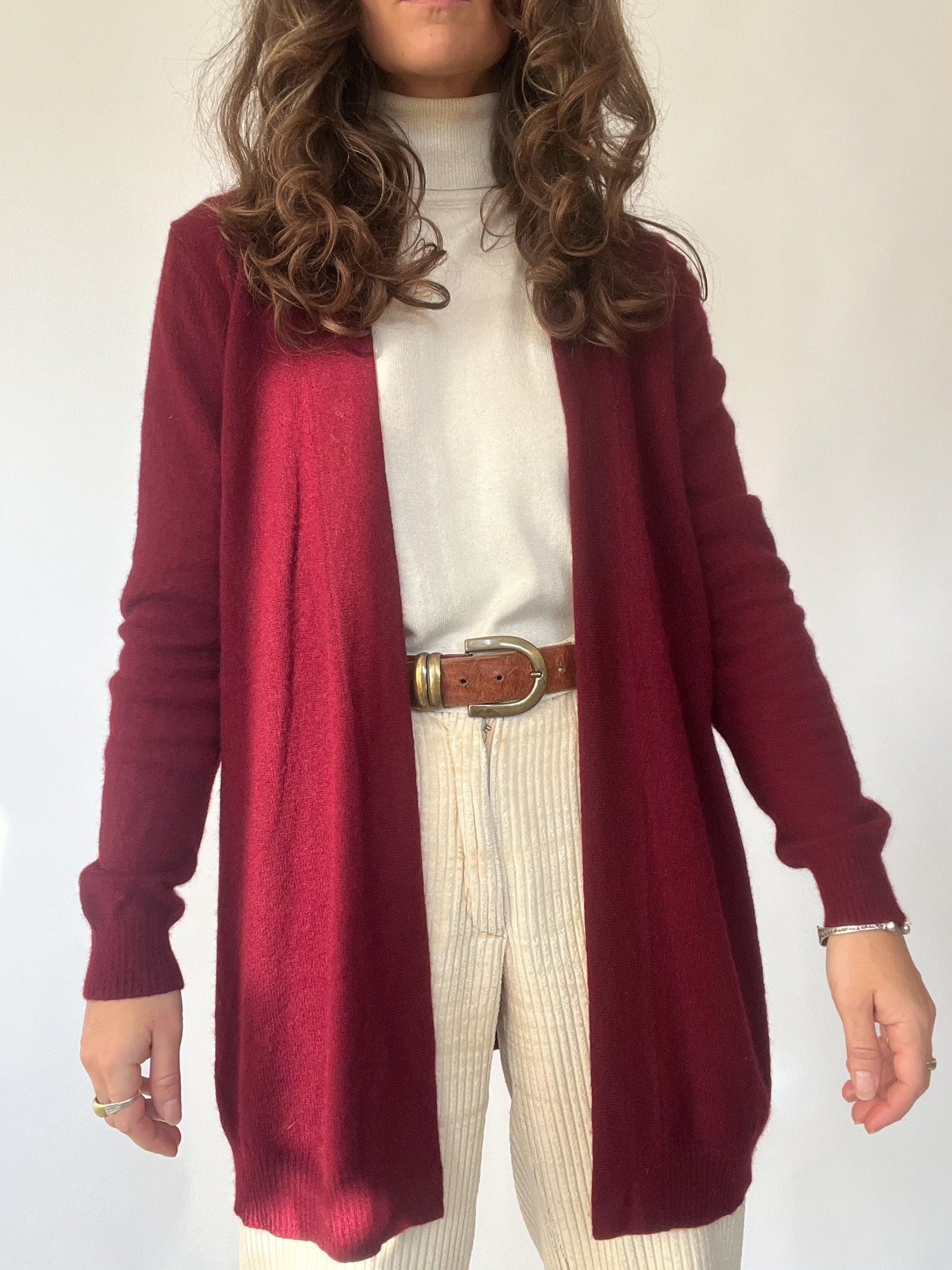 Wrap yourself in luxury with this vintage burgundy cashmere cardigan. The open-front design and longline cut offer a relaxed, elegant silhouette, perfect for layering over any outfit. Its deep burgundy hue adds warmth and sophistication to your wardrobe, while the cashmere fabric ensures ultimate comfort.