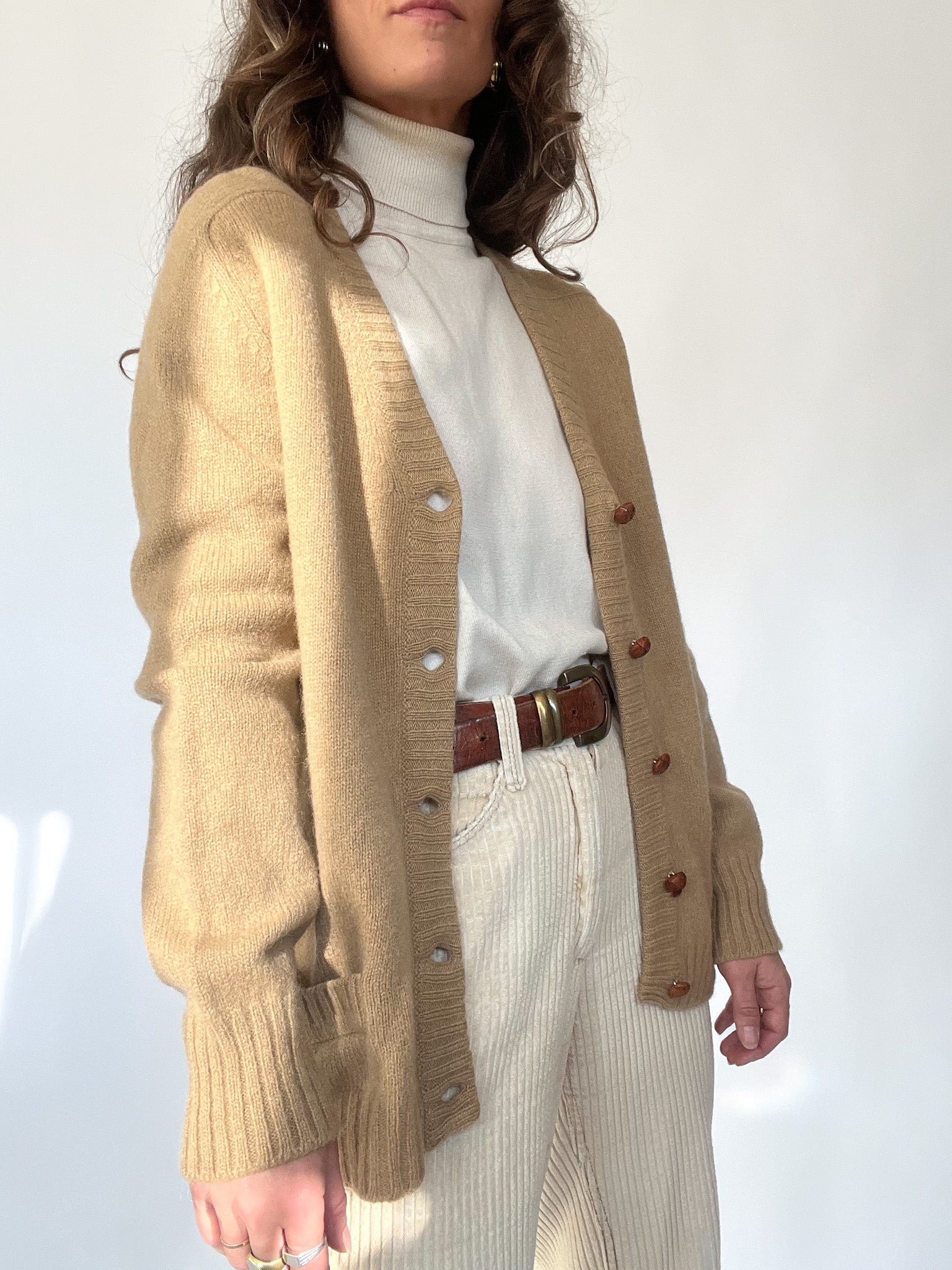 This vintage camel wool cardigan made in France brings a touch of timeless elegance to any outfit. Its warm camel hue and cozy wool texture make it an ideal layering piece for colder days. With classic button-front detailing and ribbed edges, it exudes a refined, understated charm.