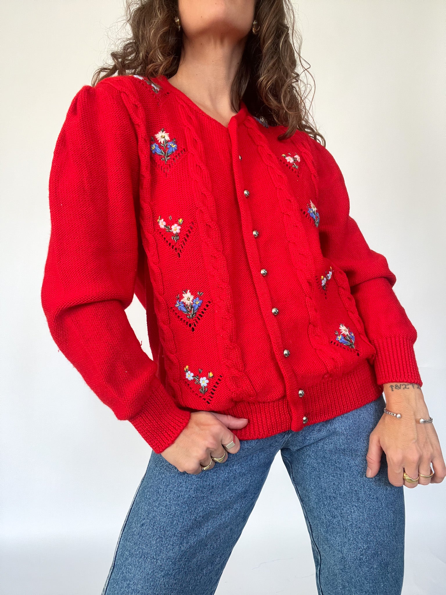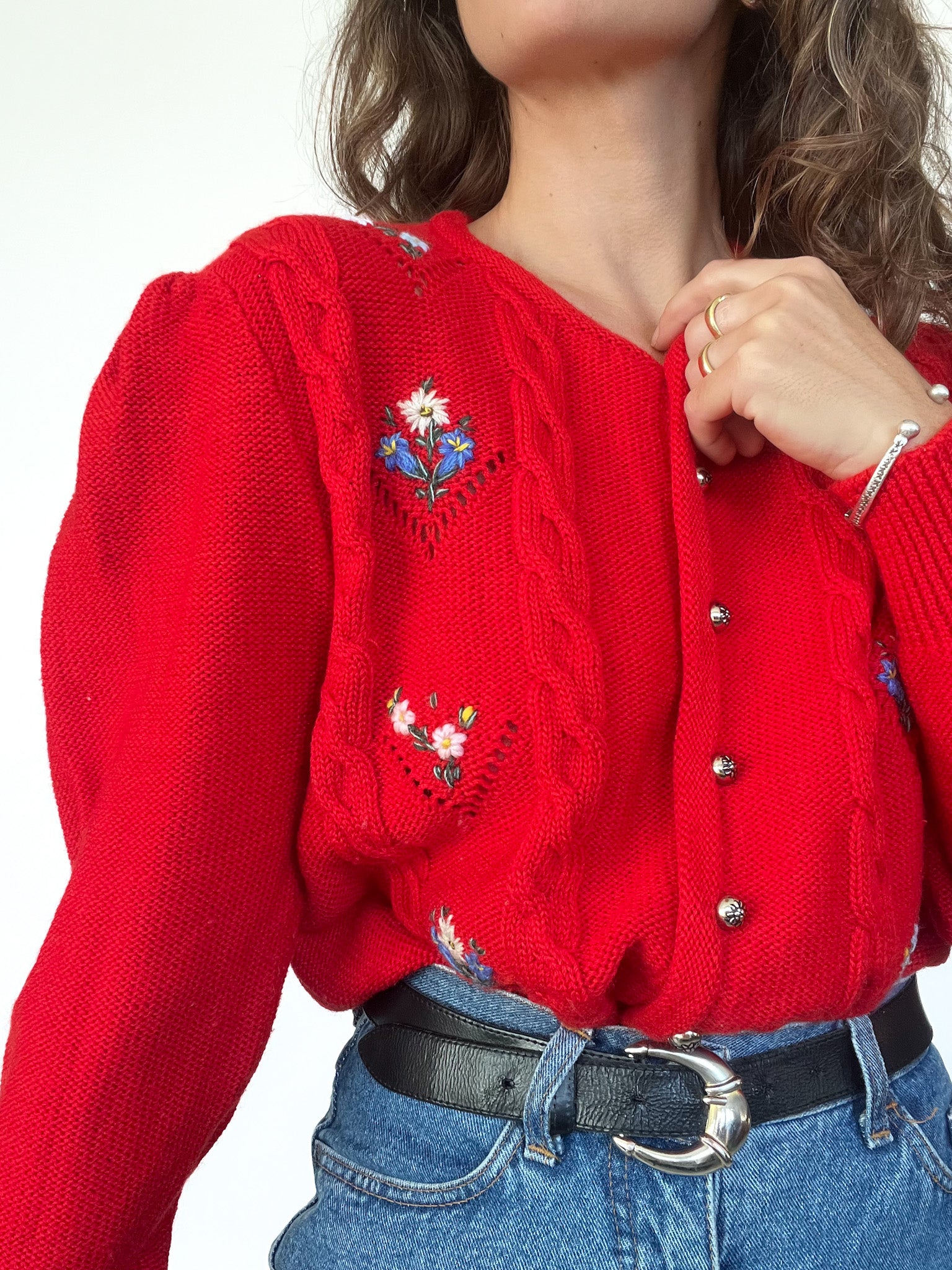 Add a pop of color to your wardrobe with this charming vintage knit cardigan in vibrant red. This piece features delicate floral embroidery that enhances its nostalgic charm, while the cable knit design adds a cozy texture. The puffed sleeves bring a feminine touch, and the small silver-tone buttons complete its vintage appeal. Perfect for layering over a blouse or pairing with high-waisted jeans for an effortlessly chic look.