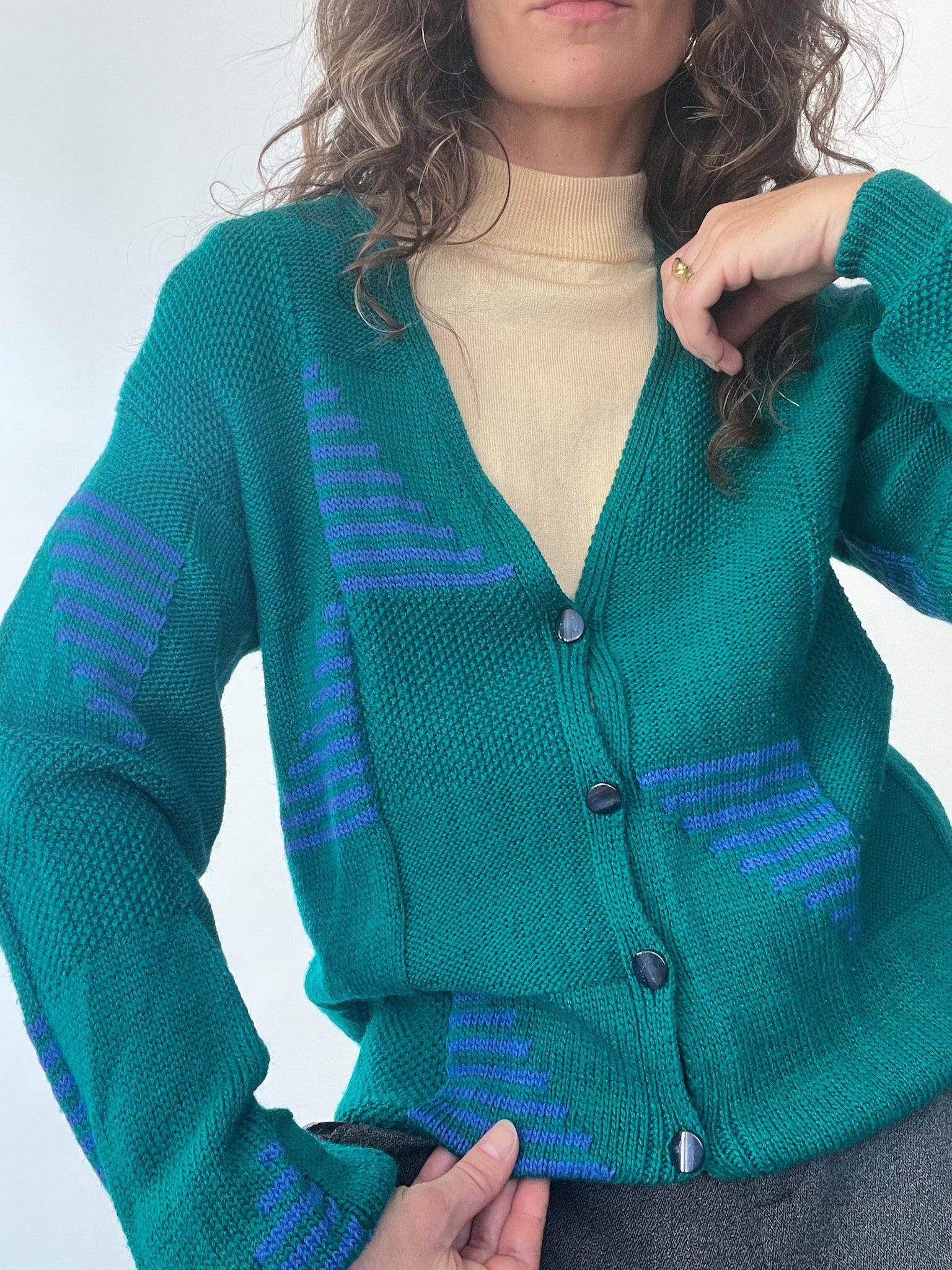 A bold and playful vintage cardigan featuring vibrant green tones accented with striking purple geometric patterns. The cropped silhouette and V-neckline add a modern twist to this retro-inspired piece.