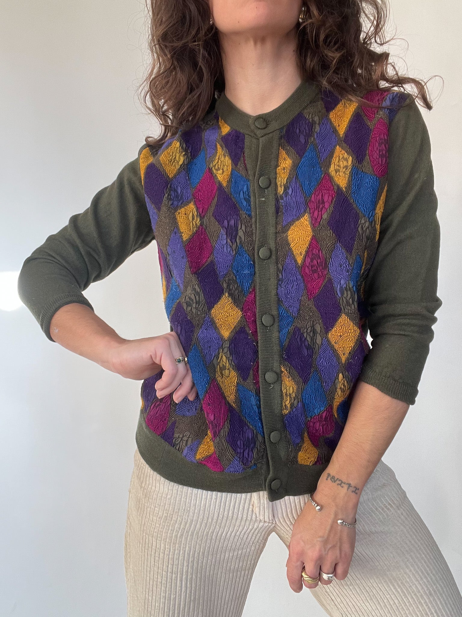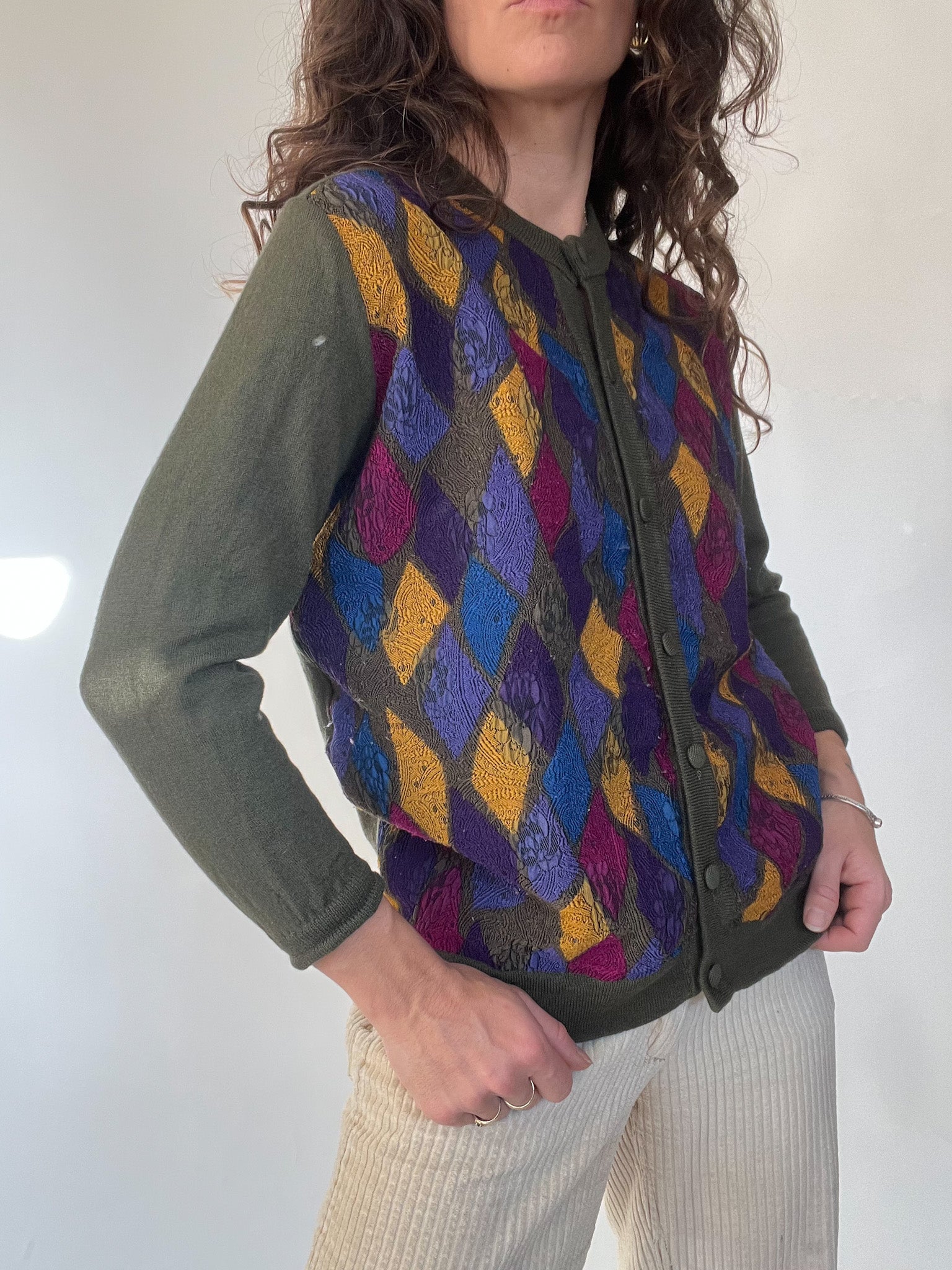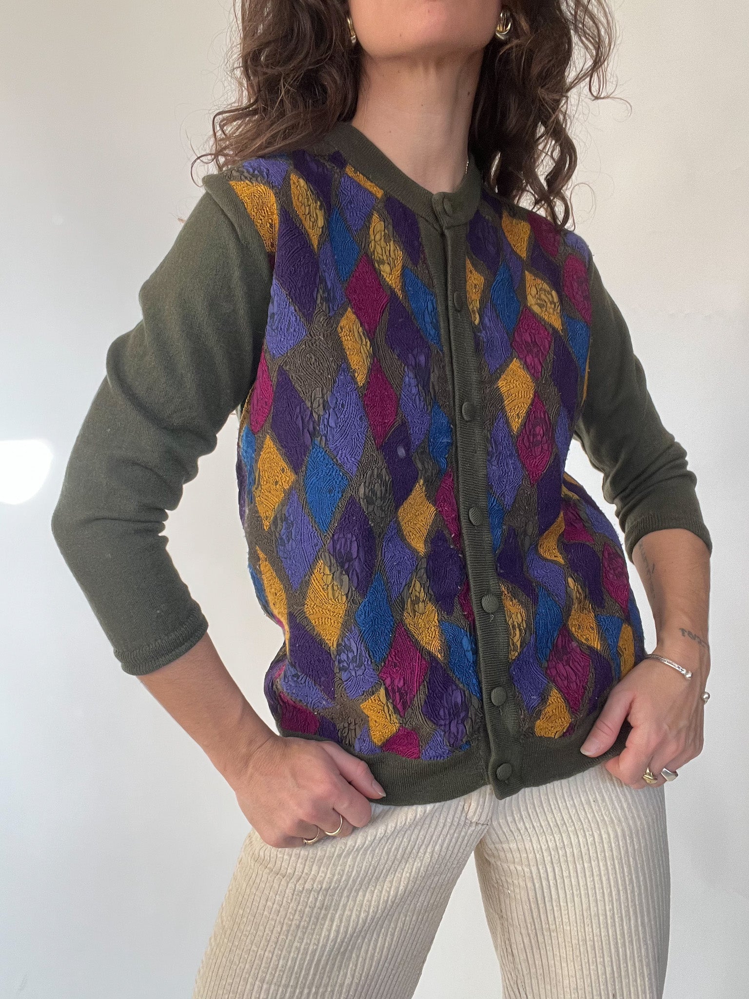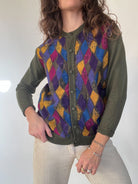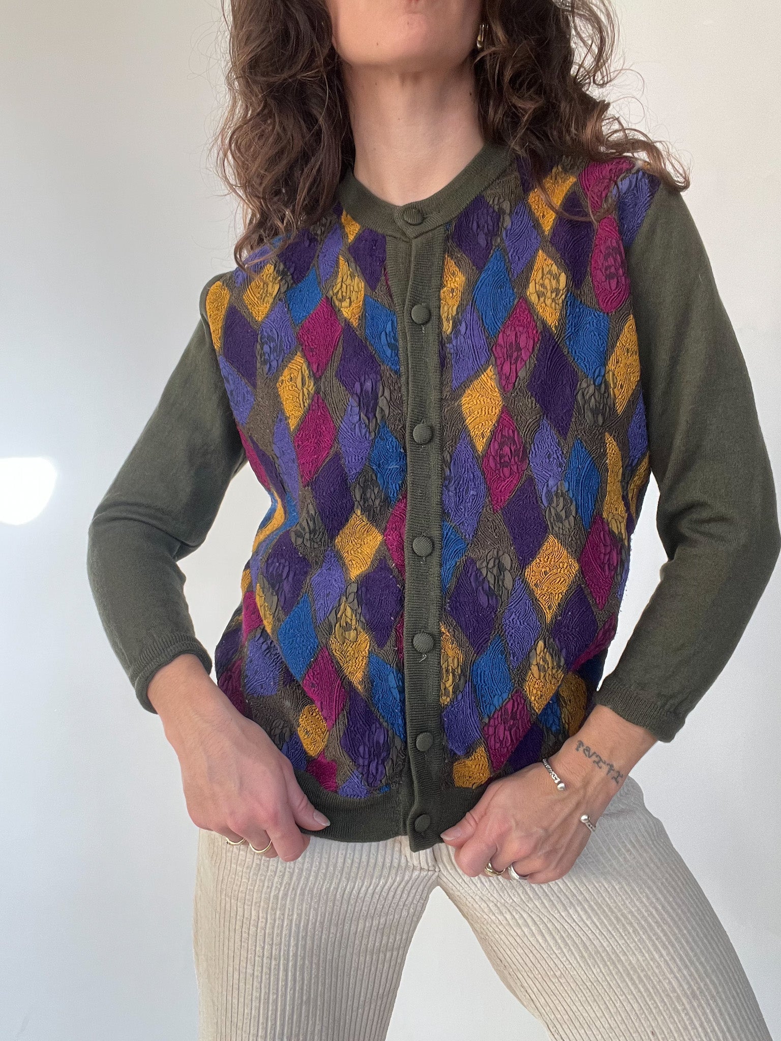 A vibrant cardigan with an irresistible mix of colours — chosen for its incredible harlequin front panel where yellow, violet, rose and blue stand out beautifully against the deep khaki knit. A statement piece that brings a touch of playful elegance to any winter look while staying soft, warm and easy to style.