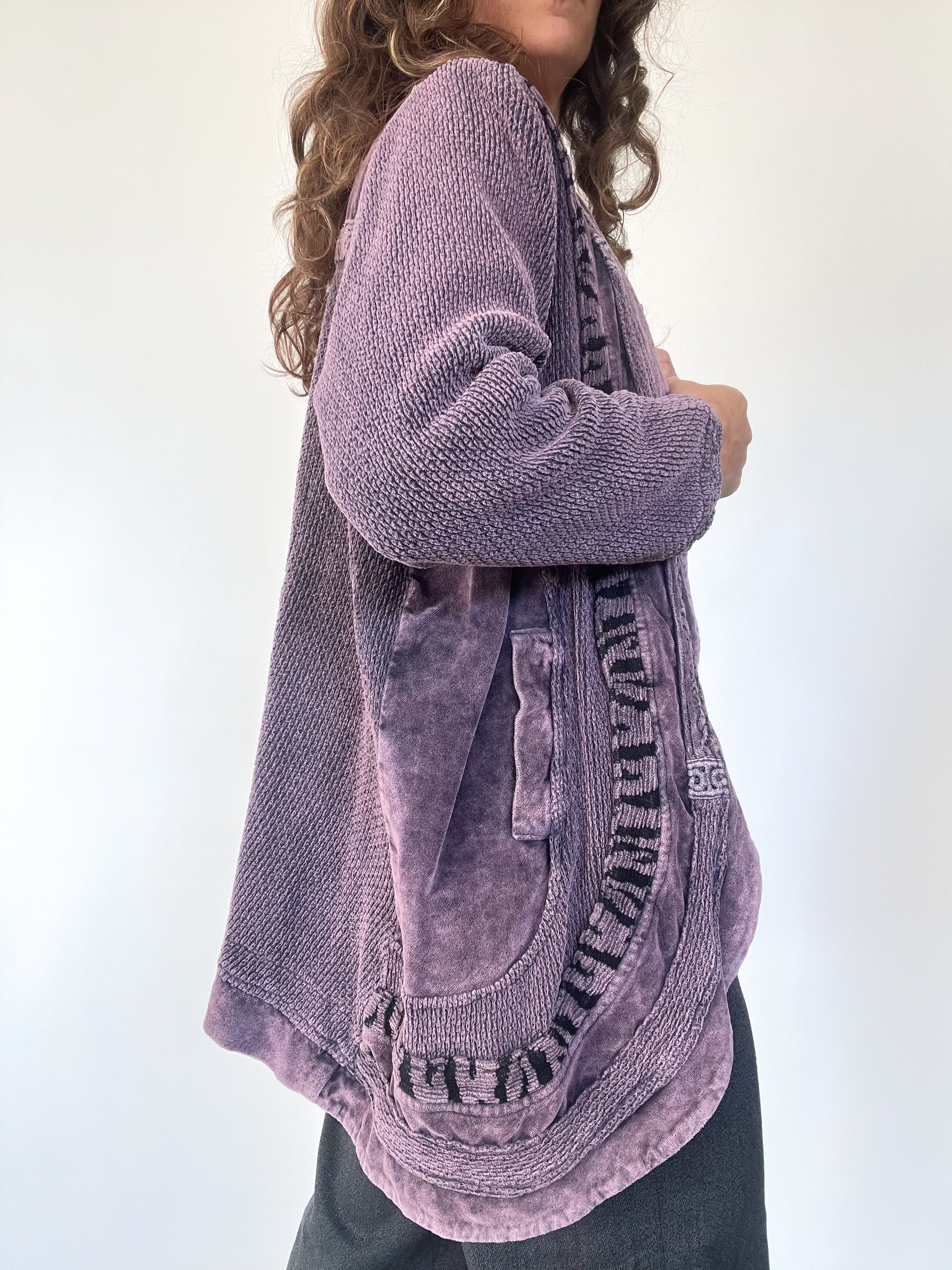 Embrace a touch of bohemian charm with this vintage lilac cardigan made in Italy. Crafted in a unique blend of textures, this cardigan showcases intricate knit patterns combined with soft, velvety details along the collar and front. Perfect for layering, it adds a subtle color and rich texture to any outfit, ideal for cooler days or cozy evenings.