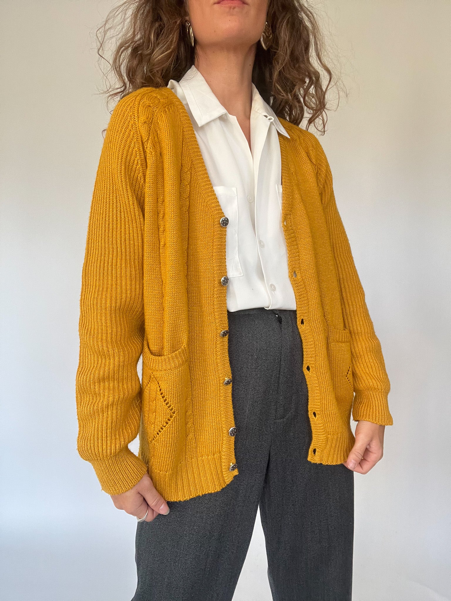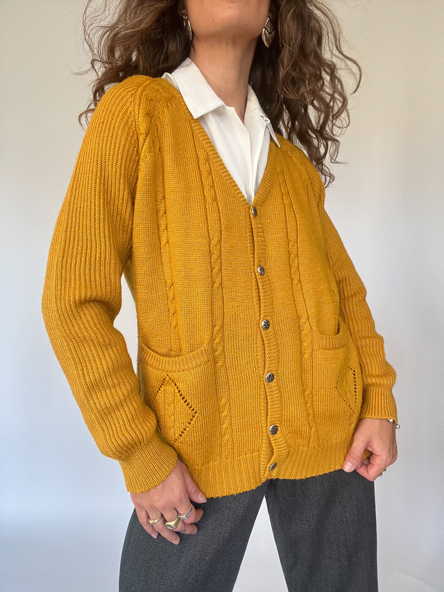 This vintage mustard yellow cardigan is a cozy and vibrant addition to your wardrobe. Featuring classic cable-knit details and deep front pockets, it combines comfort with a touch of retro charm. Perfect for layering over blouses or t-shirts, it adds warmth and a pop of color to any outfit. Whether you’re at home or out and about, this cardigan is a must-have for those who appreciate timeless, cheerful style.