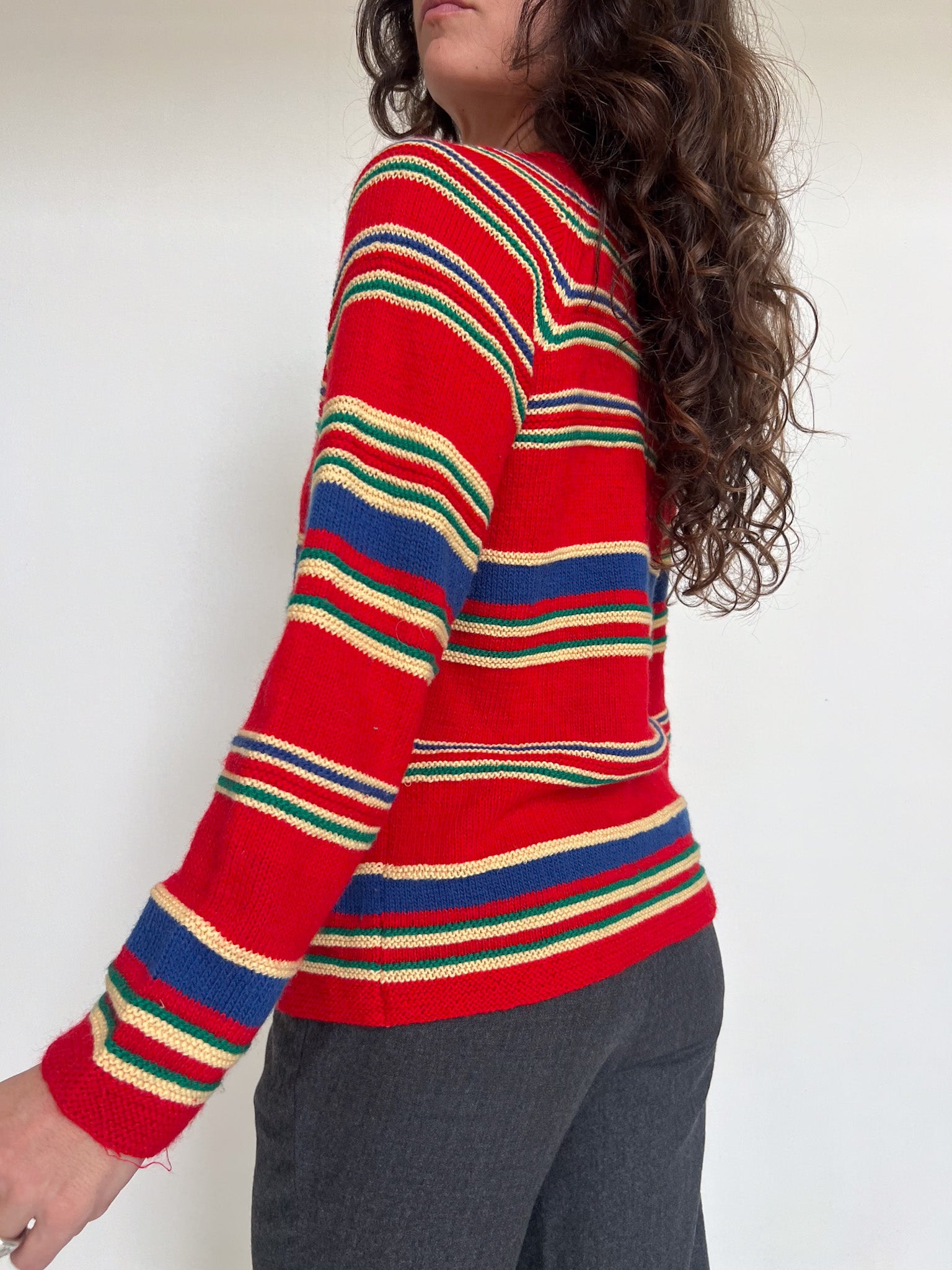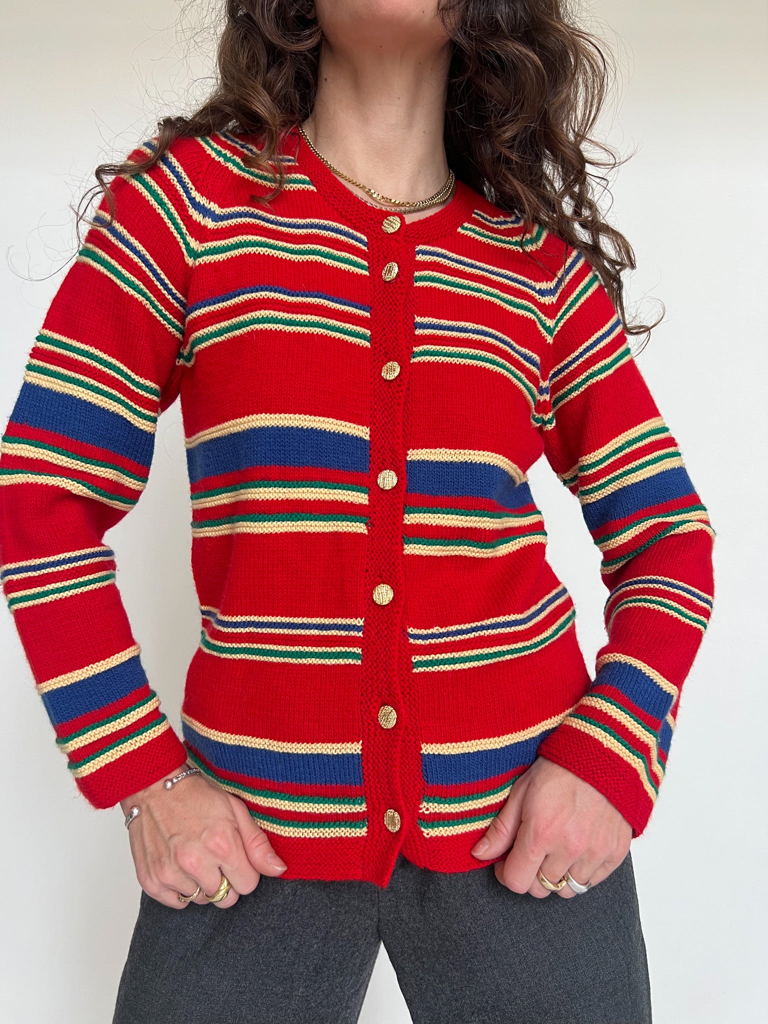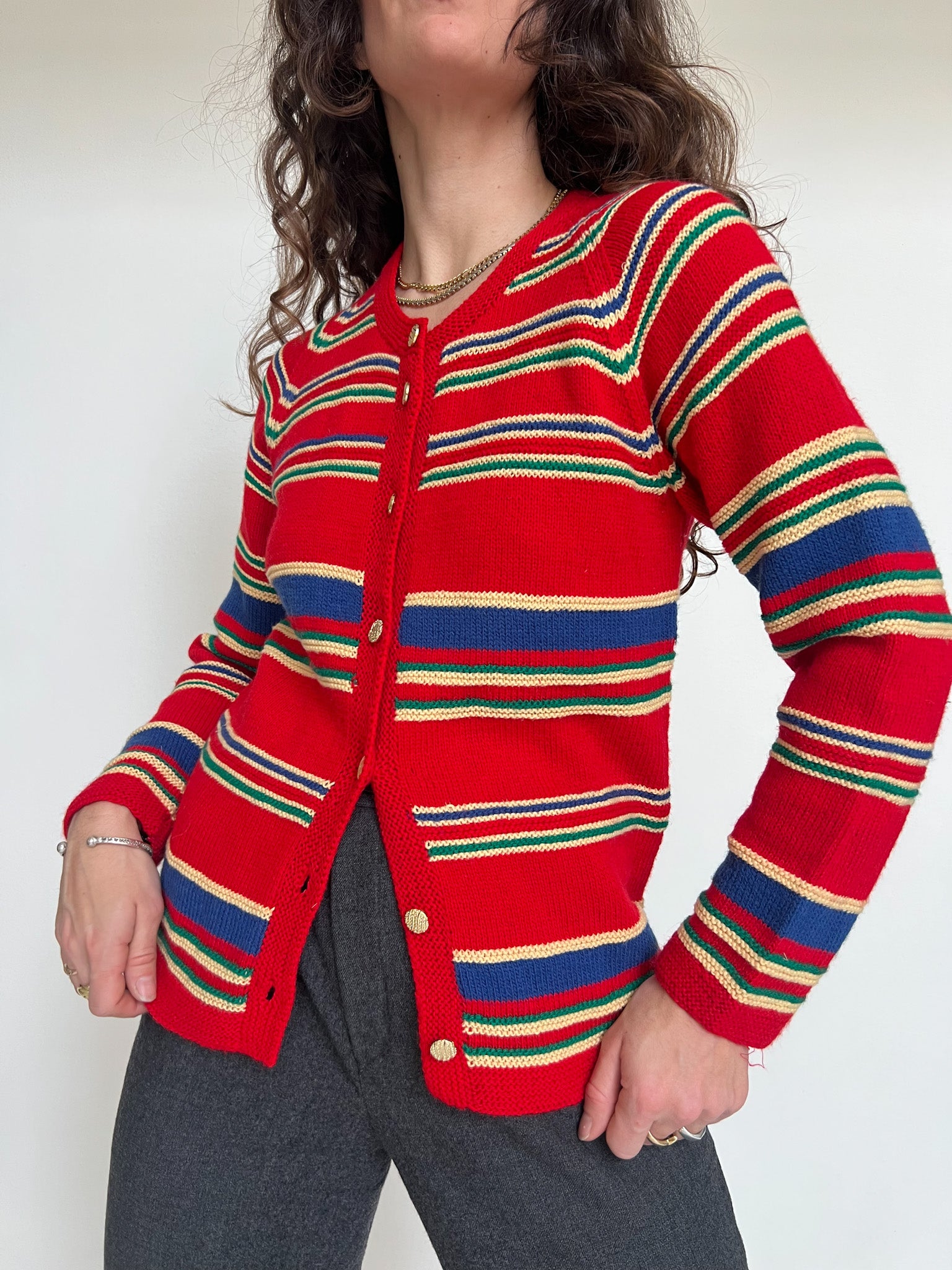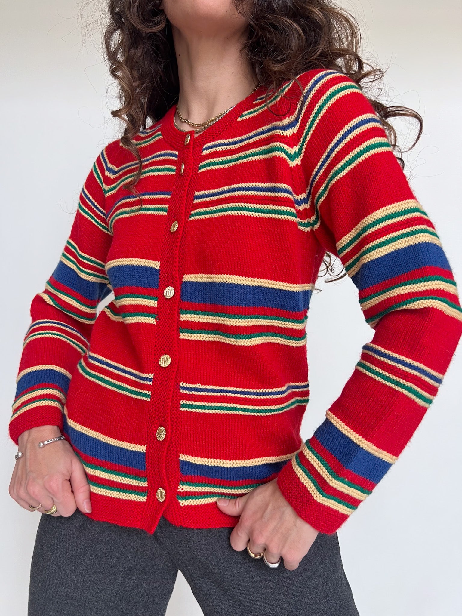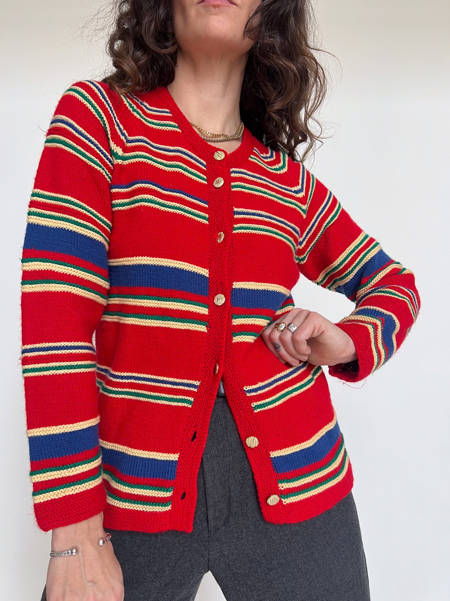 Chosen for its vibrant red base enhanced by multicolour stripes and beautiful gold-toned buttons. The knit feels truly special, with a character that strongly suggests a handmade piece, rich in texture and personality. A standout vintage cardigan that brings warmth, colour and authenticity to any silhouette.