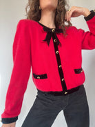 This striking red cardigan made in Italy exudes elegance with its plush velvet trim and gold-embossed buttons. A charming black velvet bow at the neckline adds a touch of femininity, while velvet-lined pockets and cuffs elevate the piece’s sophistication. The bold color combined with delicate detailing makes it a unique choice for anyone looking to make a refined statement.