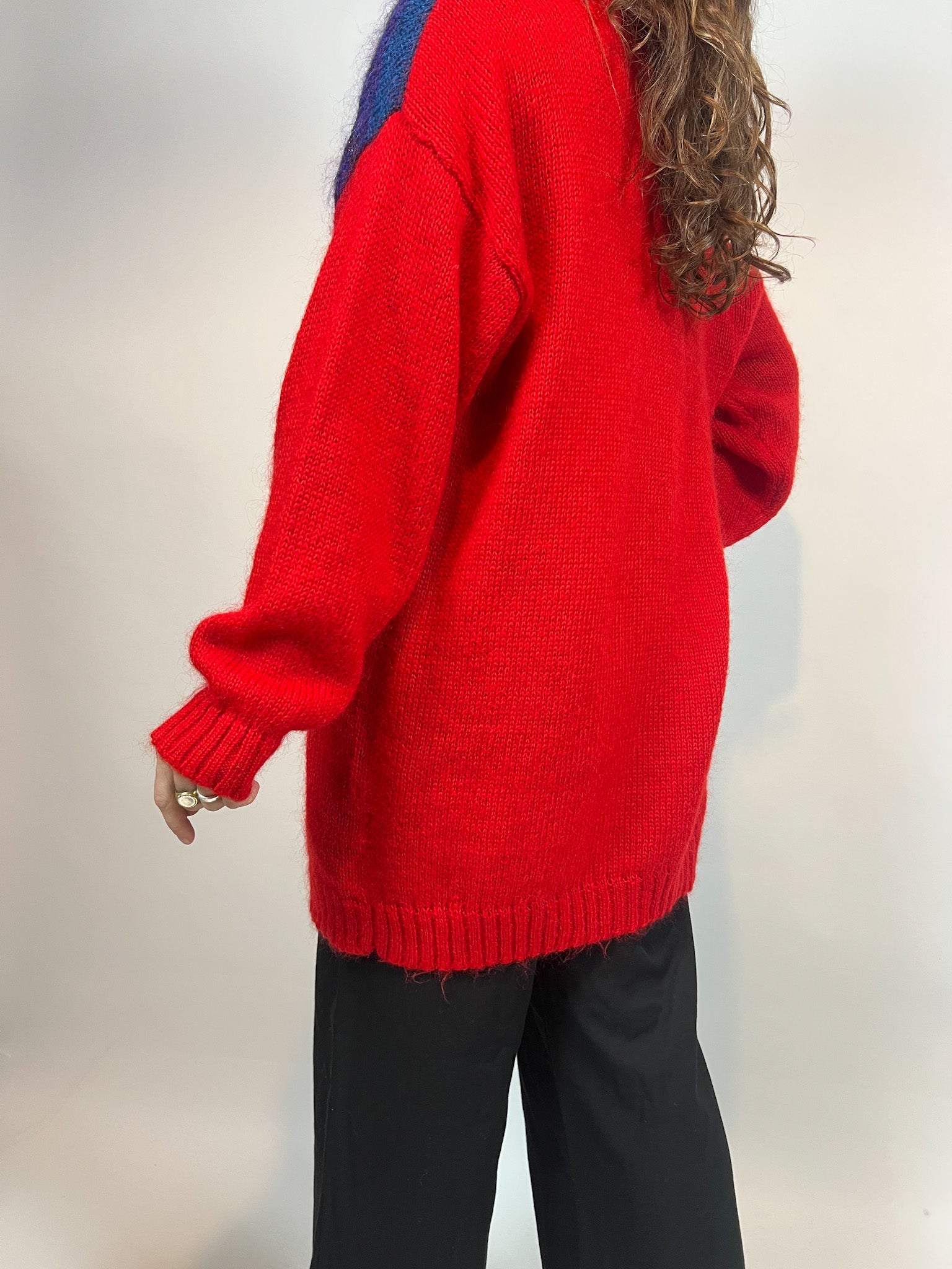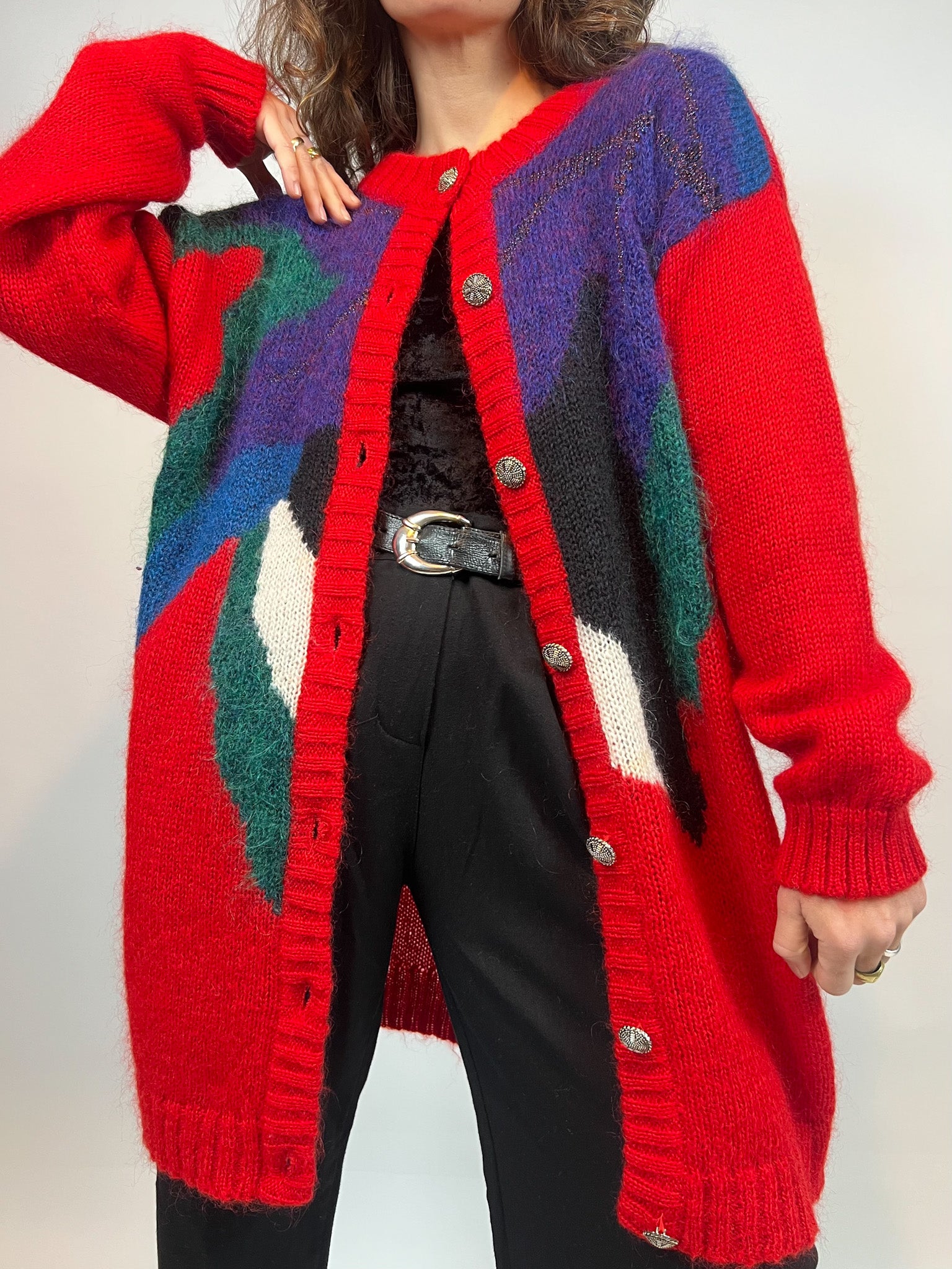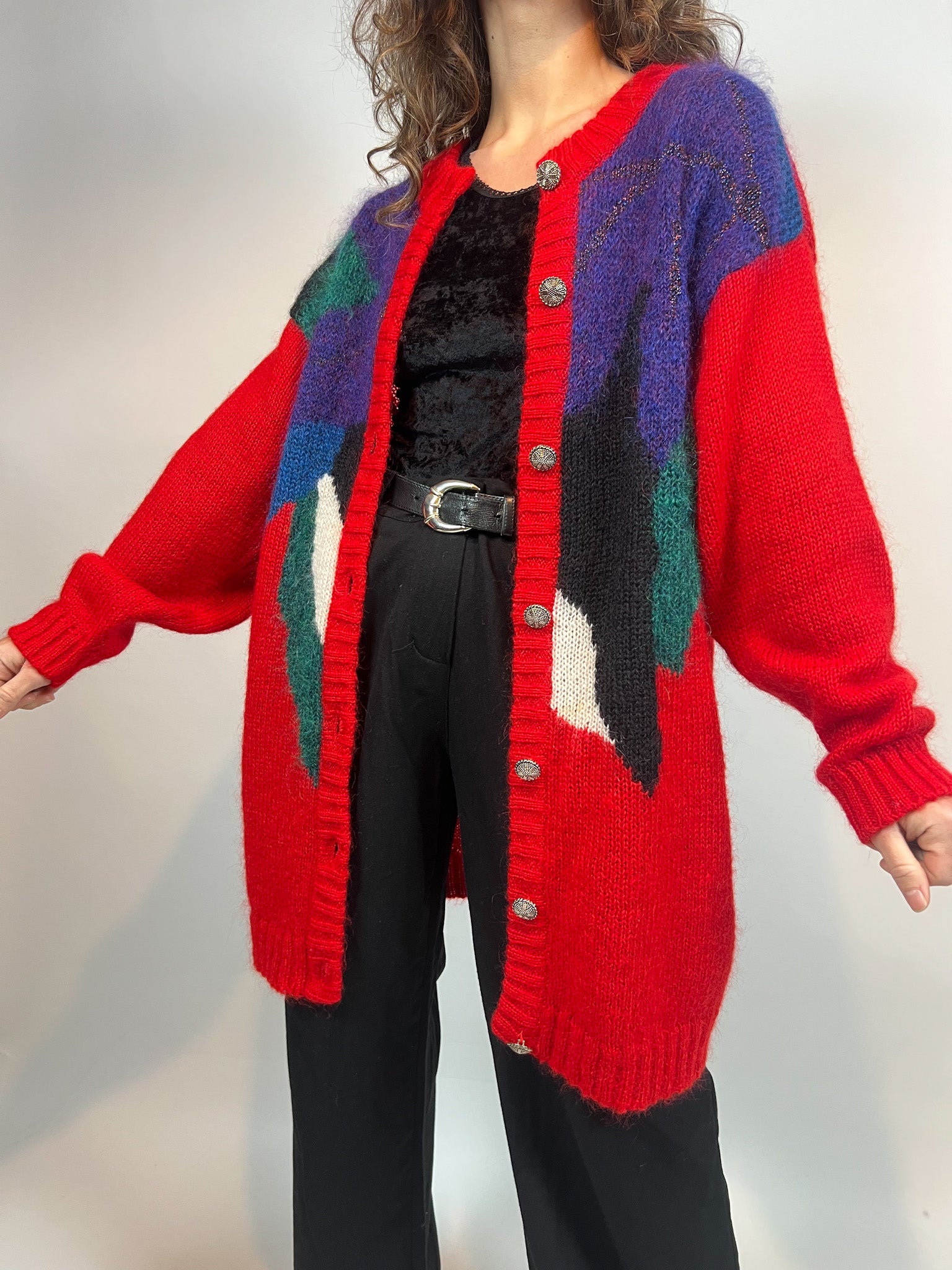 This vintage red wool cardigan features an eye-catching abstract color block design with bold shades of blue, green, black, and white. The cozy knit fabric offers warmth and style, while the relaxed silhouette ensures comfort. Completed with metallic silver buttons and ribbed trims, this statement cardigan adds a touch of retro flair to any wardrobe. Perfect for layering over a turtleneck or pairing with trousers for a casual yet bold look.