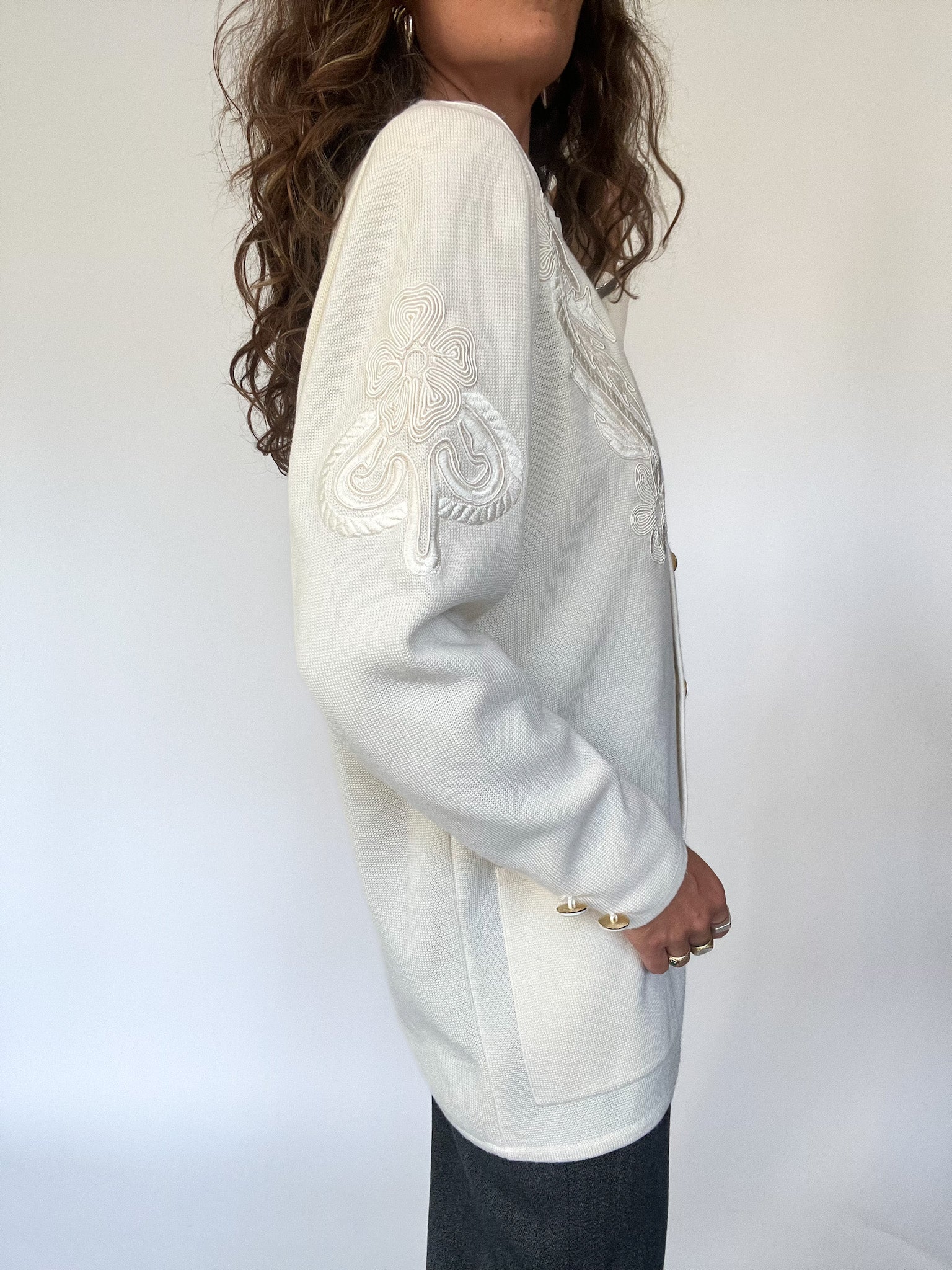 This vintage white cardigan is a beautiful blend of elegance and artistry. Featuring intricate embroidery on the shoulders and sleeves, it adds a touch of sophistication to any outfit. The structured fit and unique button details make it perfect for both formal occasions and elevating your everyday style. Pair it with tailored trousers for a polished look or over jeans for a chic, laid-back vibe. A timeless piece that exudes grace and charm.