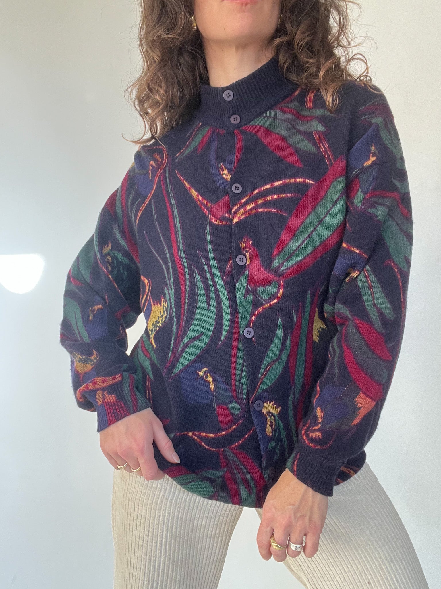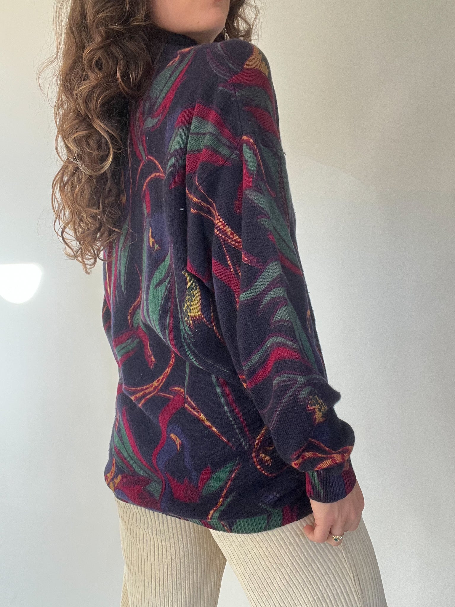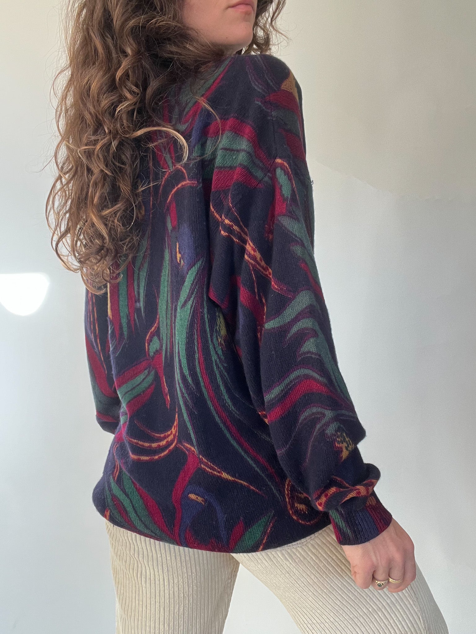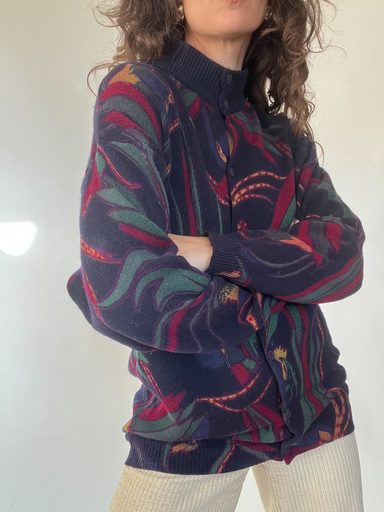 A standout vintage knit chosen for its bold design and beautifully structured high collar with full button detailing. The mix of deep tones and the dynamic pattern bring a unique, artistic touch to winter looks. Soft, warm, and slightly oversized, it’s the kind of expressive piece that carries personality effortlessly — exactly the type of knit that makes building a vintage-inspired outfit feel intuitive.