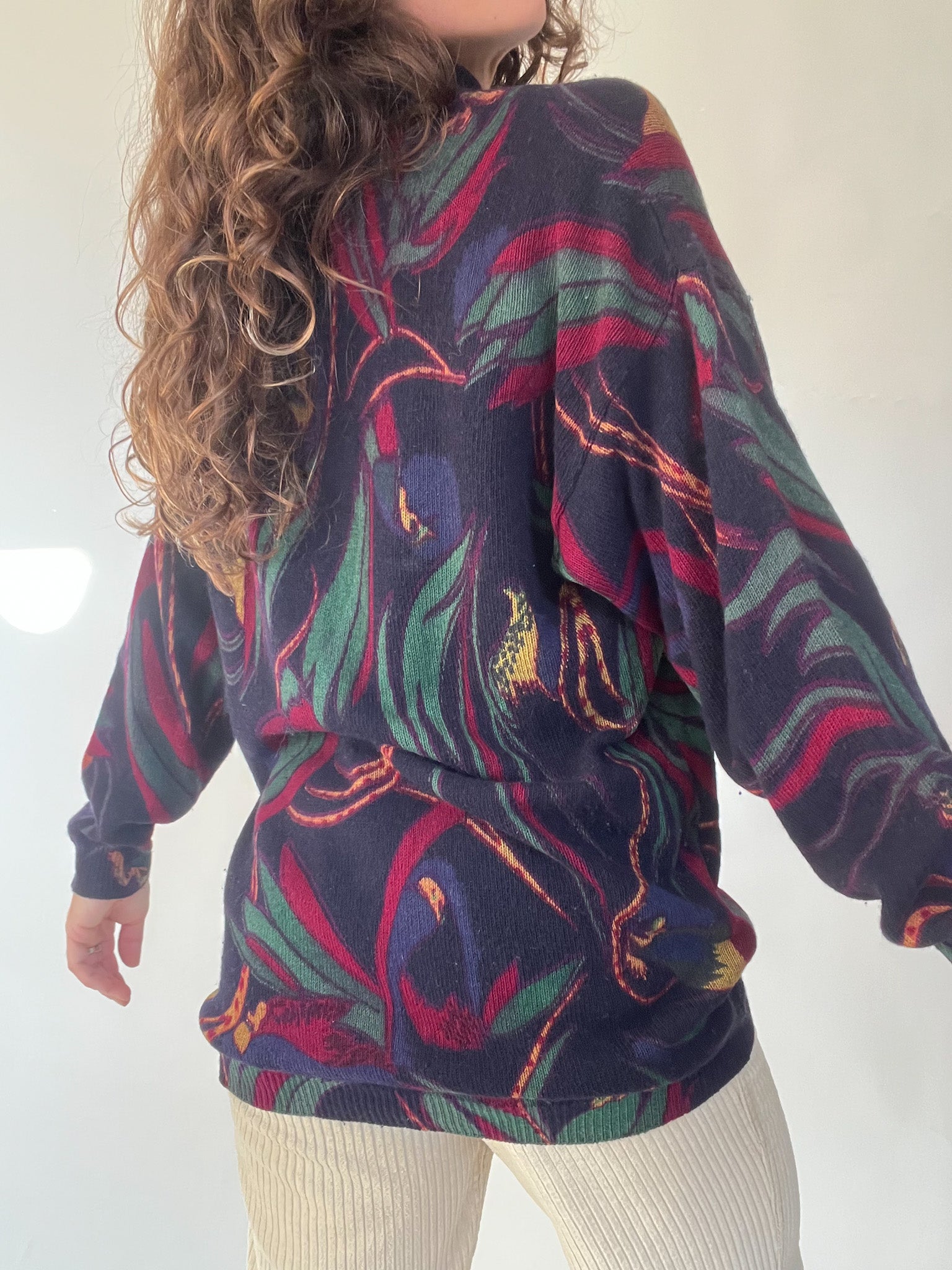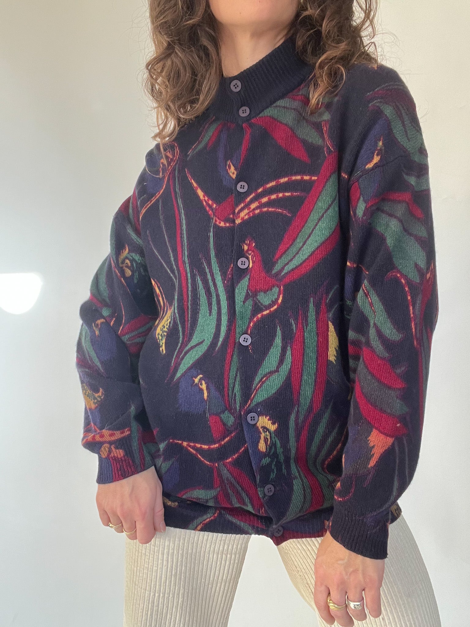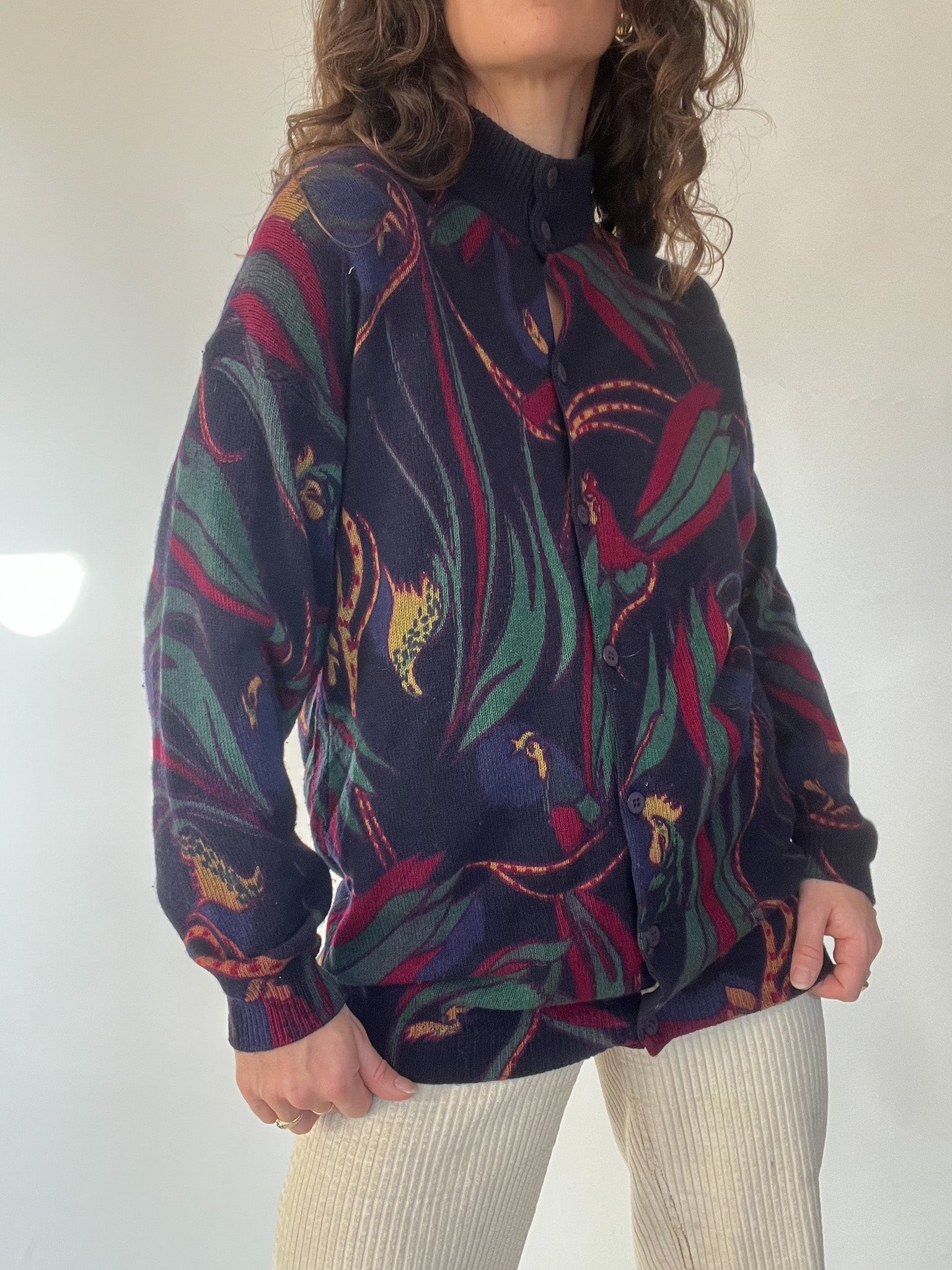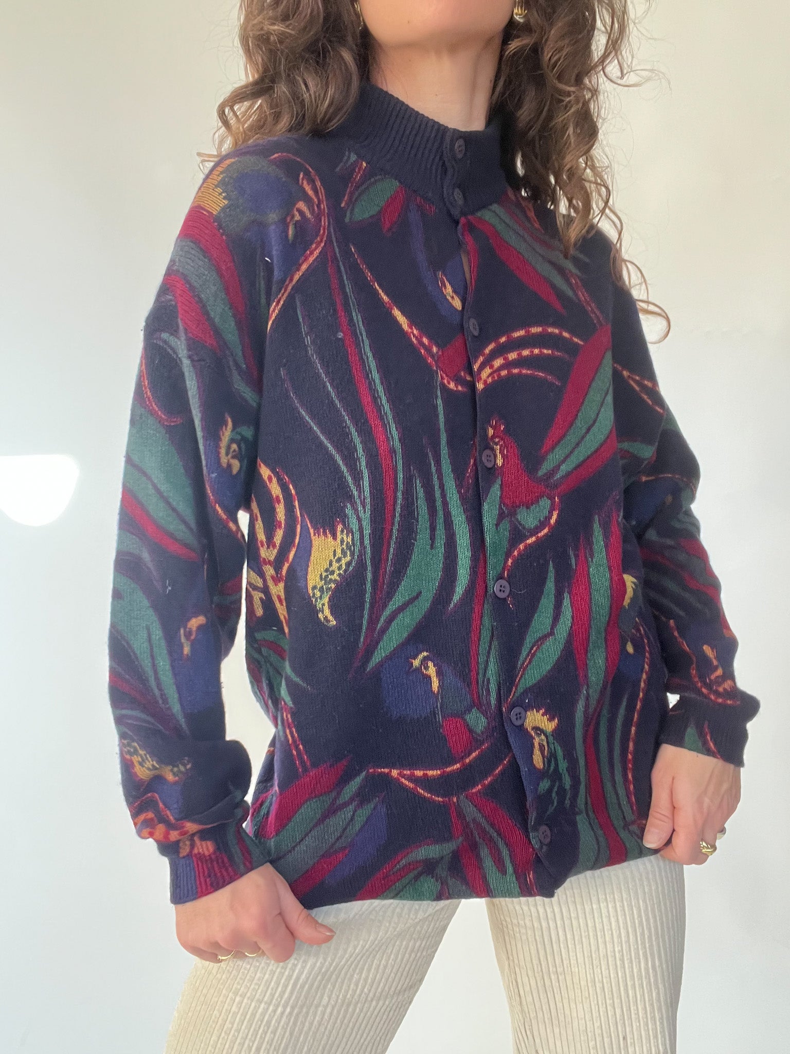 A standout vintage knit chosen for its bold design and beautifully structured high collar with full button detailing. The mix of deep tones and the dynamic pattern bring a unique, artistic touch to winter looks. Soft, warm, and slightly oversized, it’s the kind of expressive piece that carries personality effortlessly — exactly the type of knit that makes building a vintage-inspired outfit feel intuitive.
