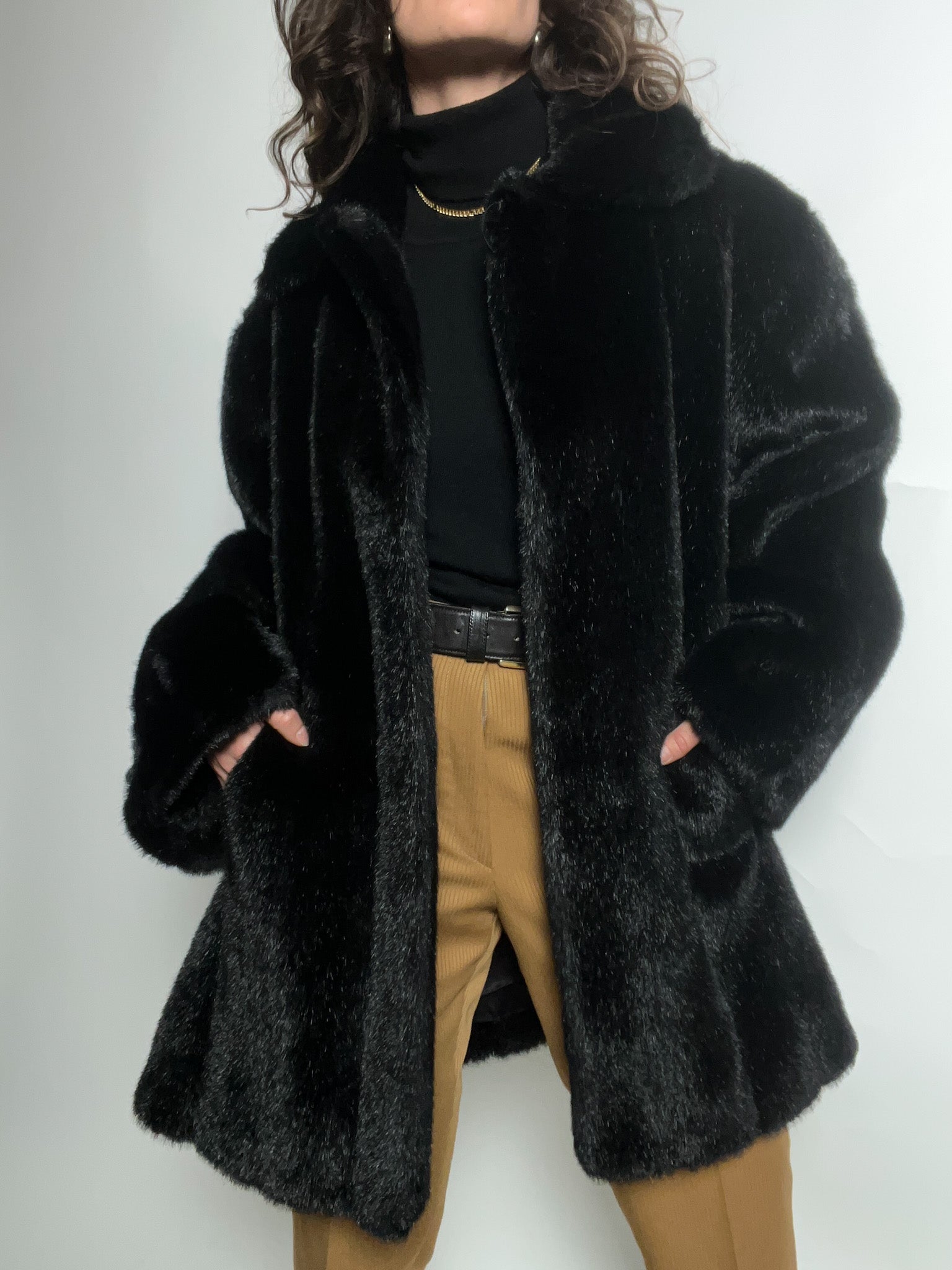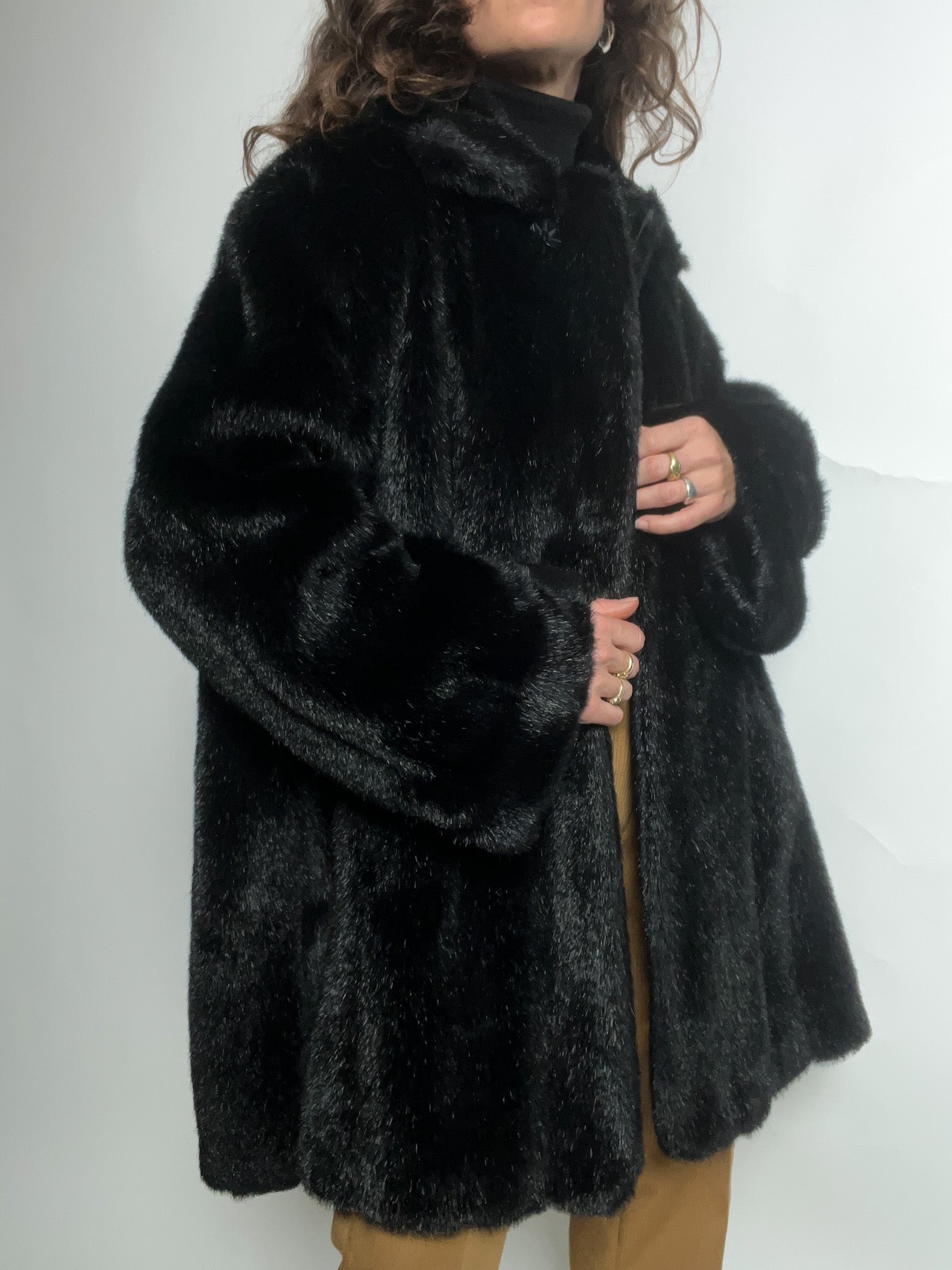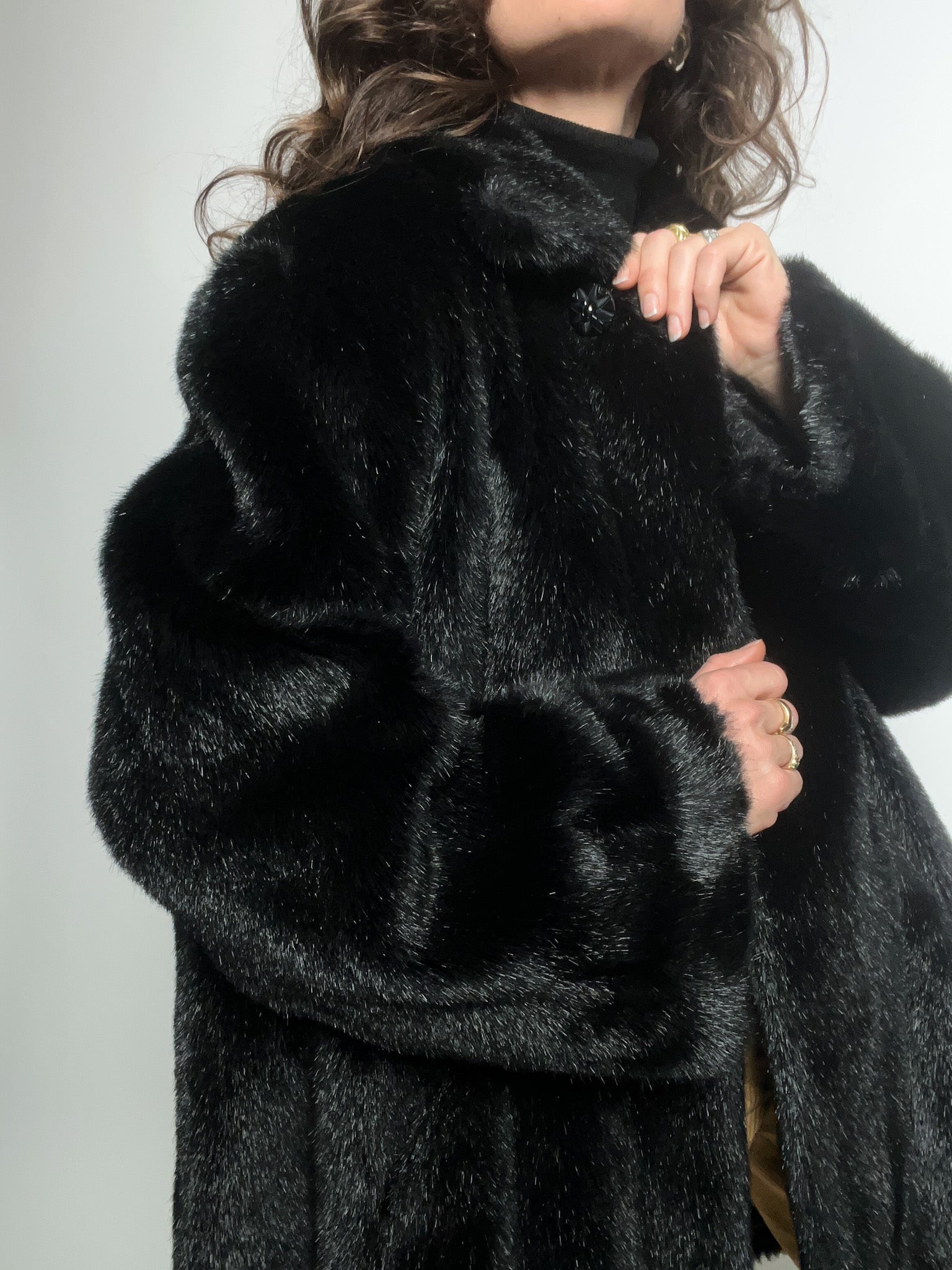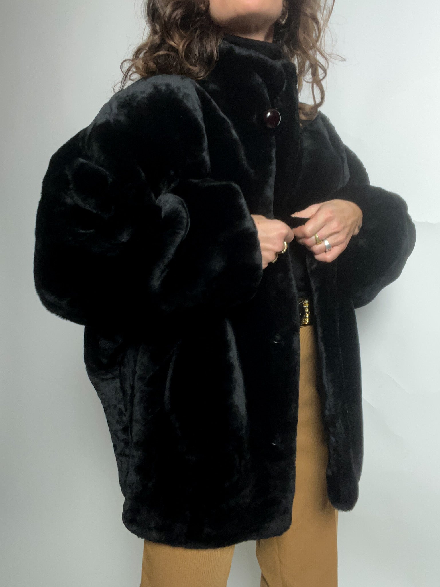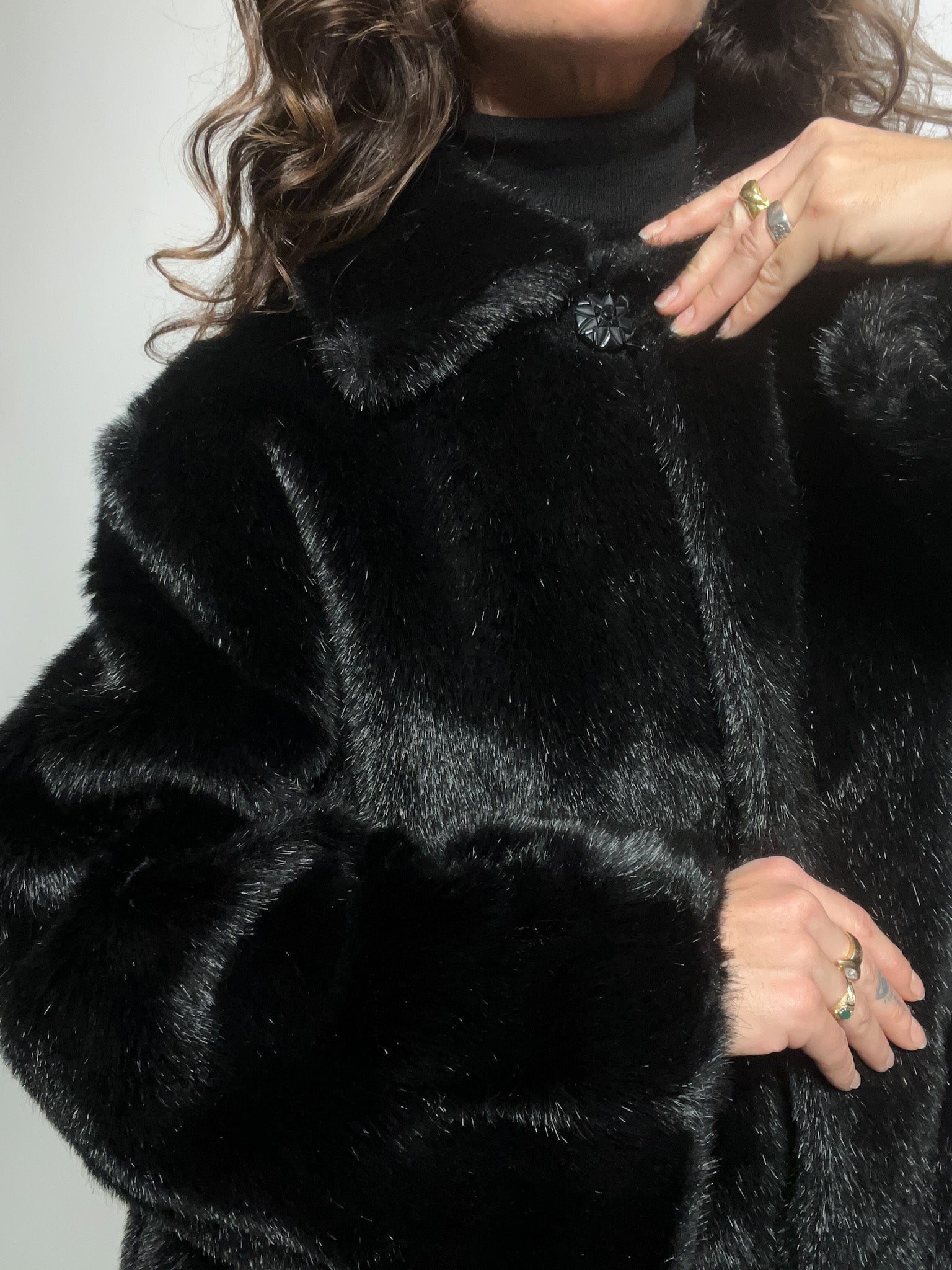 Vintage 90’s Black Glossy Faux Fur Coat with Star-Engraved Buttons
