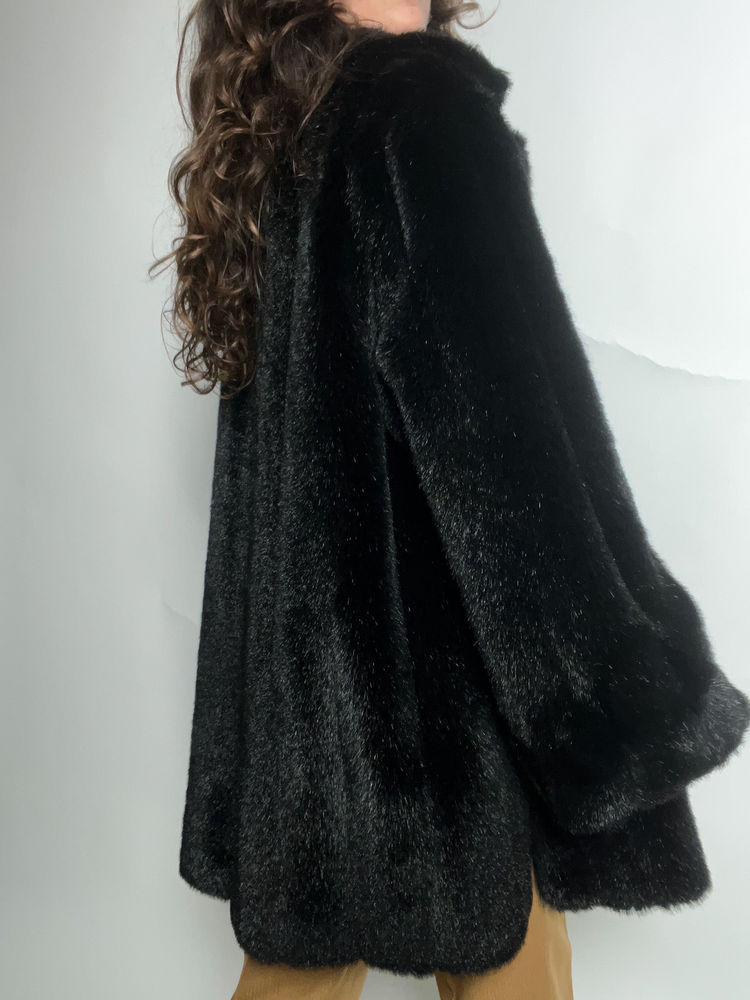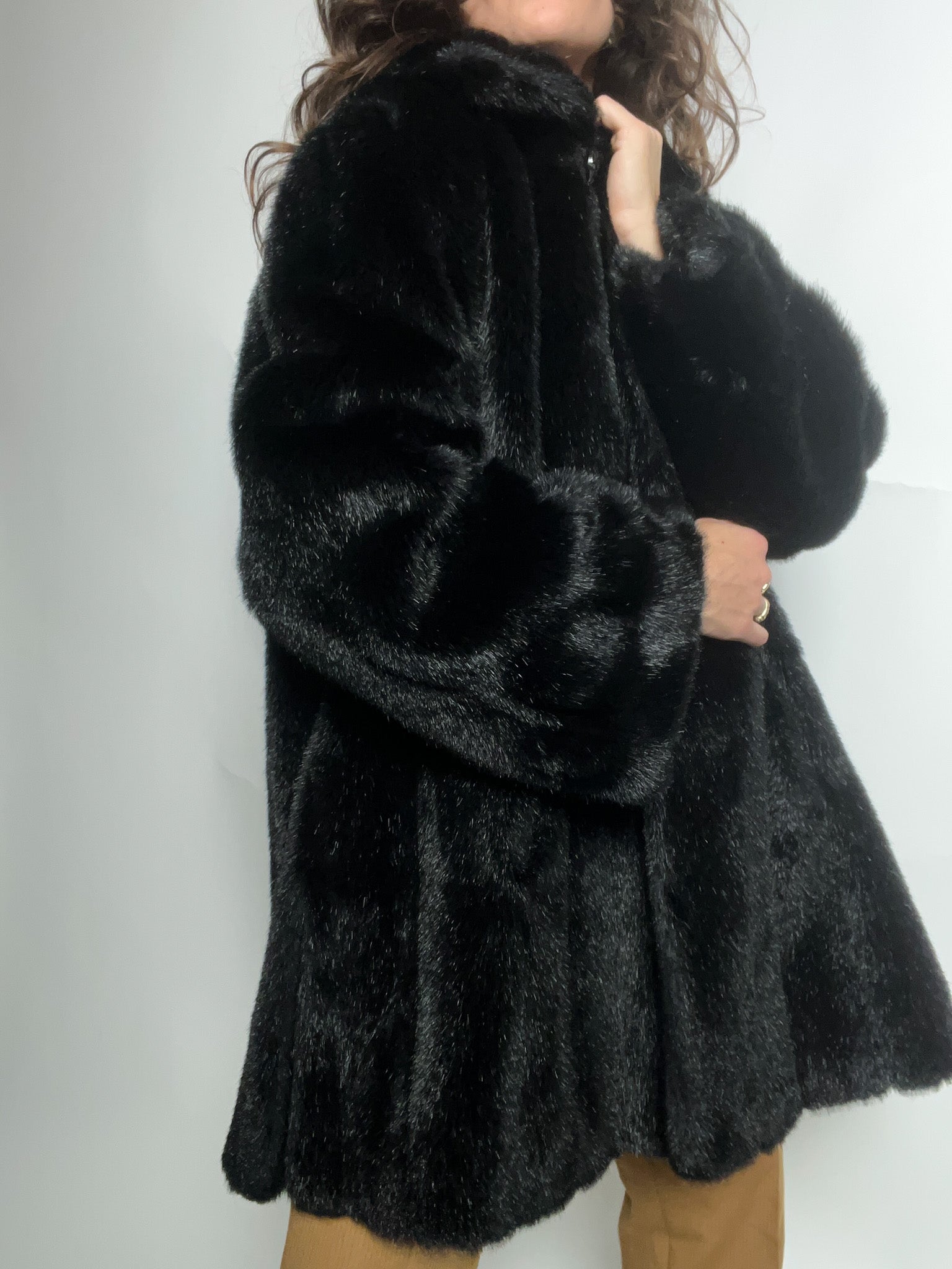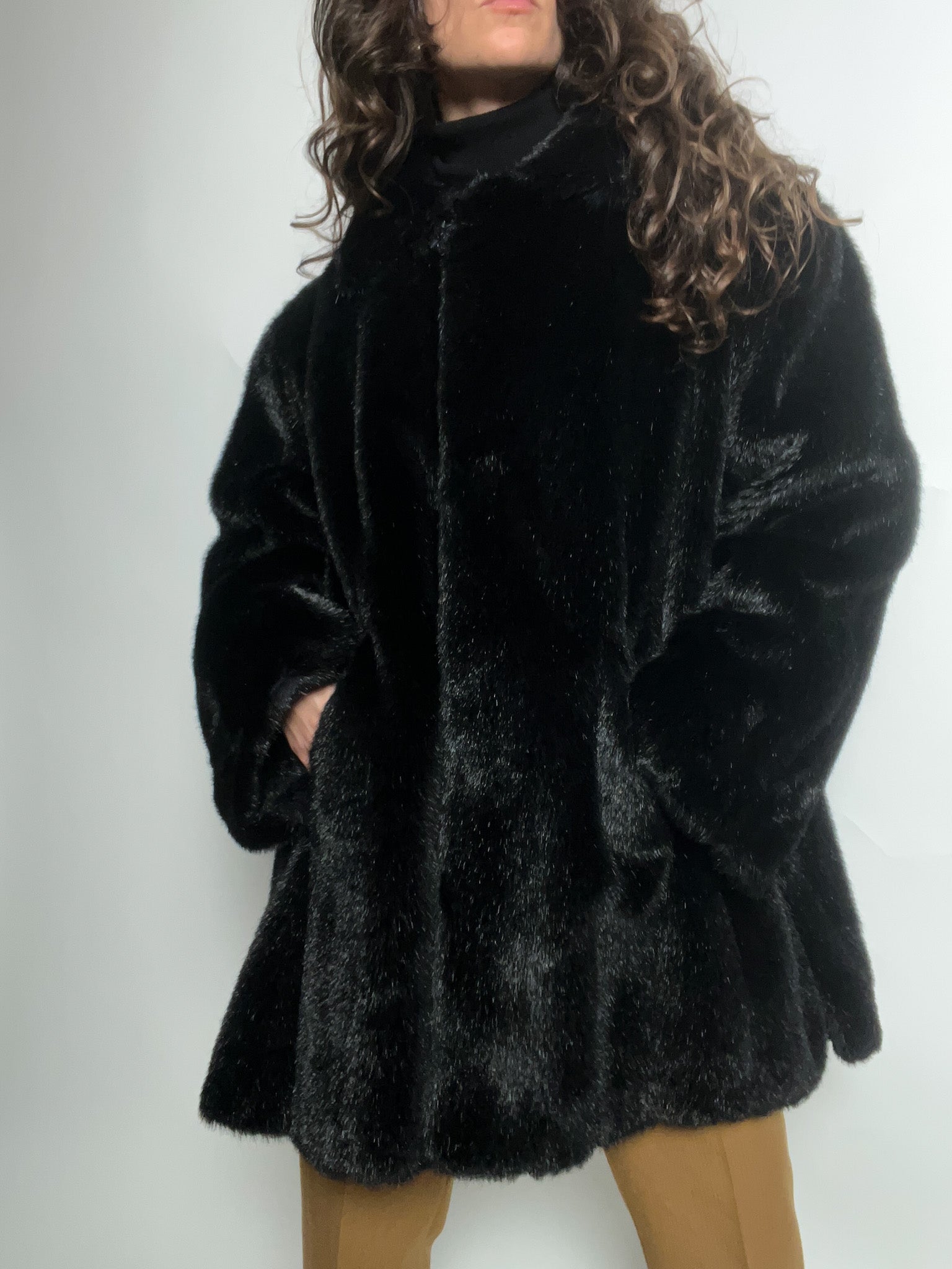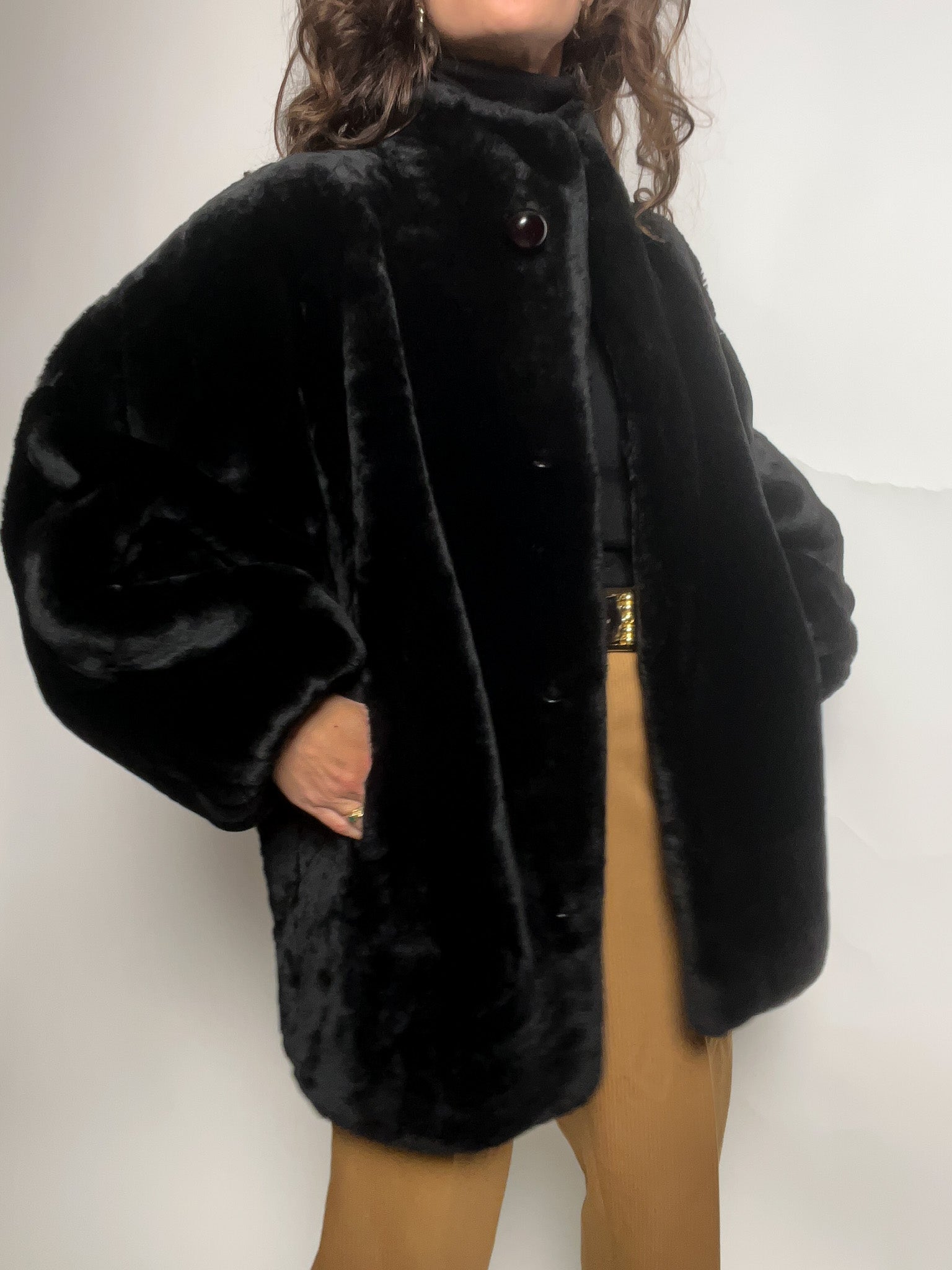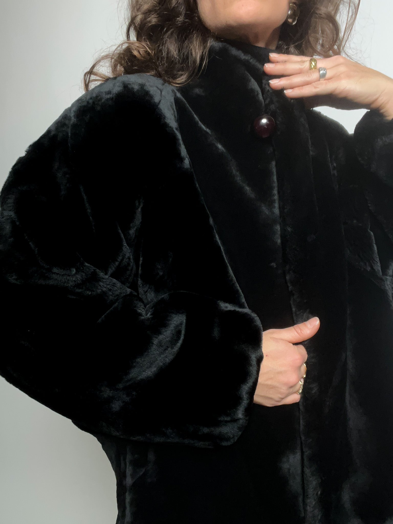 Vintage 90’s Black Glossy Faux Fur Coat with Star-Engraved Buttons