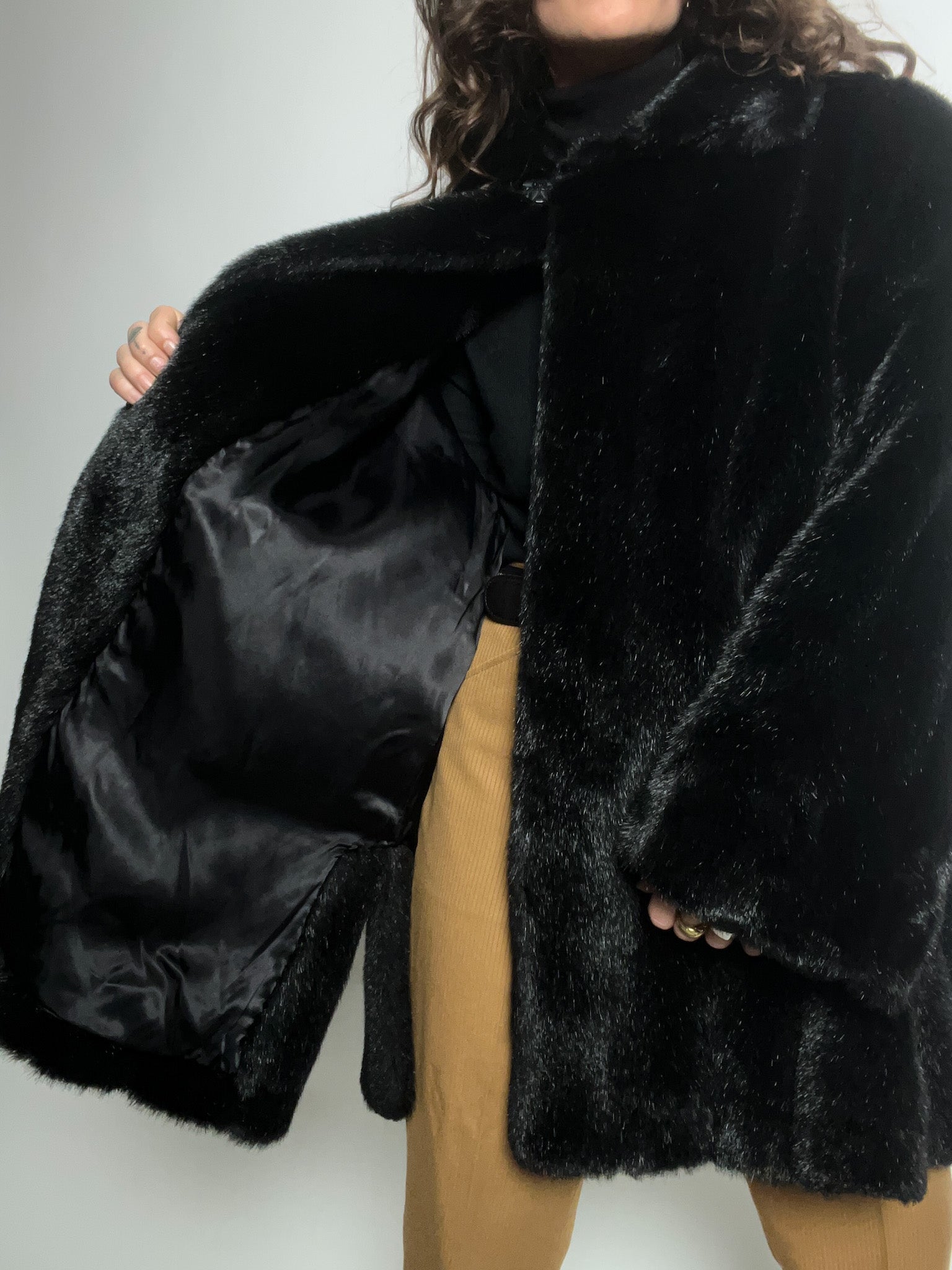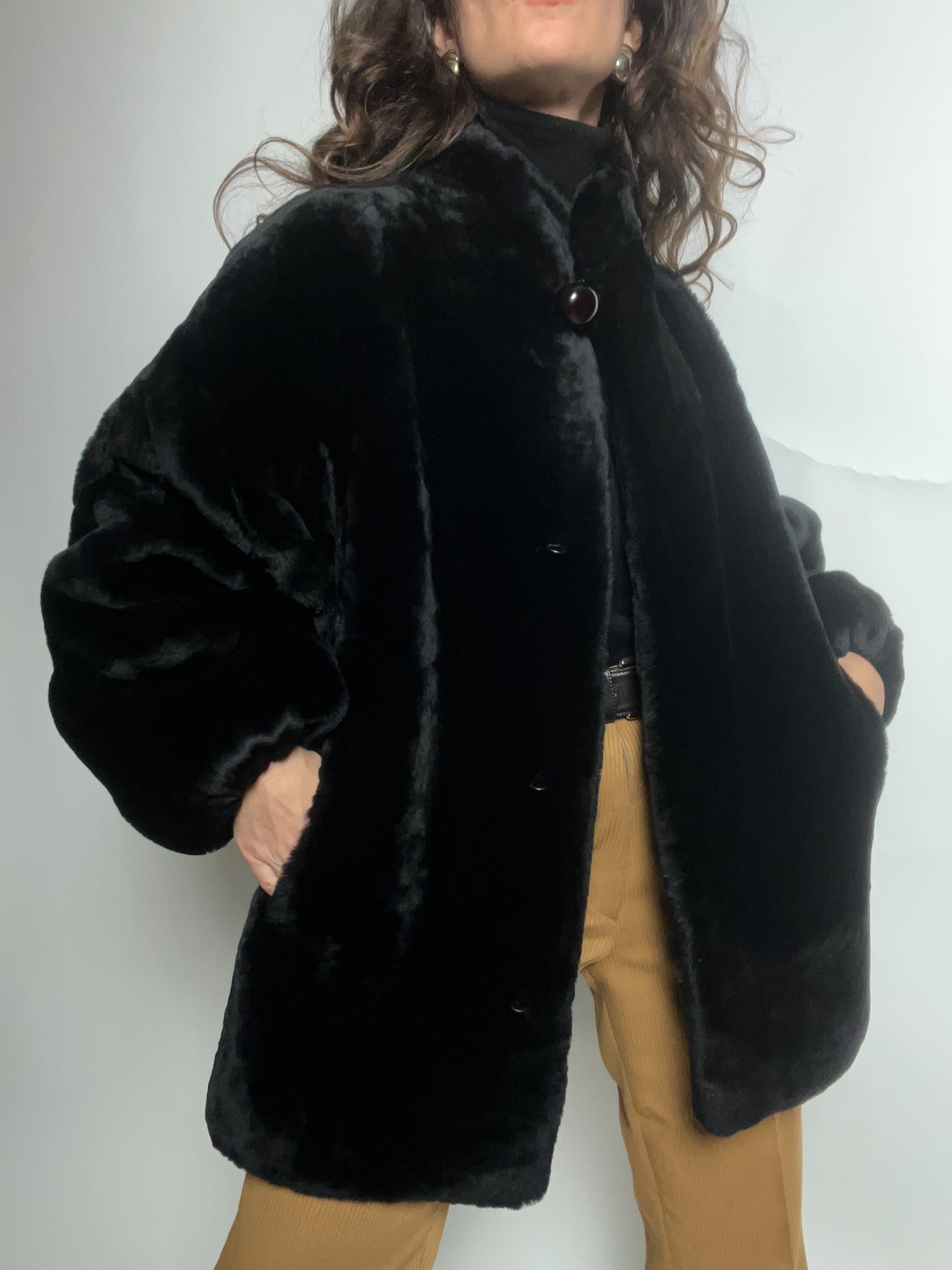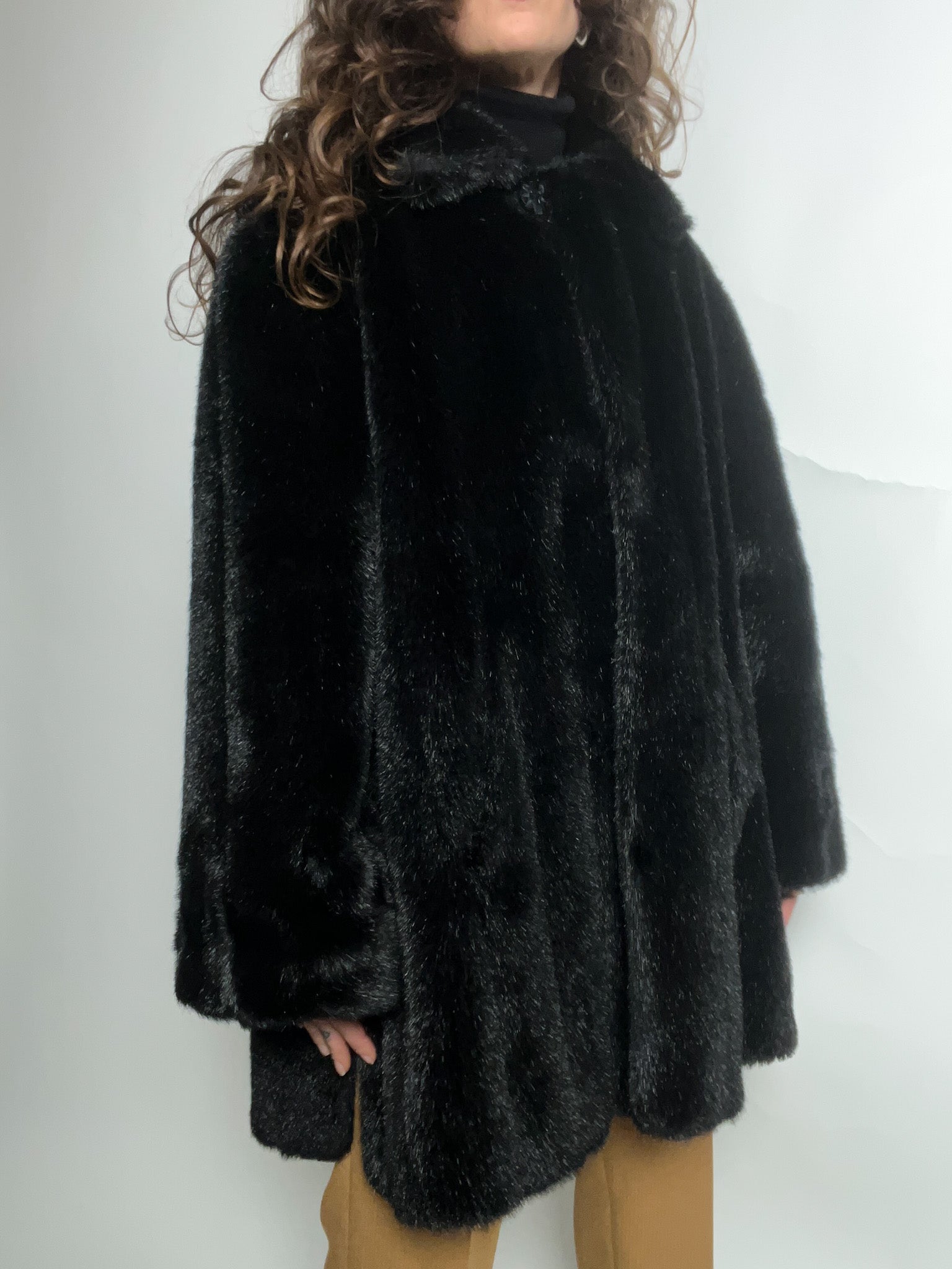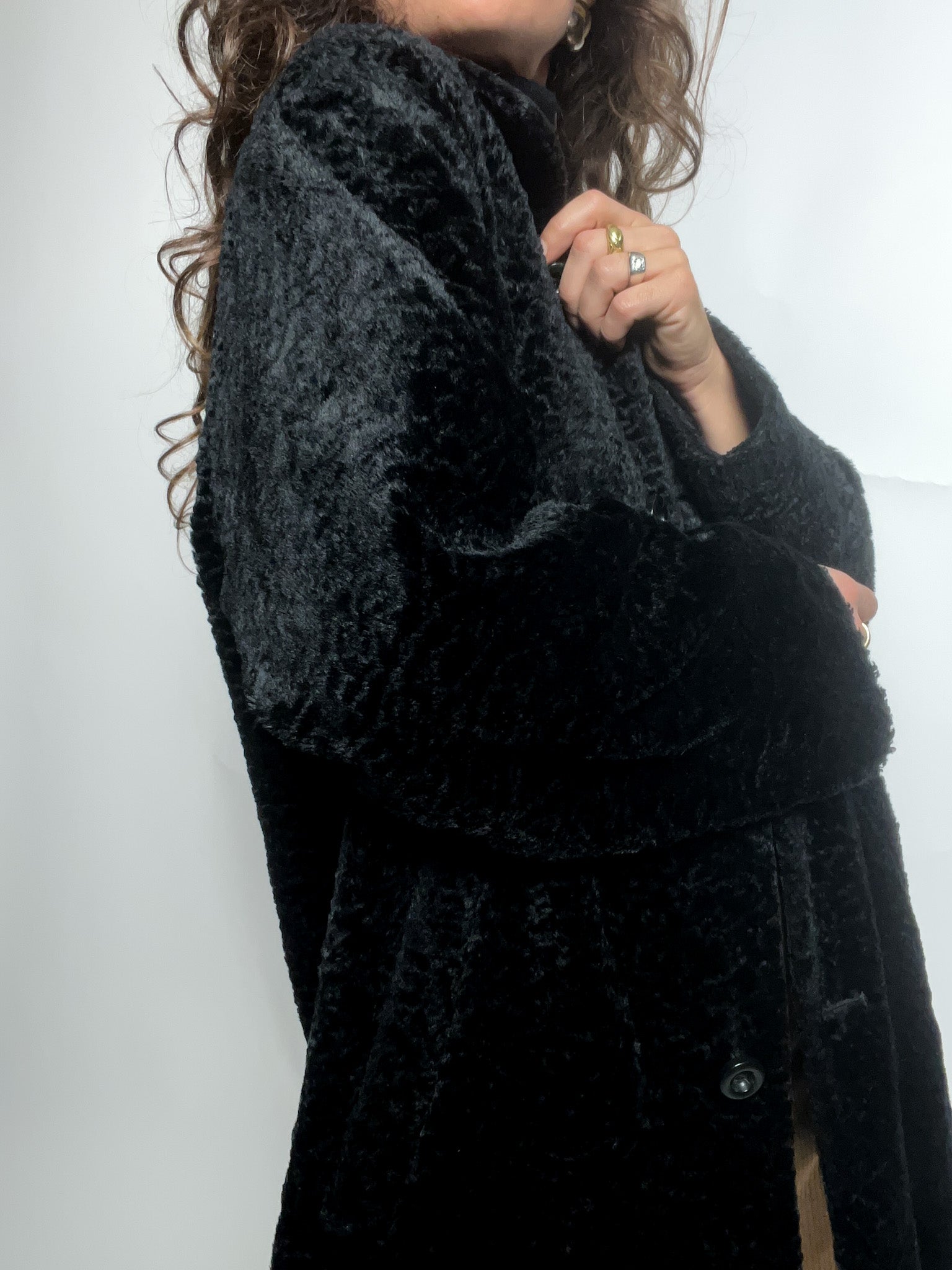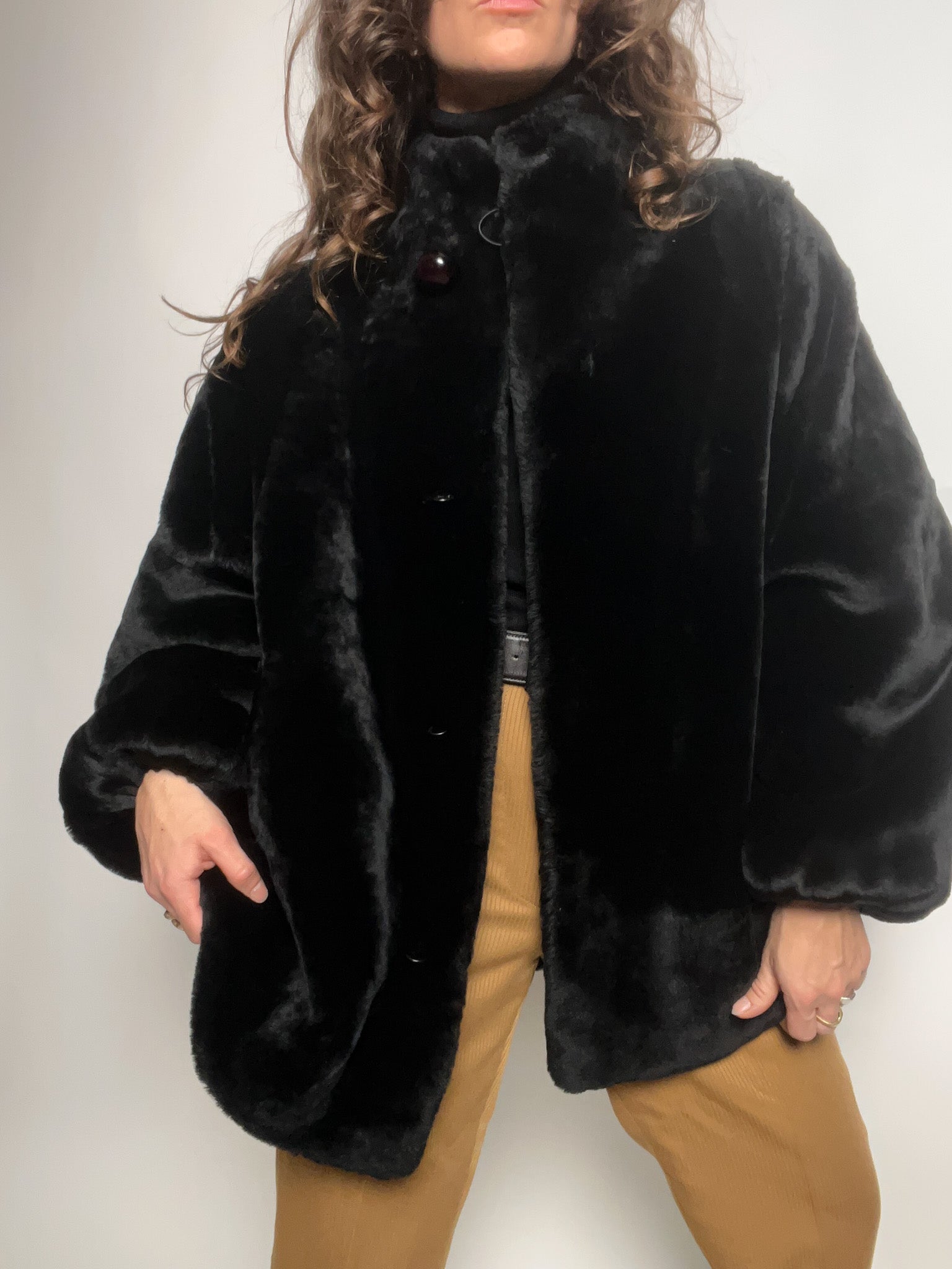 Vintage 90’s Black Glossy Faux Fur Coat with Star-Engraved Buttons