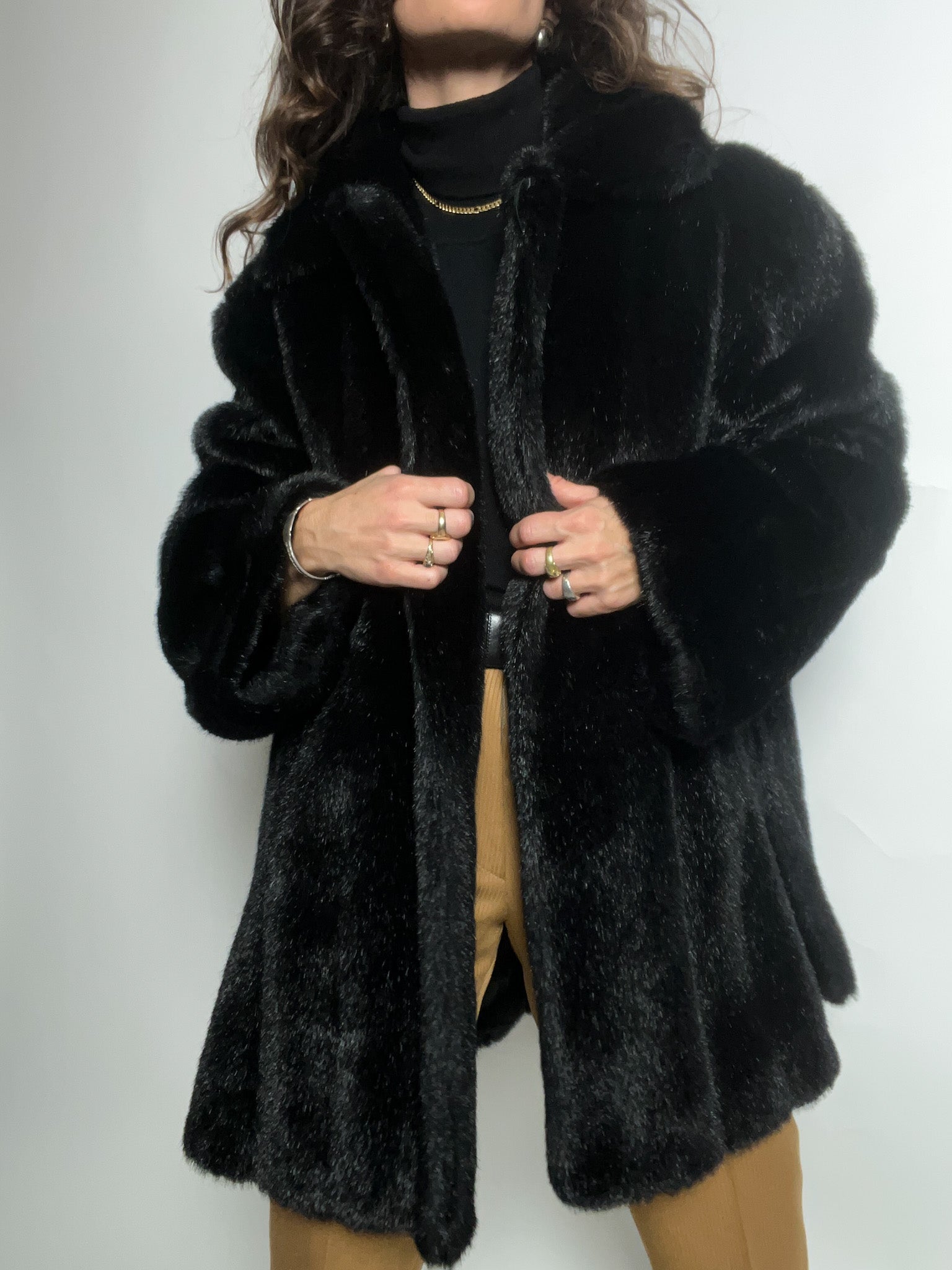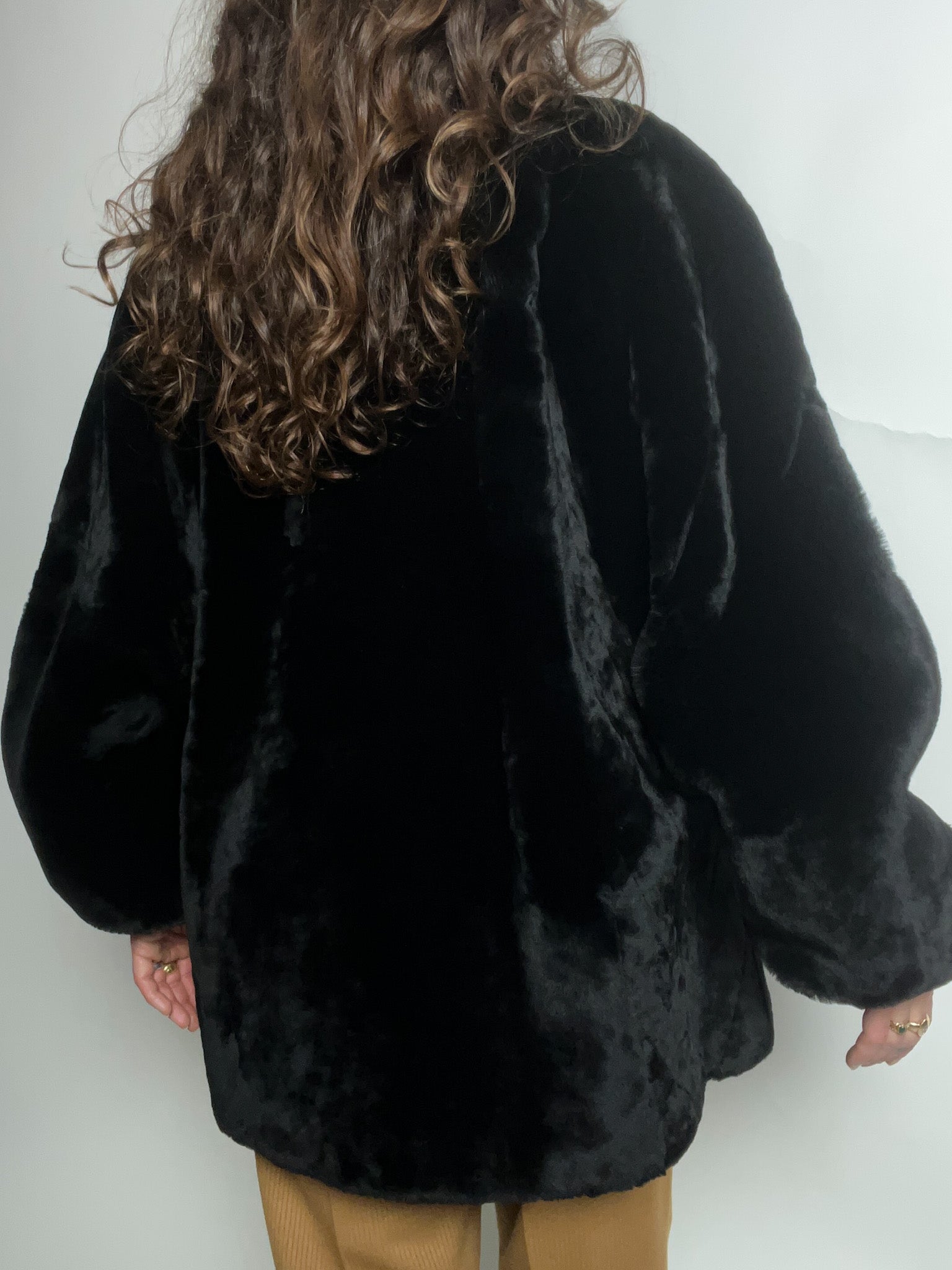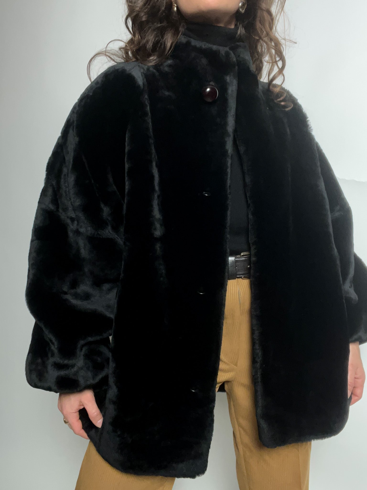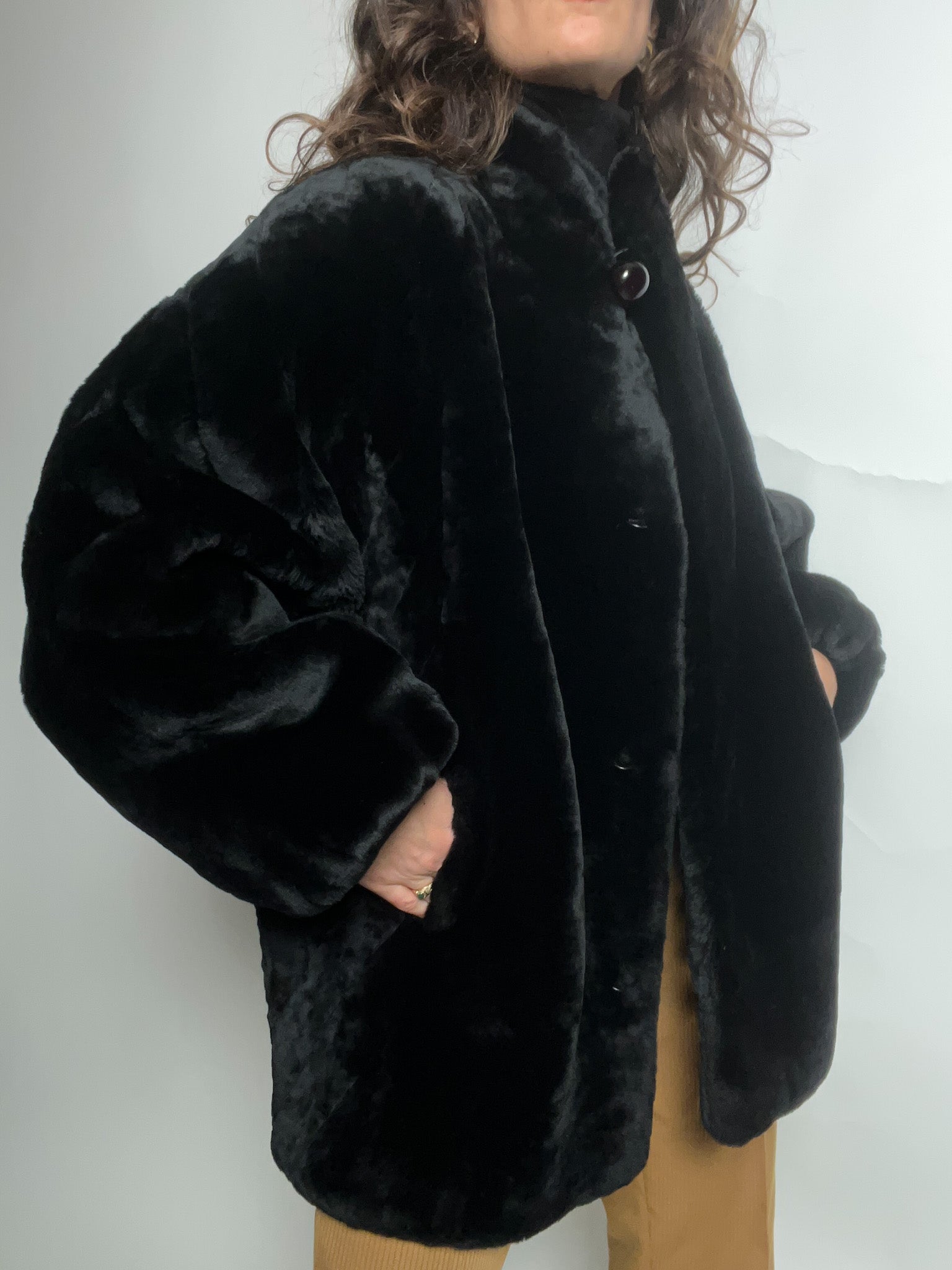 Vintage 90’s Black Glossy Faux Fur Coat with Star-Engraved Buttons