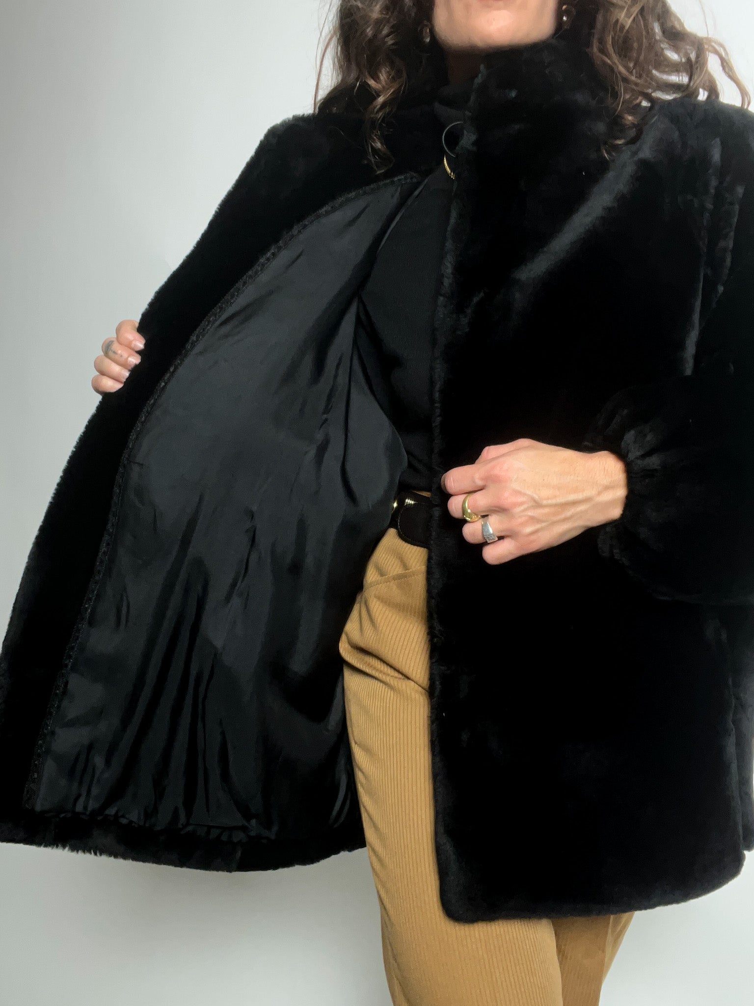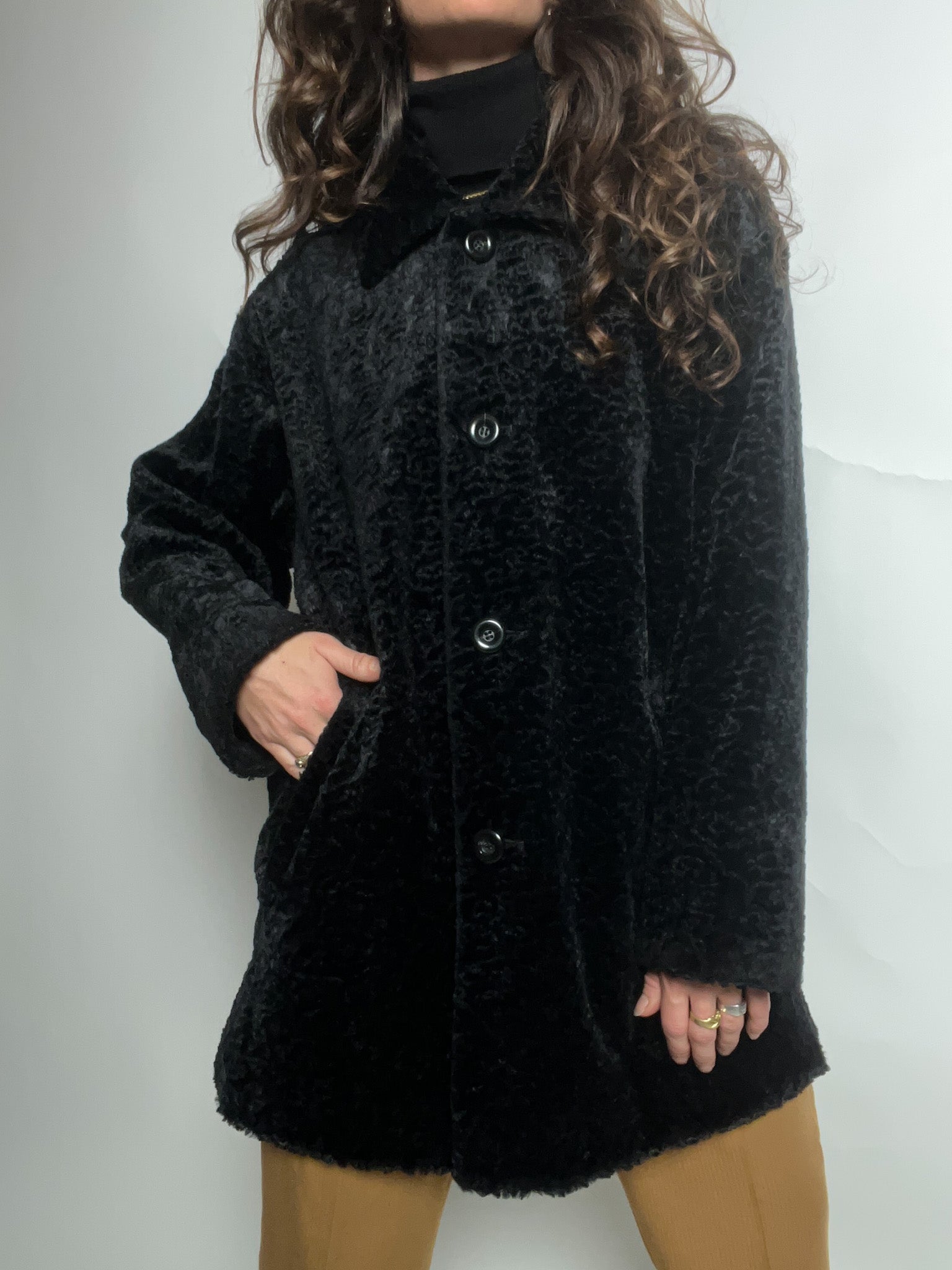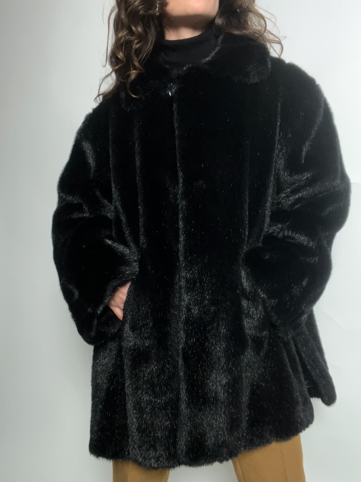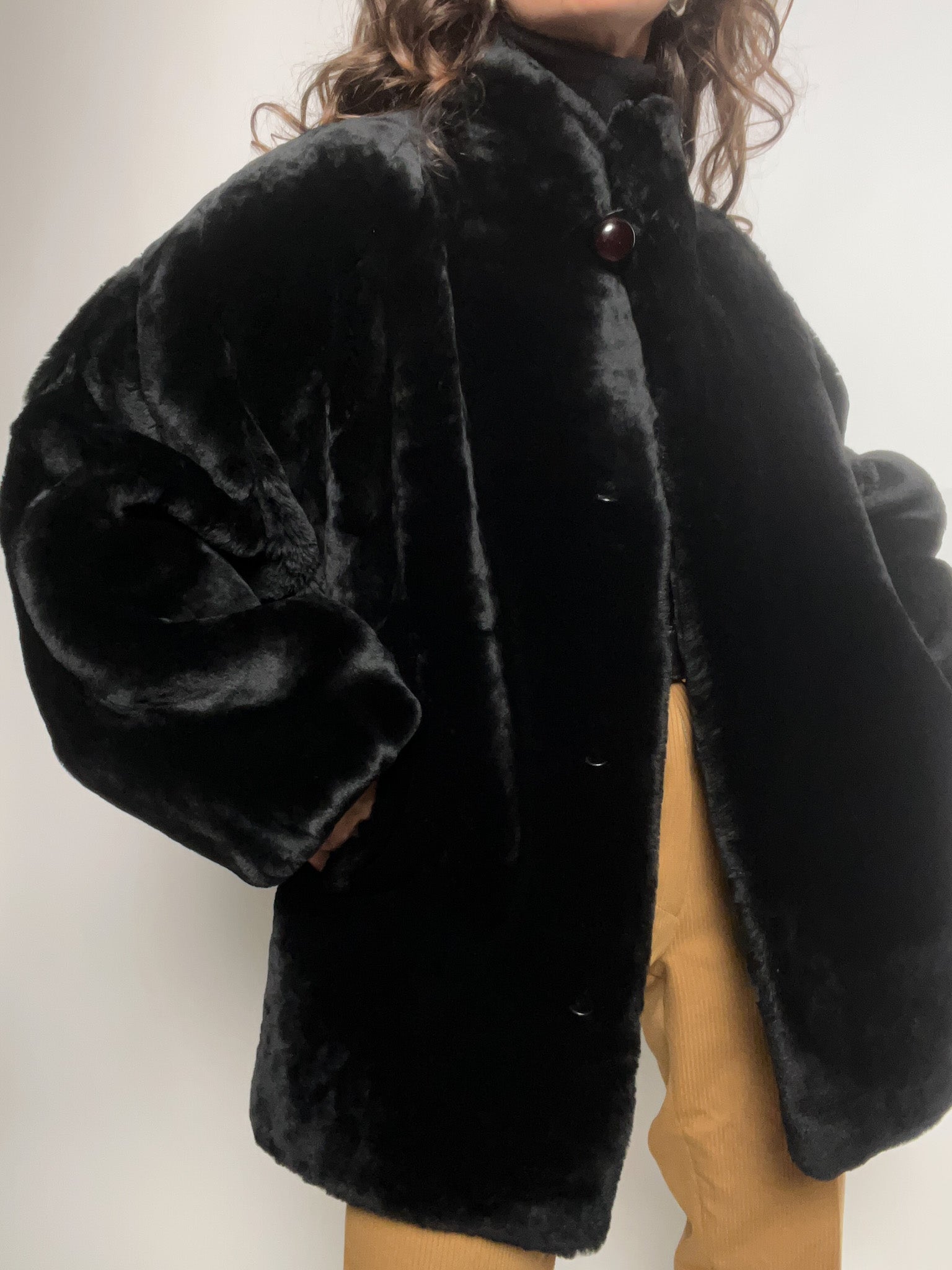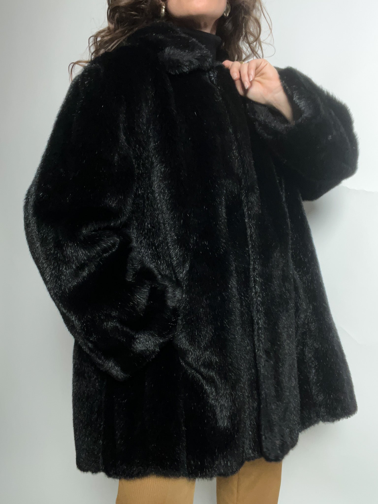 Vintage 90’s Black Glossy Faux Fur Coat with Star-Engraved Buttons
