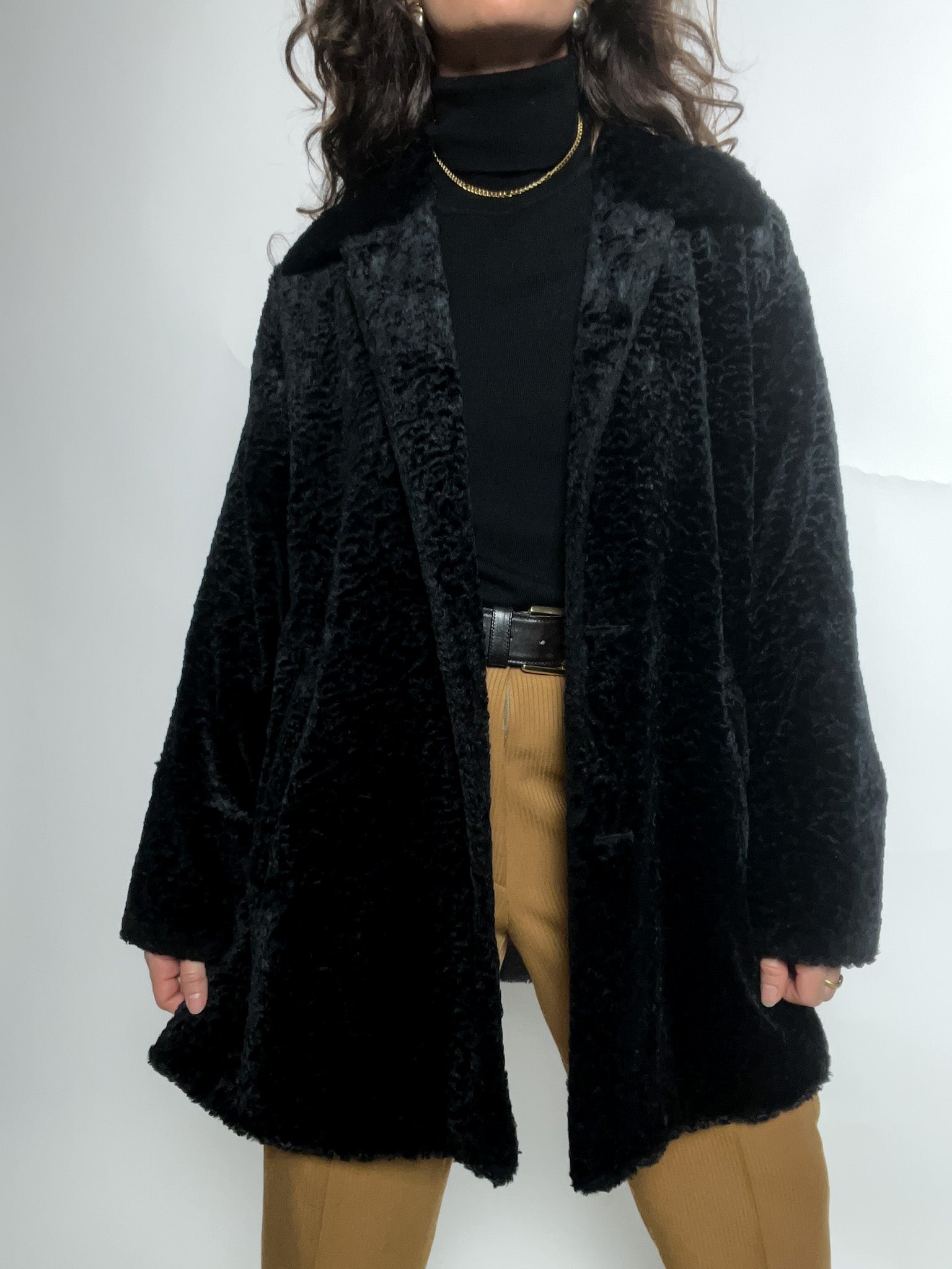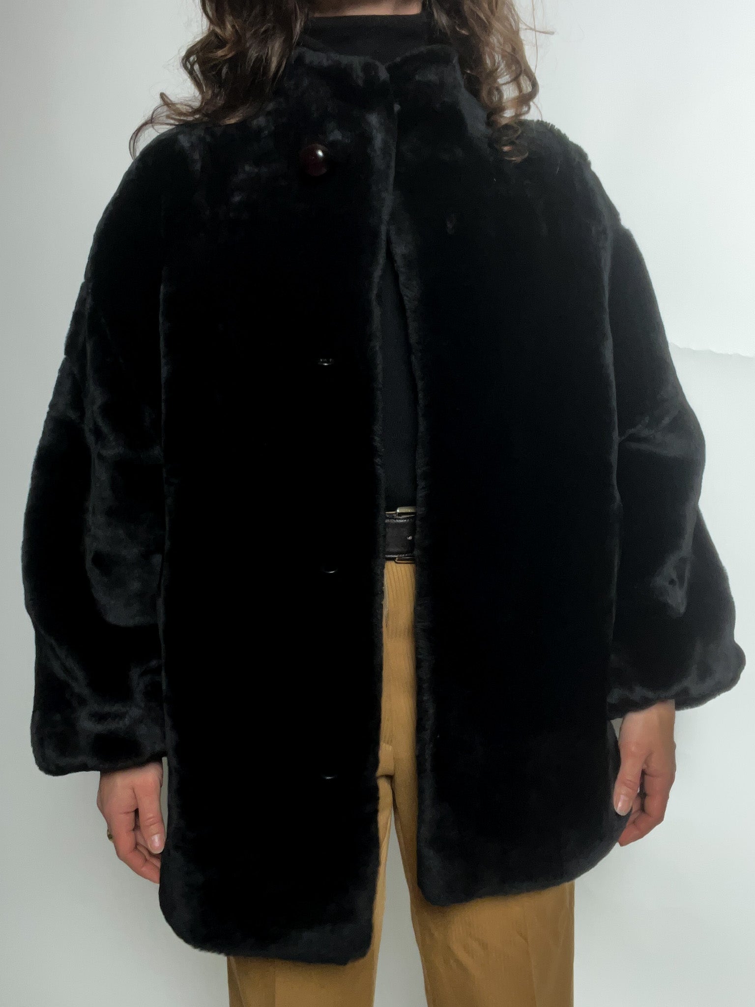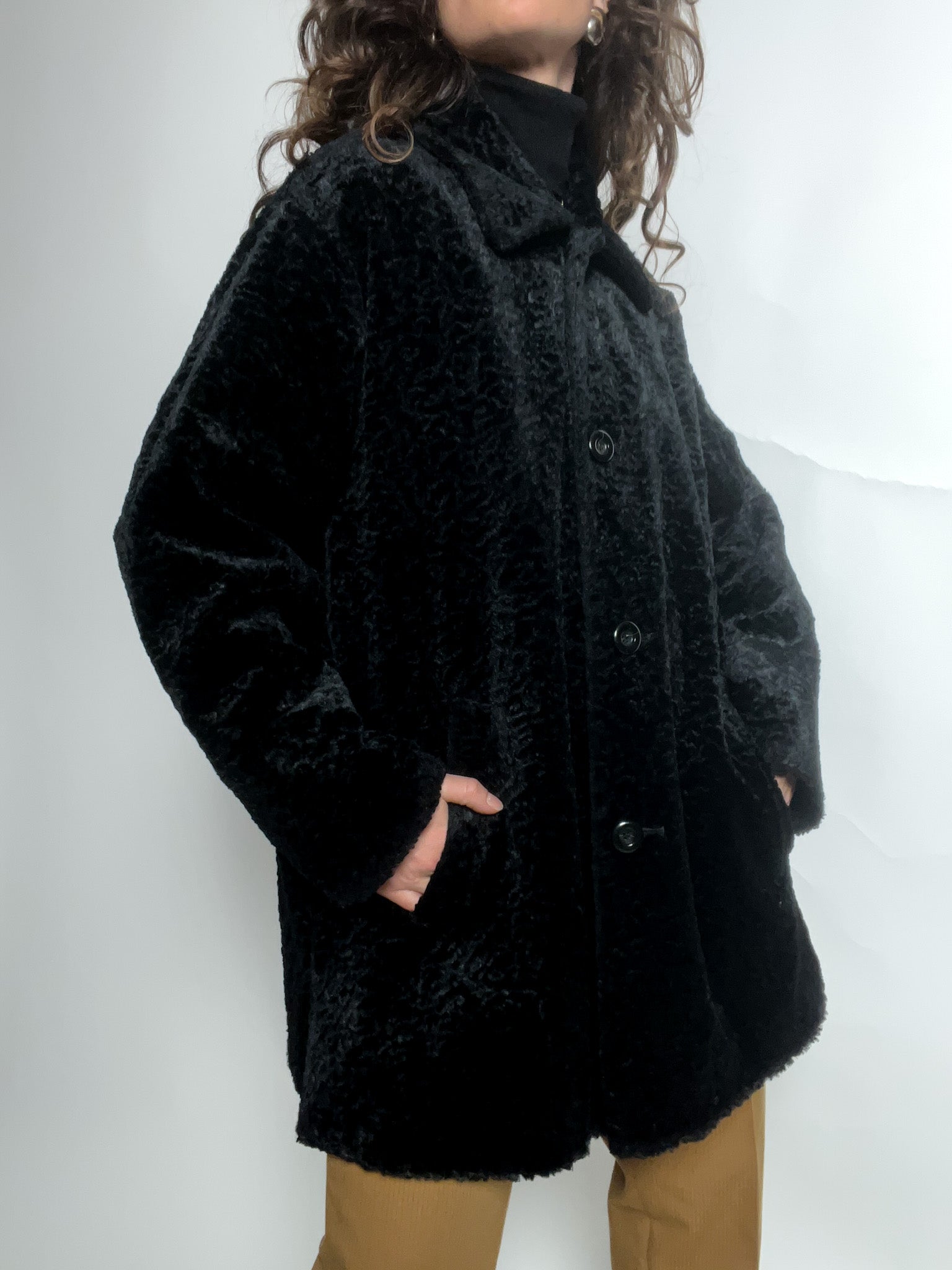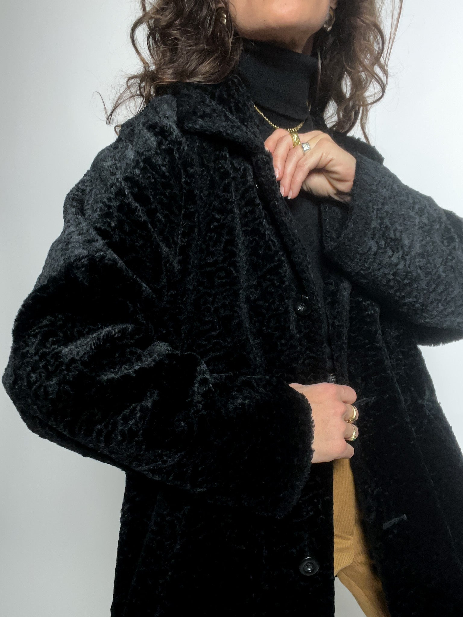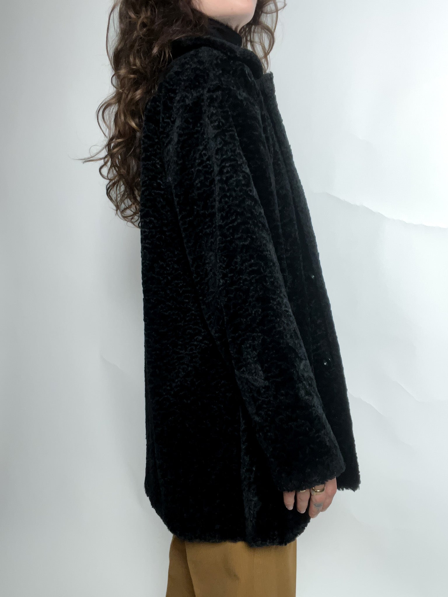 Vintage 90’s Black Glossy Faux Fur Coat with Star-Engraved Buttons