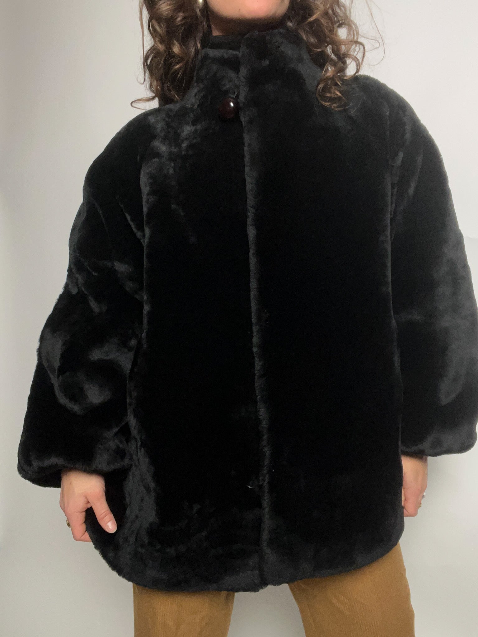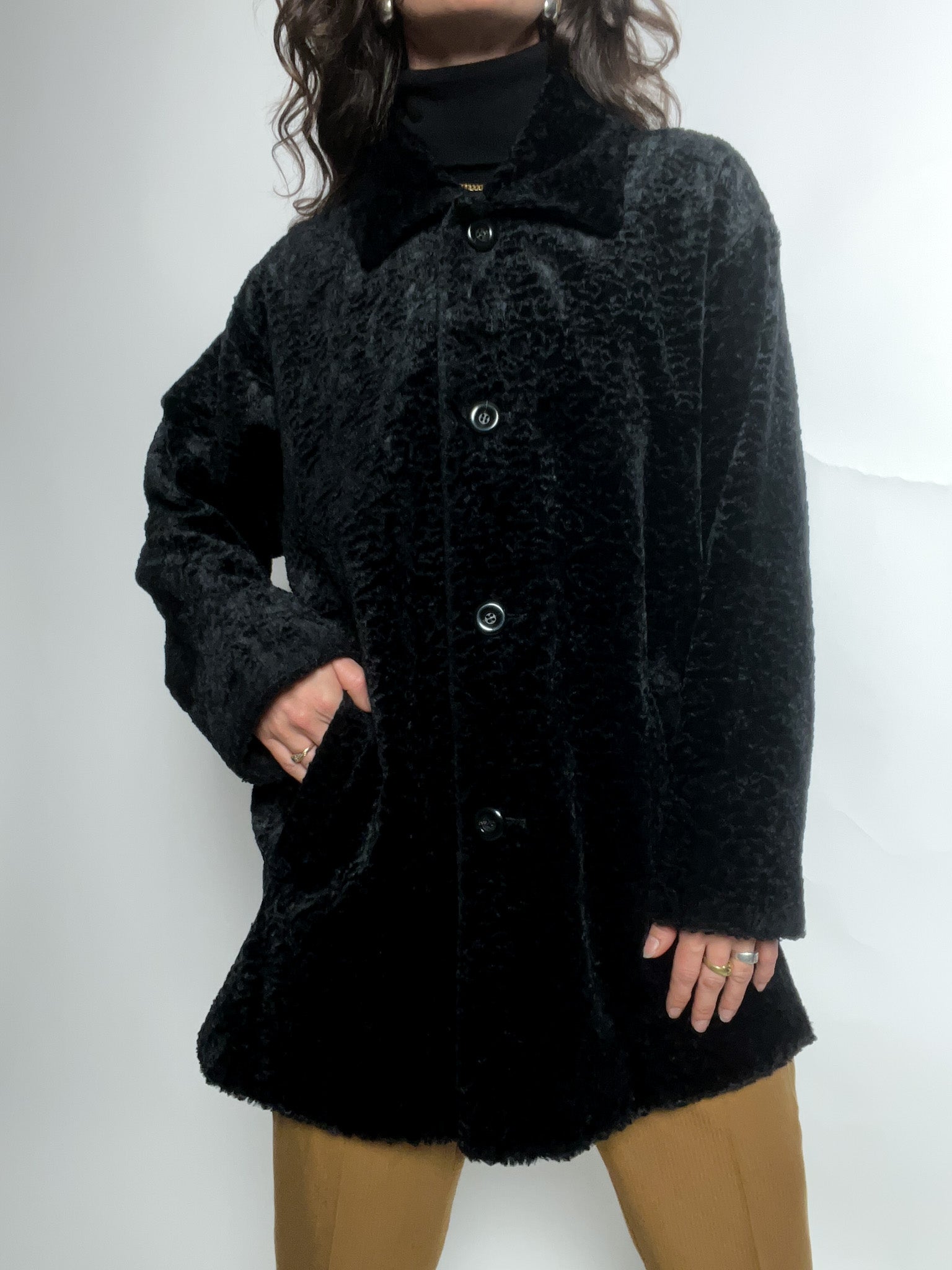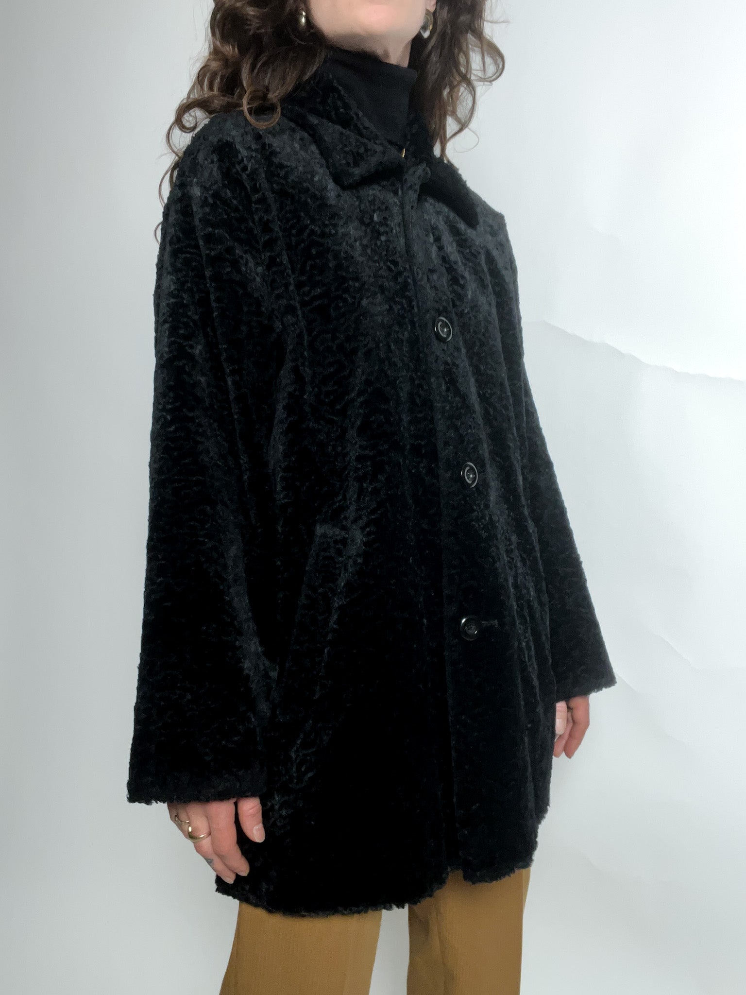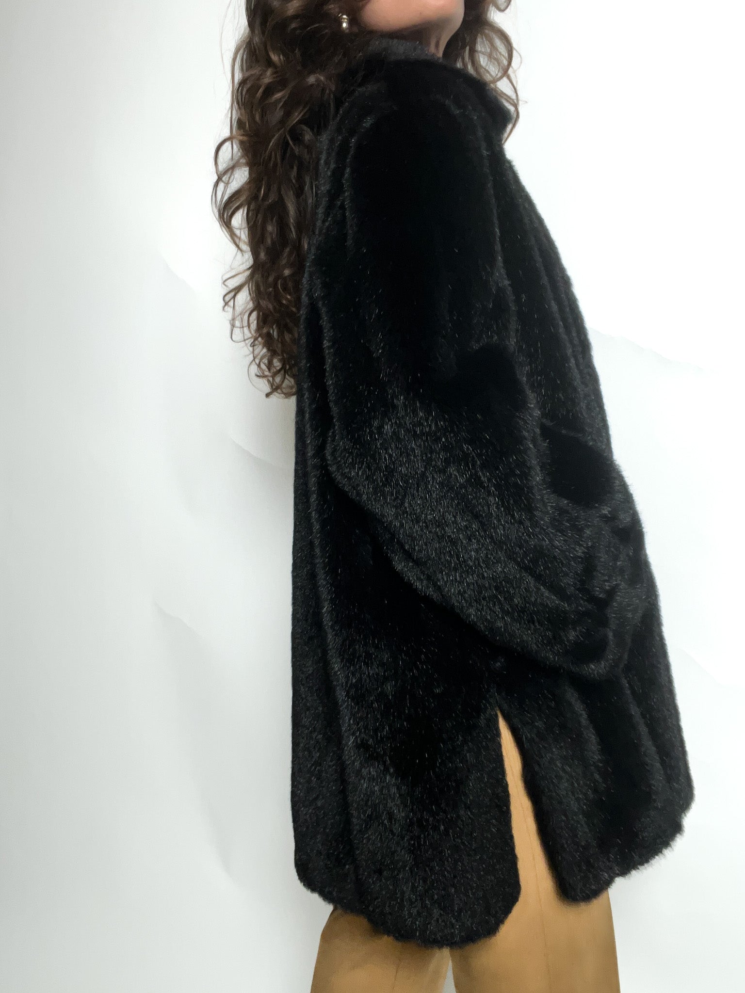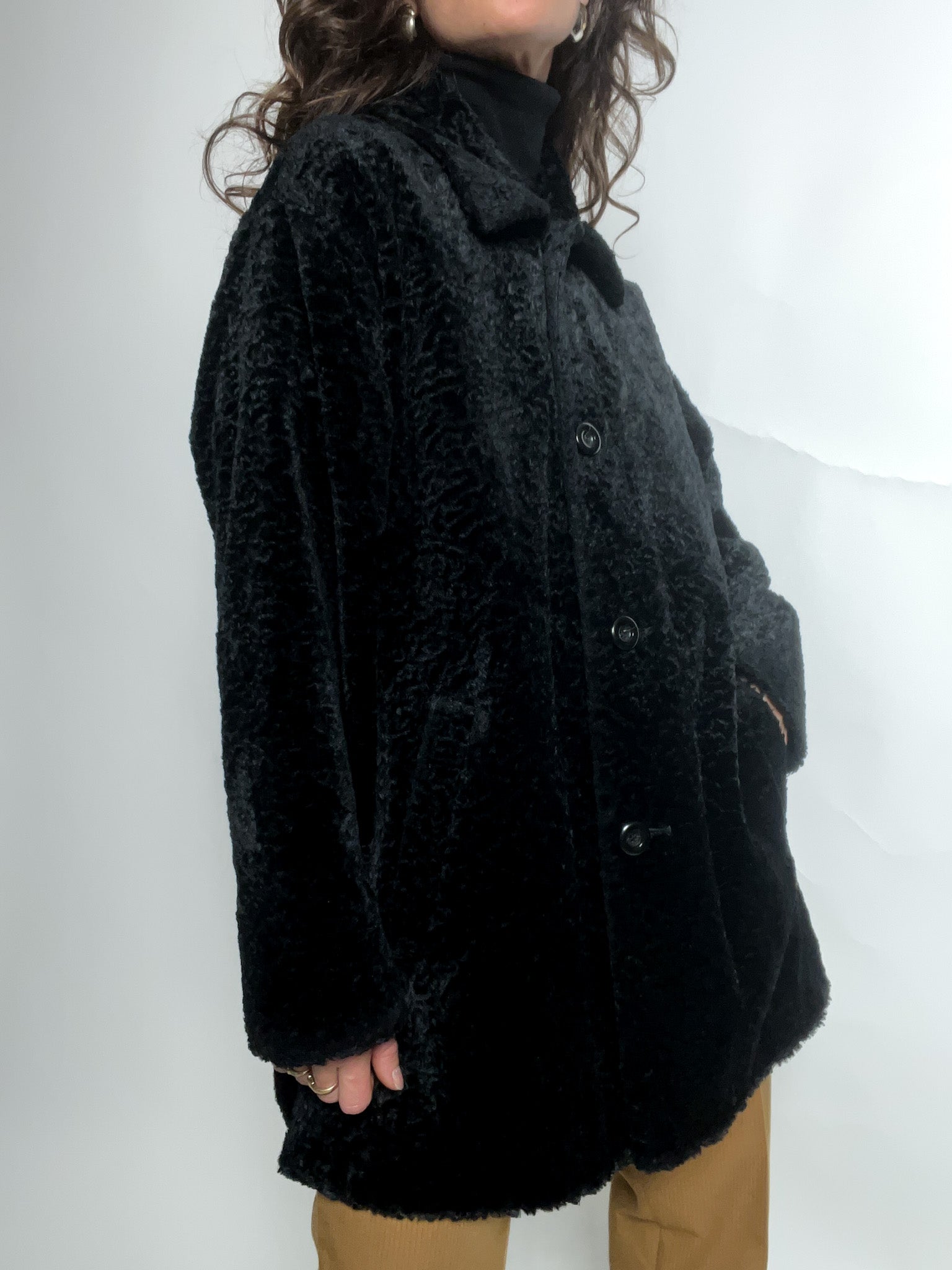Vintage 90’s Black Glossy Faux Fur Coat with Star-Engraved Buttons