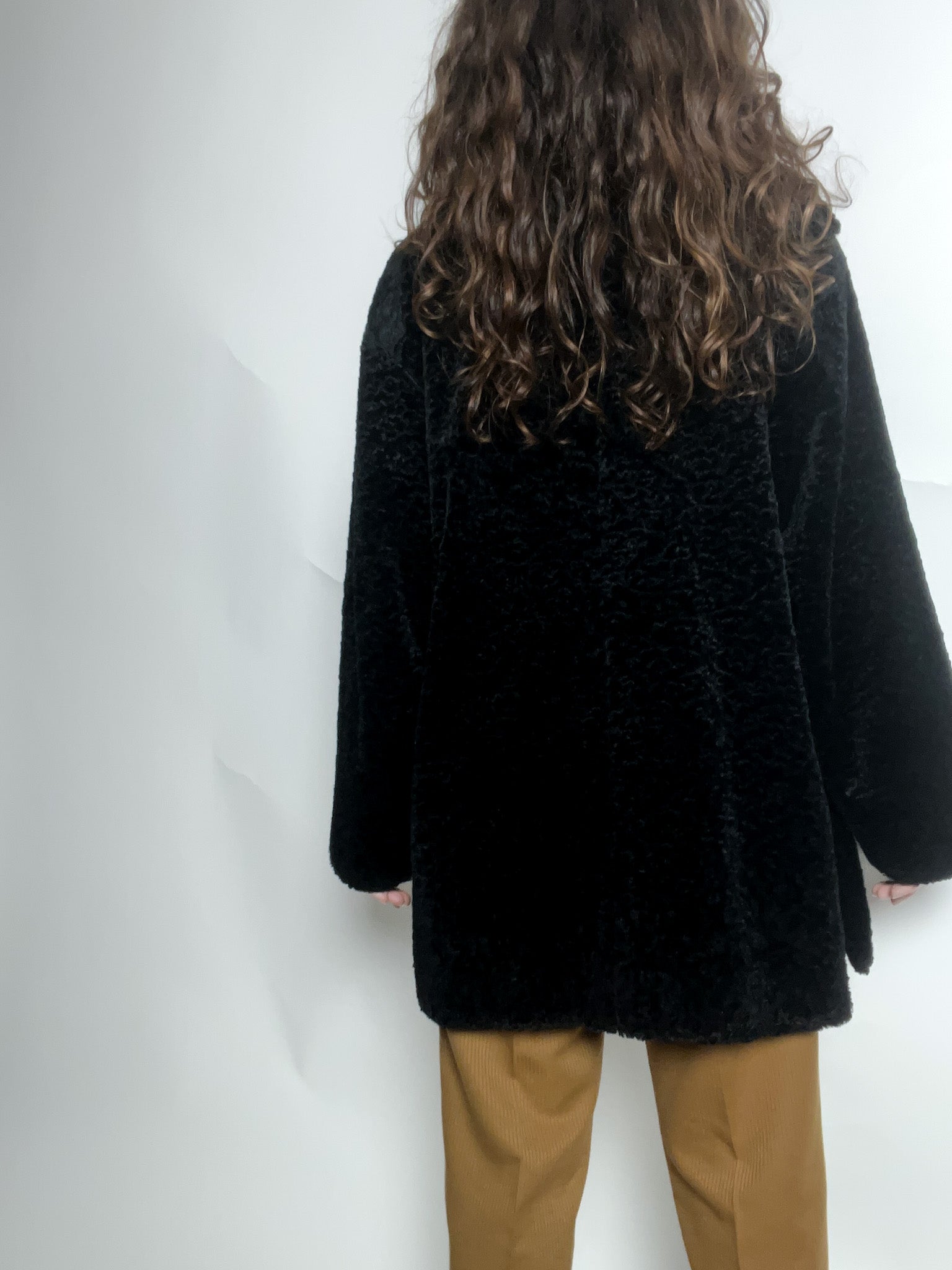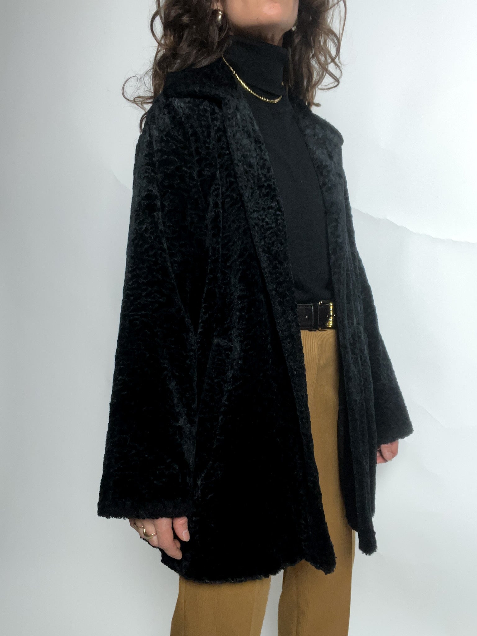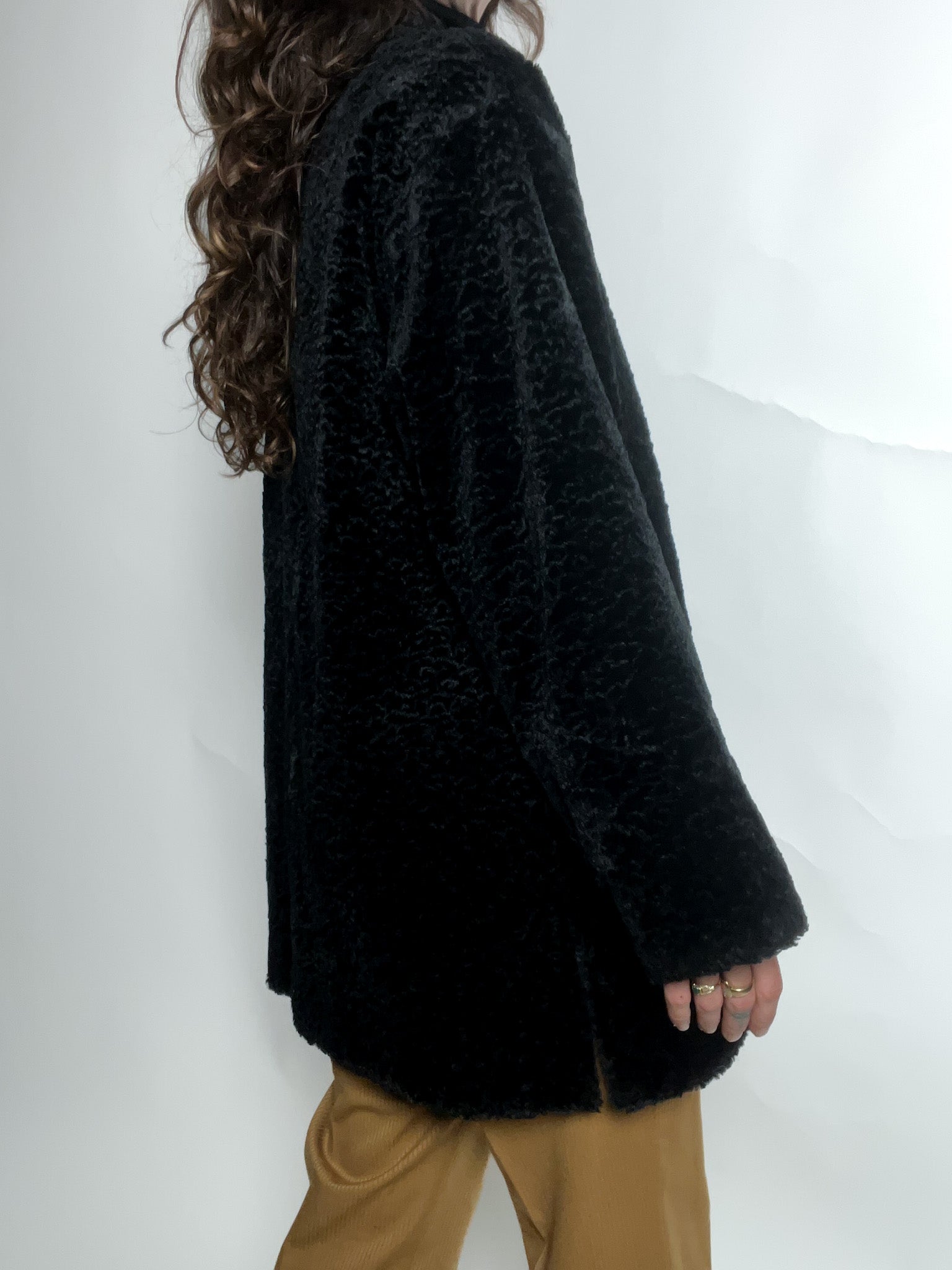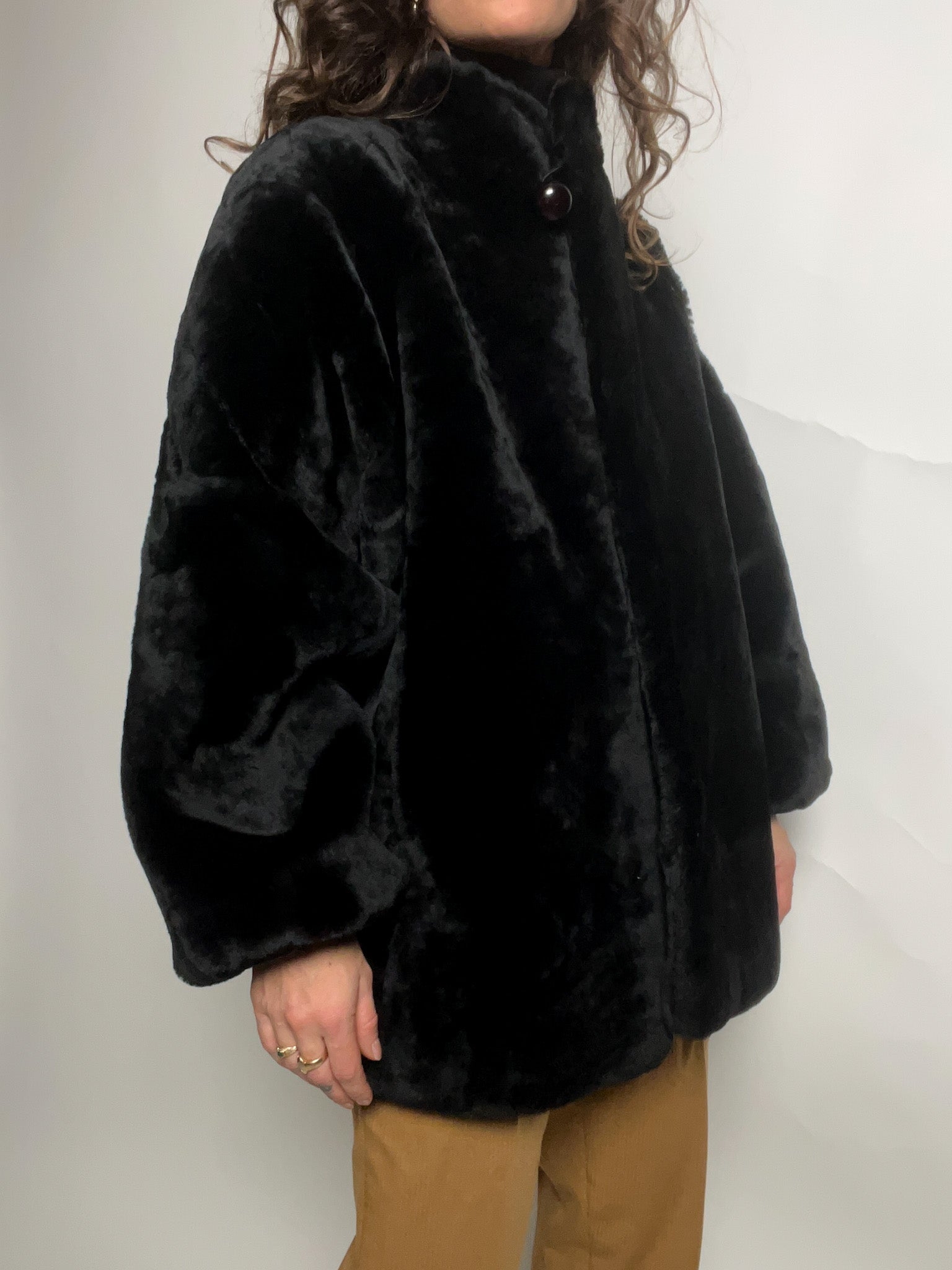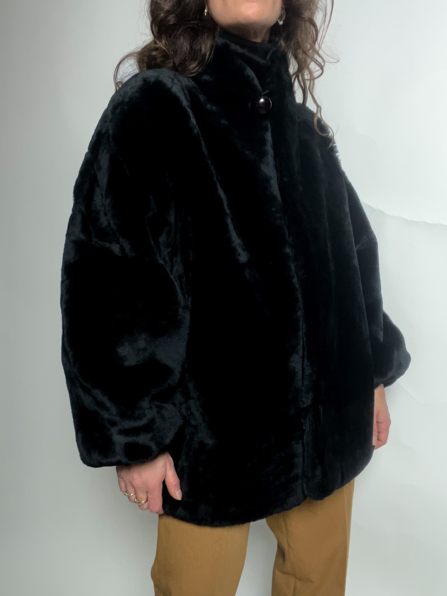 Vintage 90’s Black Glossy Faux Fur Coat with Star-Engraved Buttons