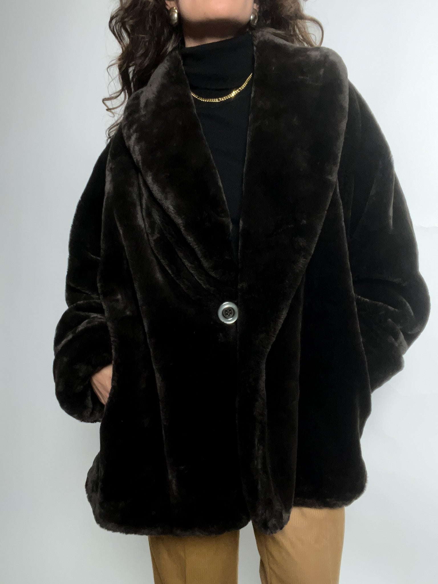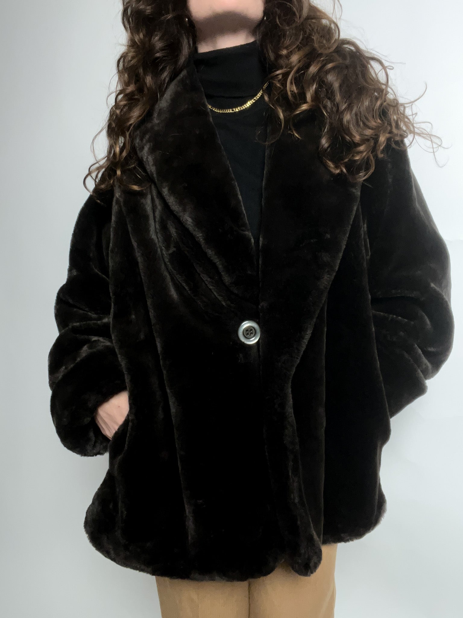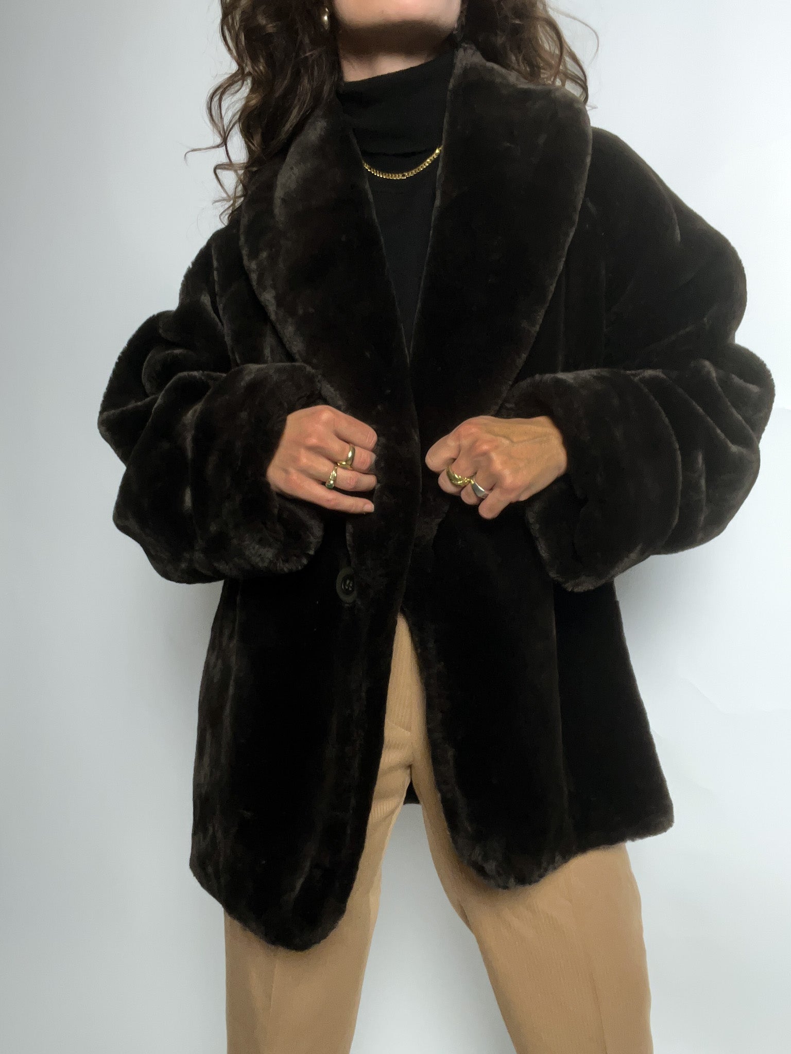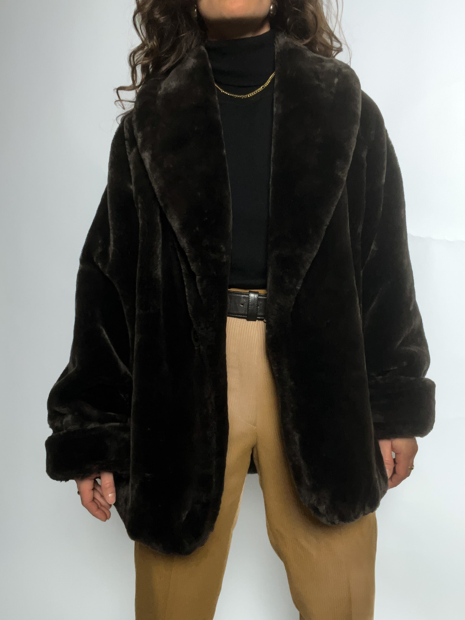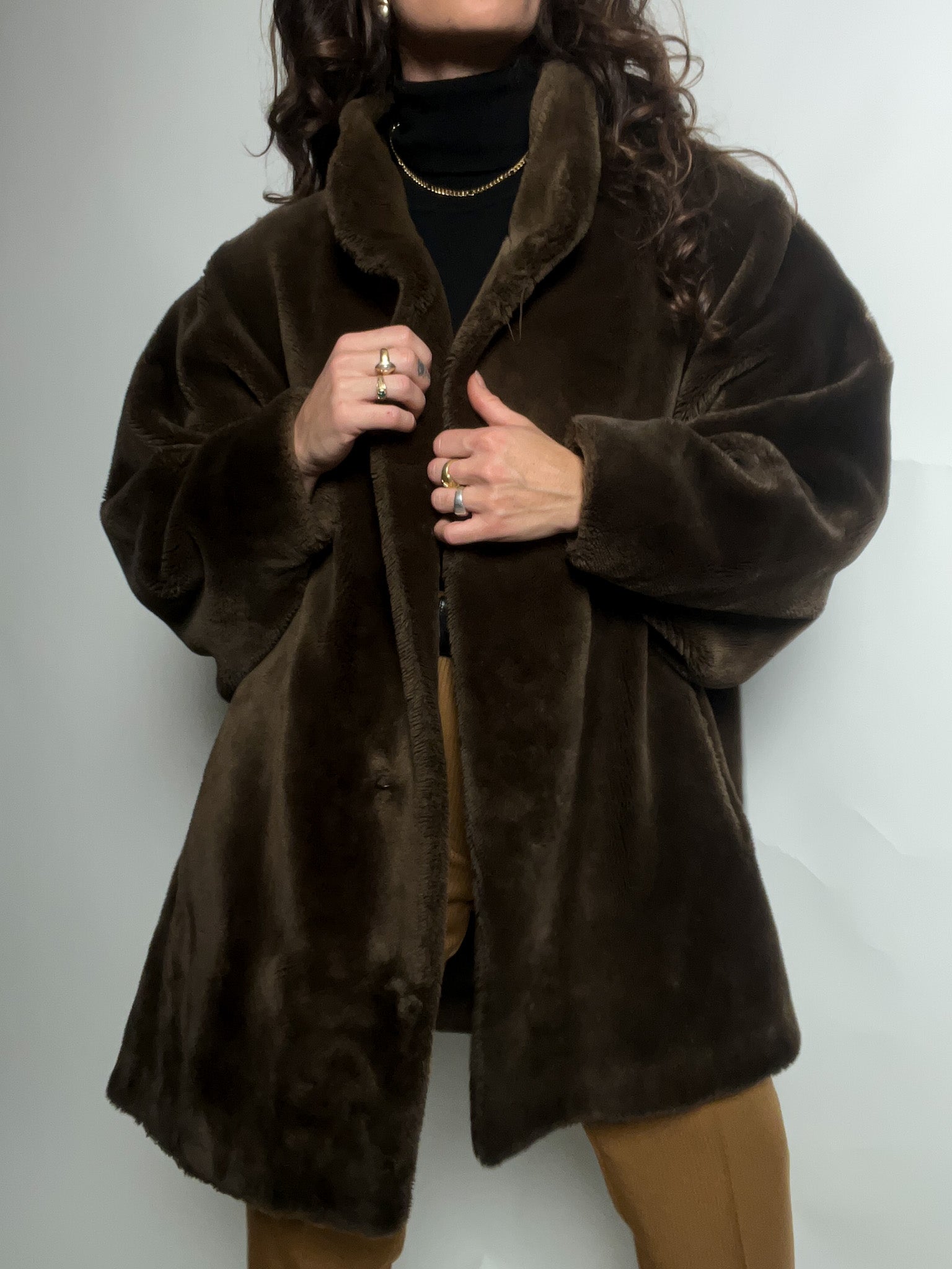 Vintage 90’s Dark Chocolate Faux Fur Coat with Deep Shawl Collar