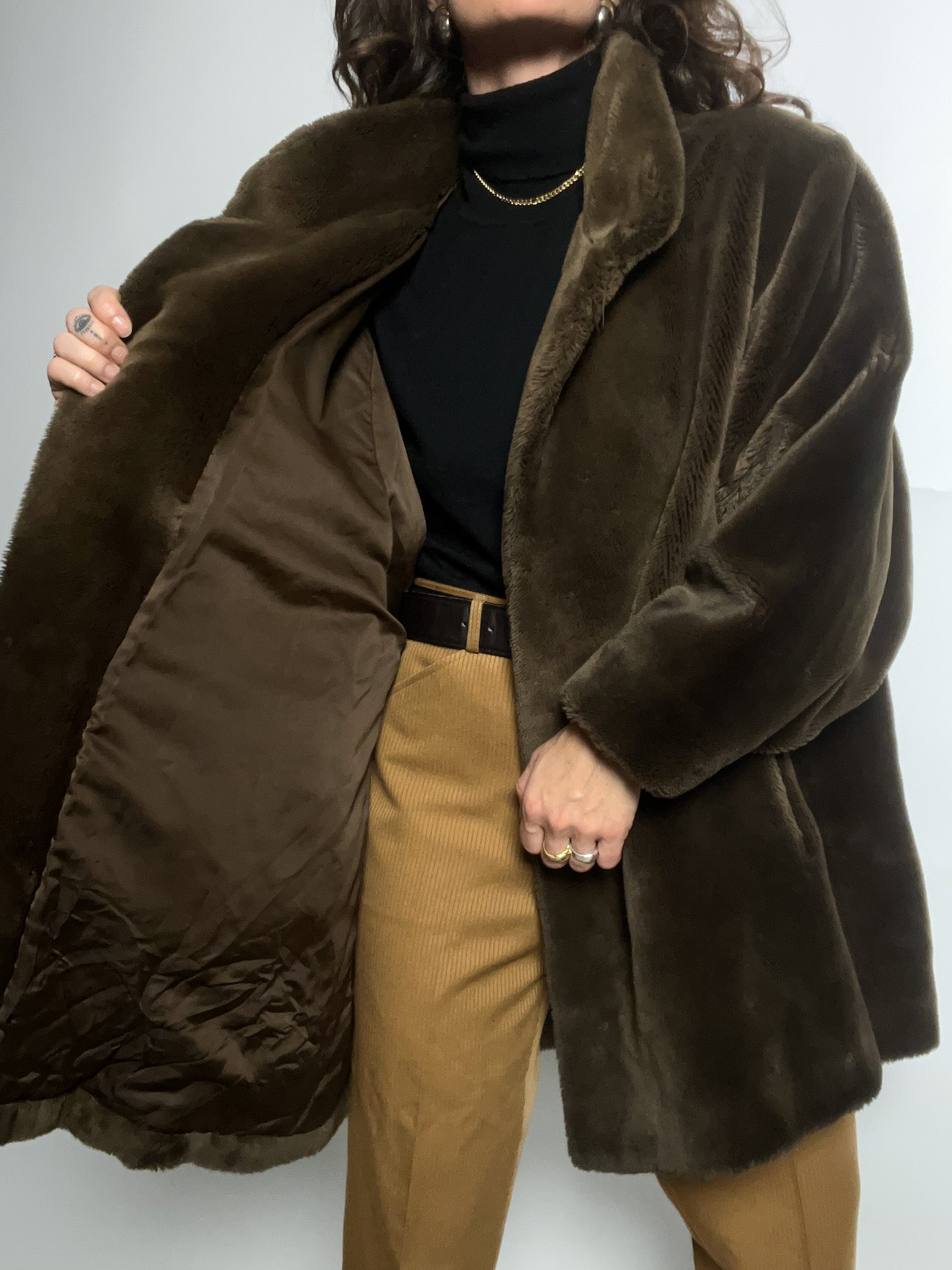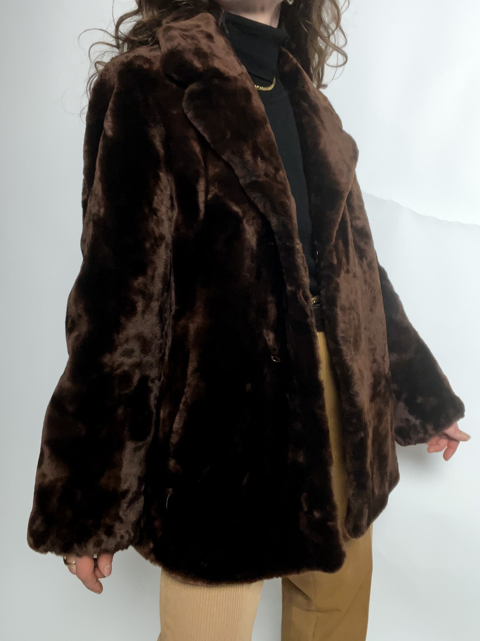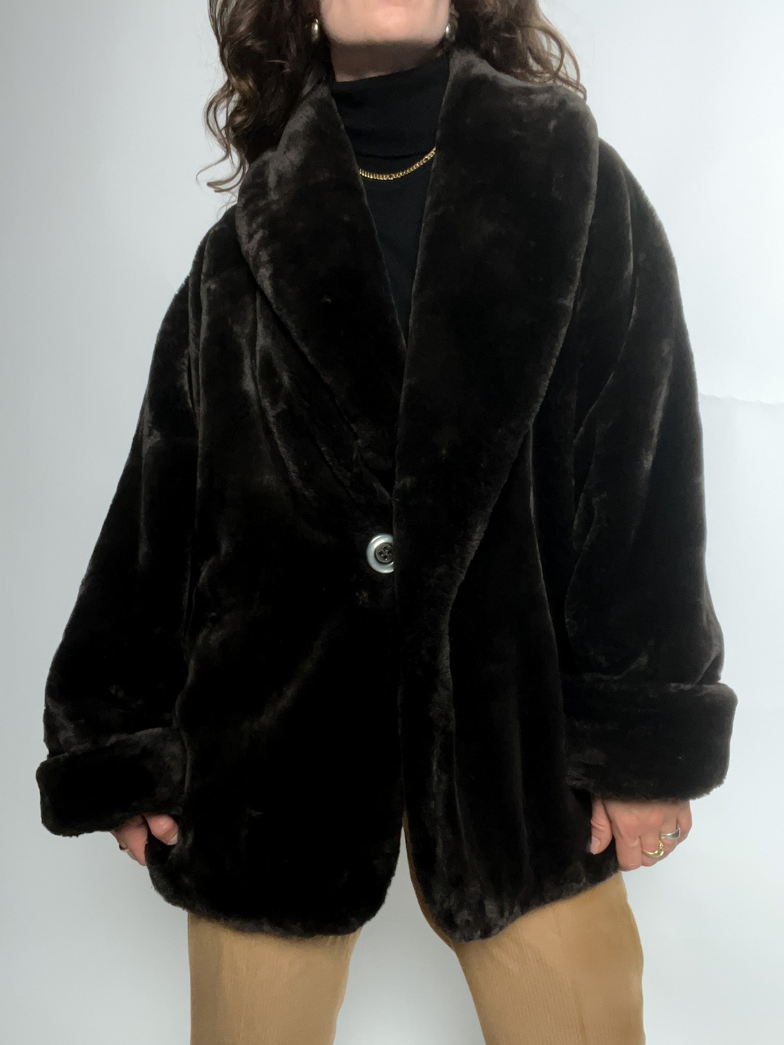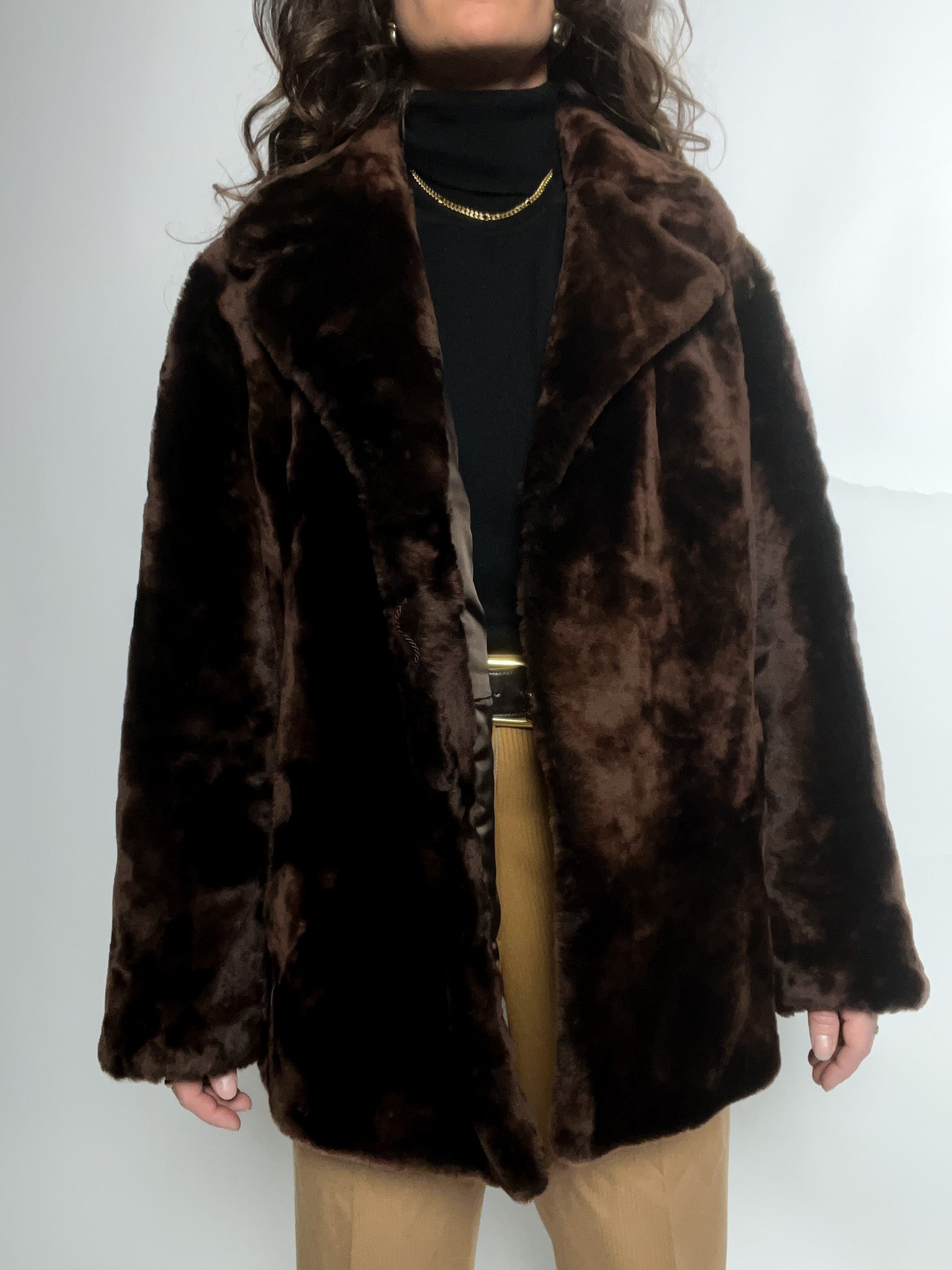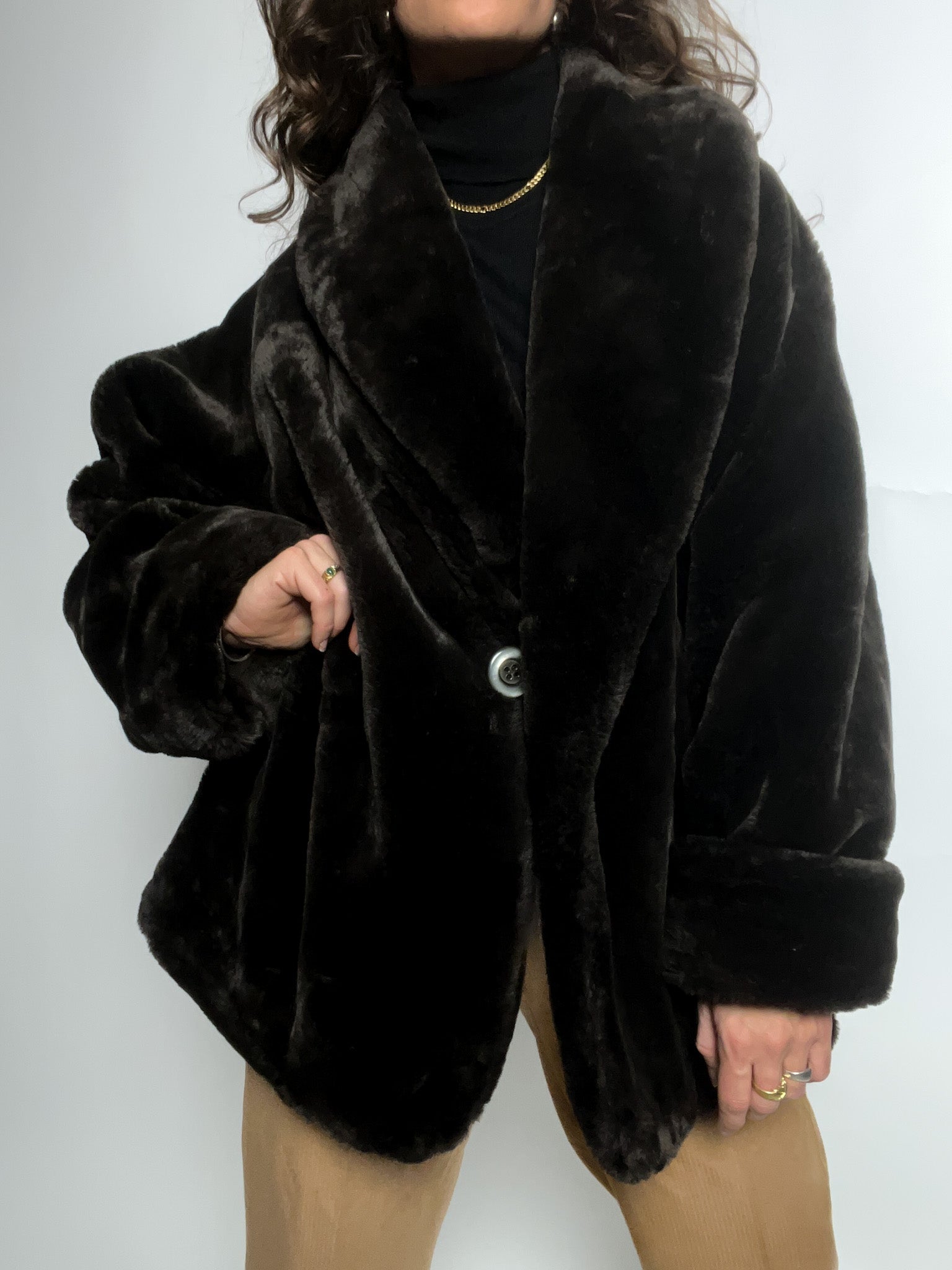 Vintage 90’s Dark Chocolate Faux Fur Coat with Deep Shawl Collar