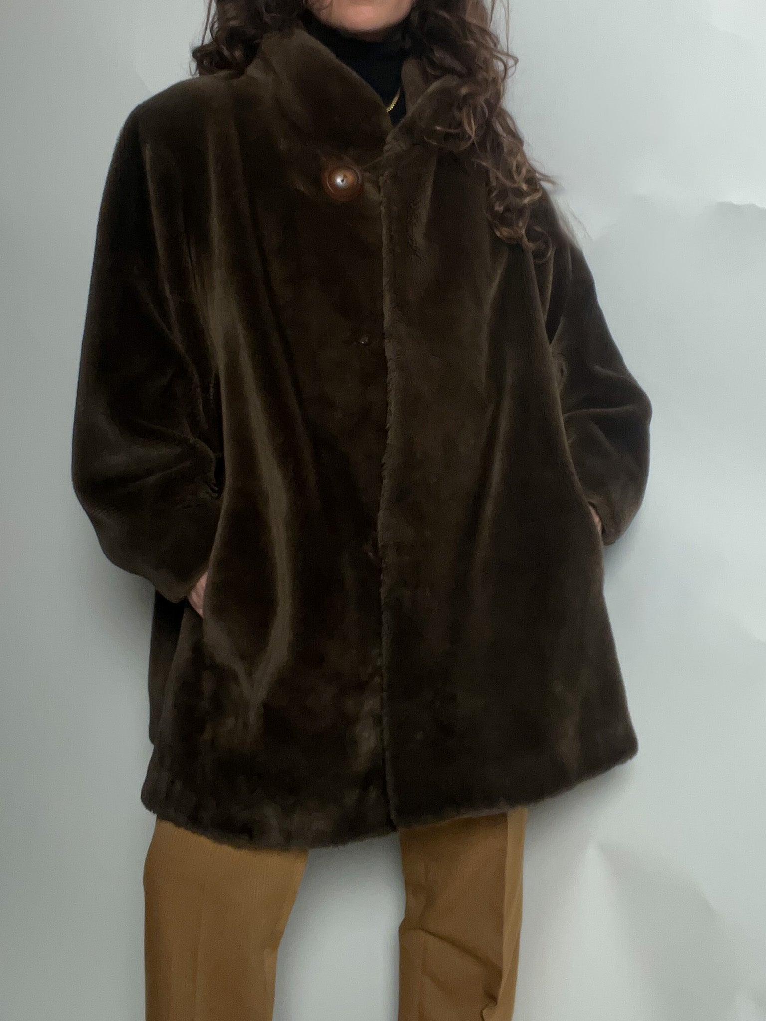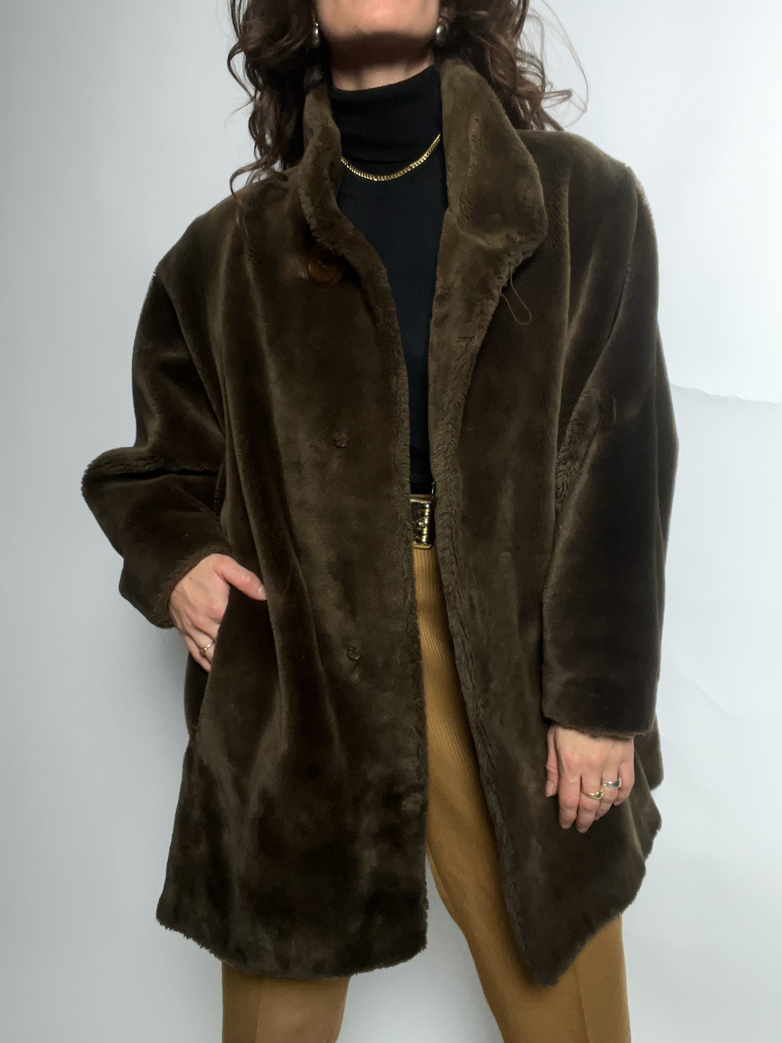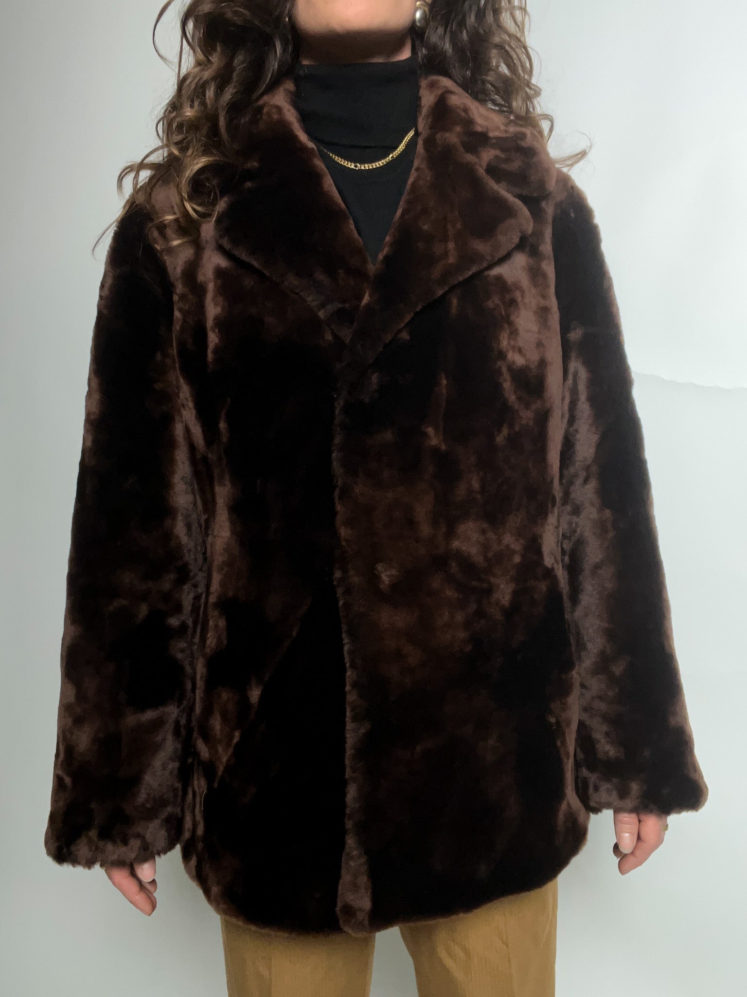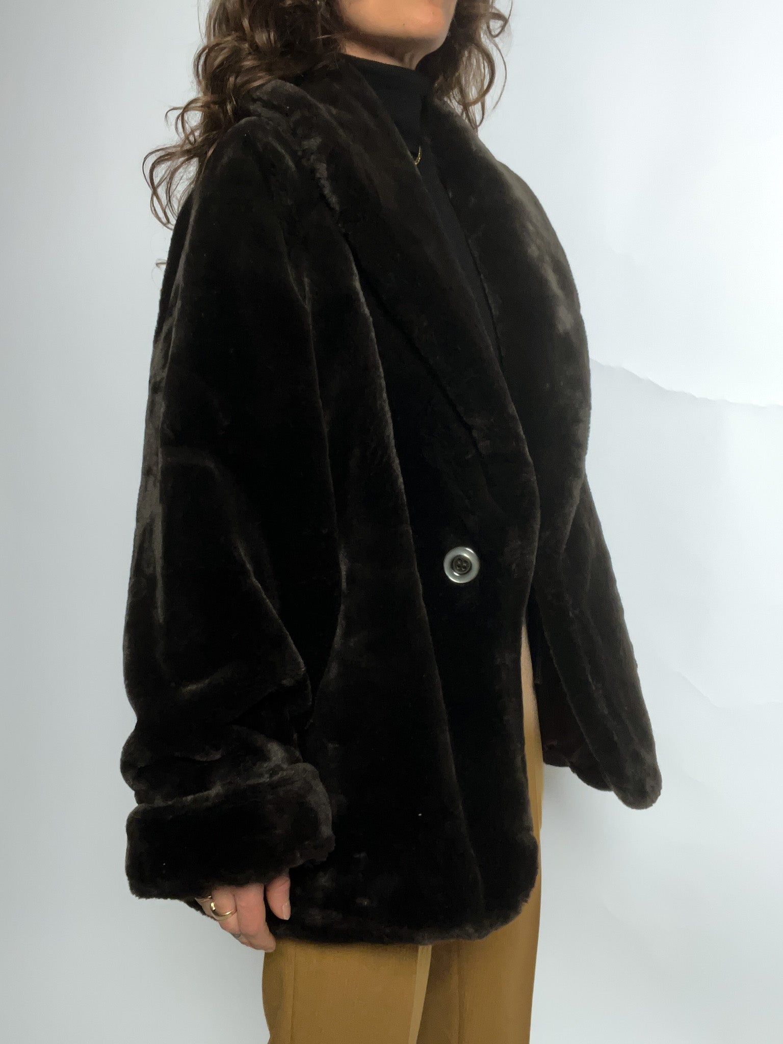Vintage 90’s Dark Chocolate Faux Fur Coat with Deep Shawl Collar