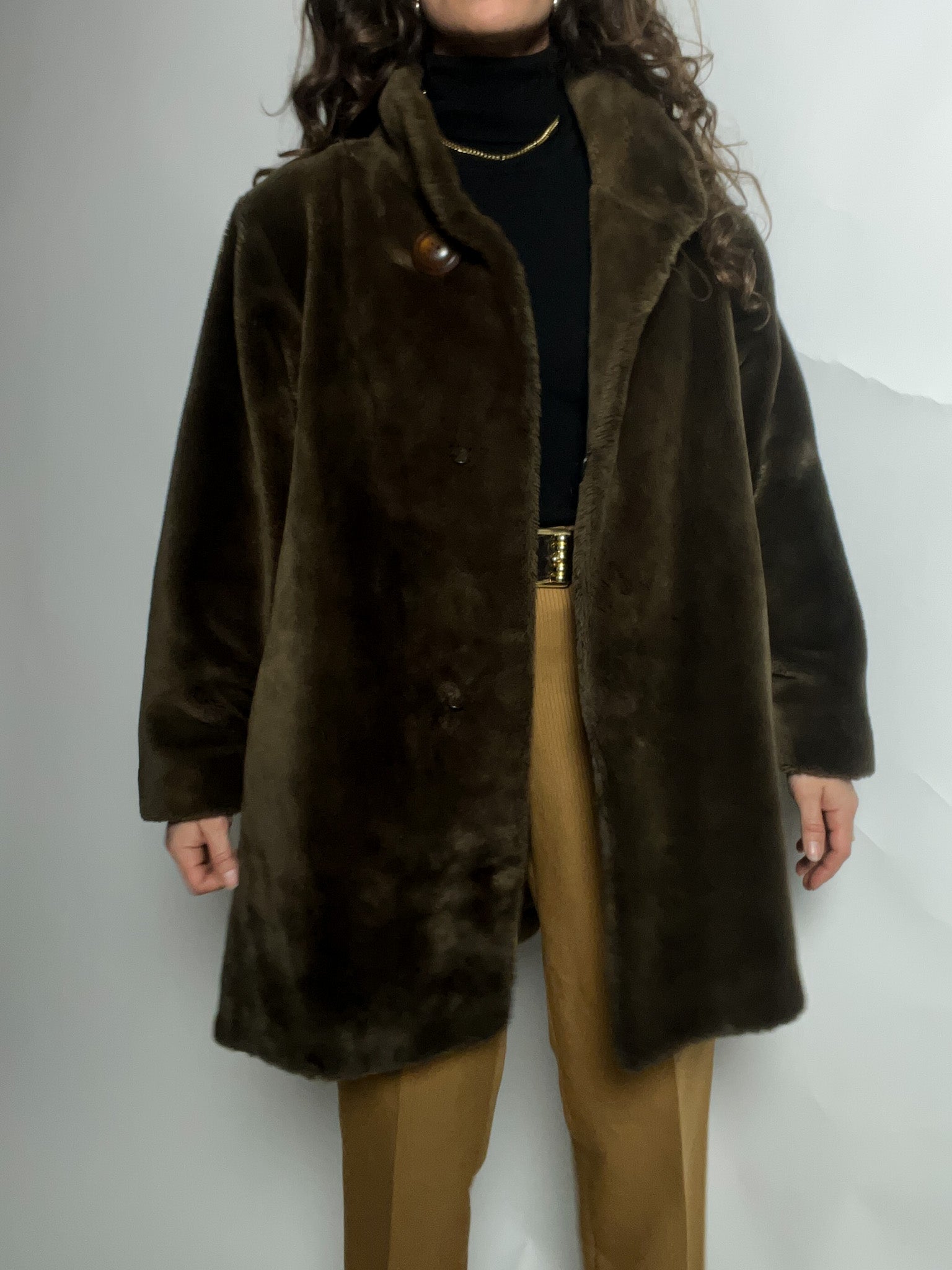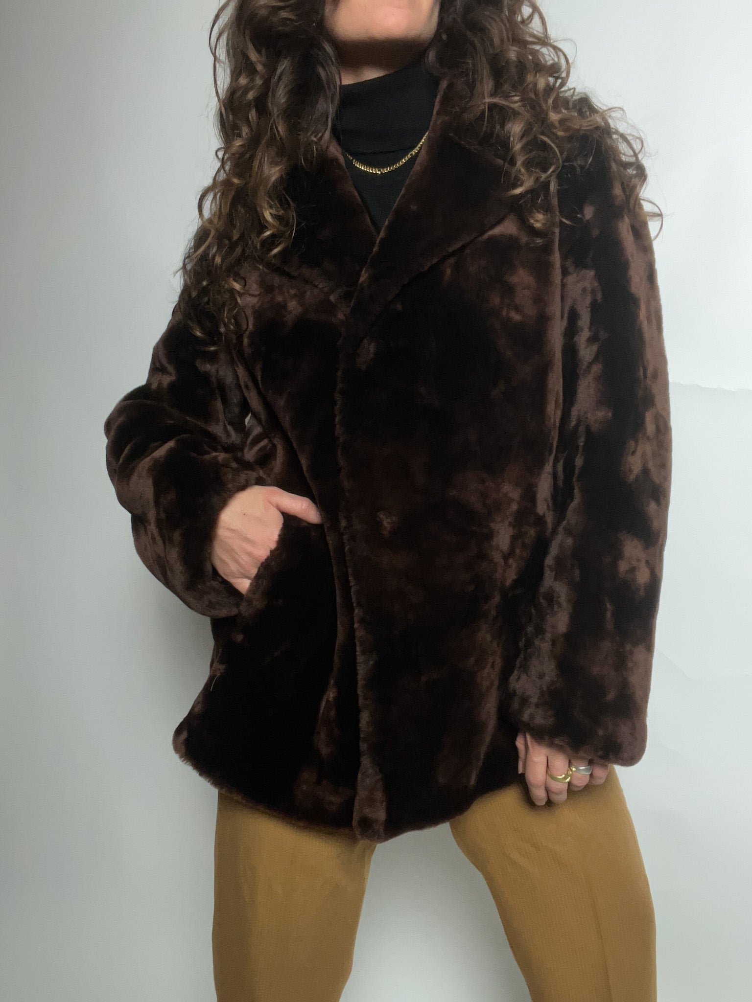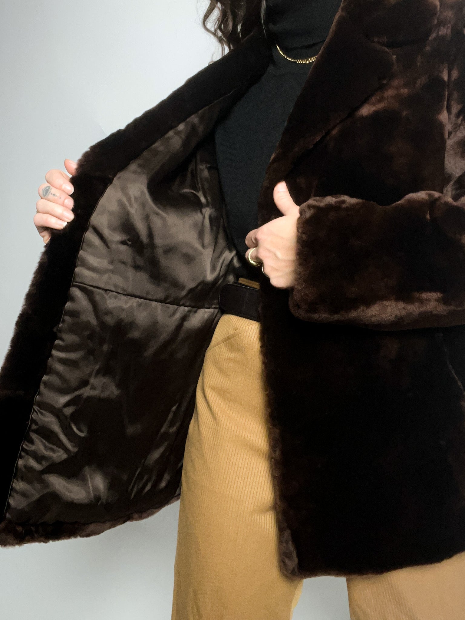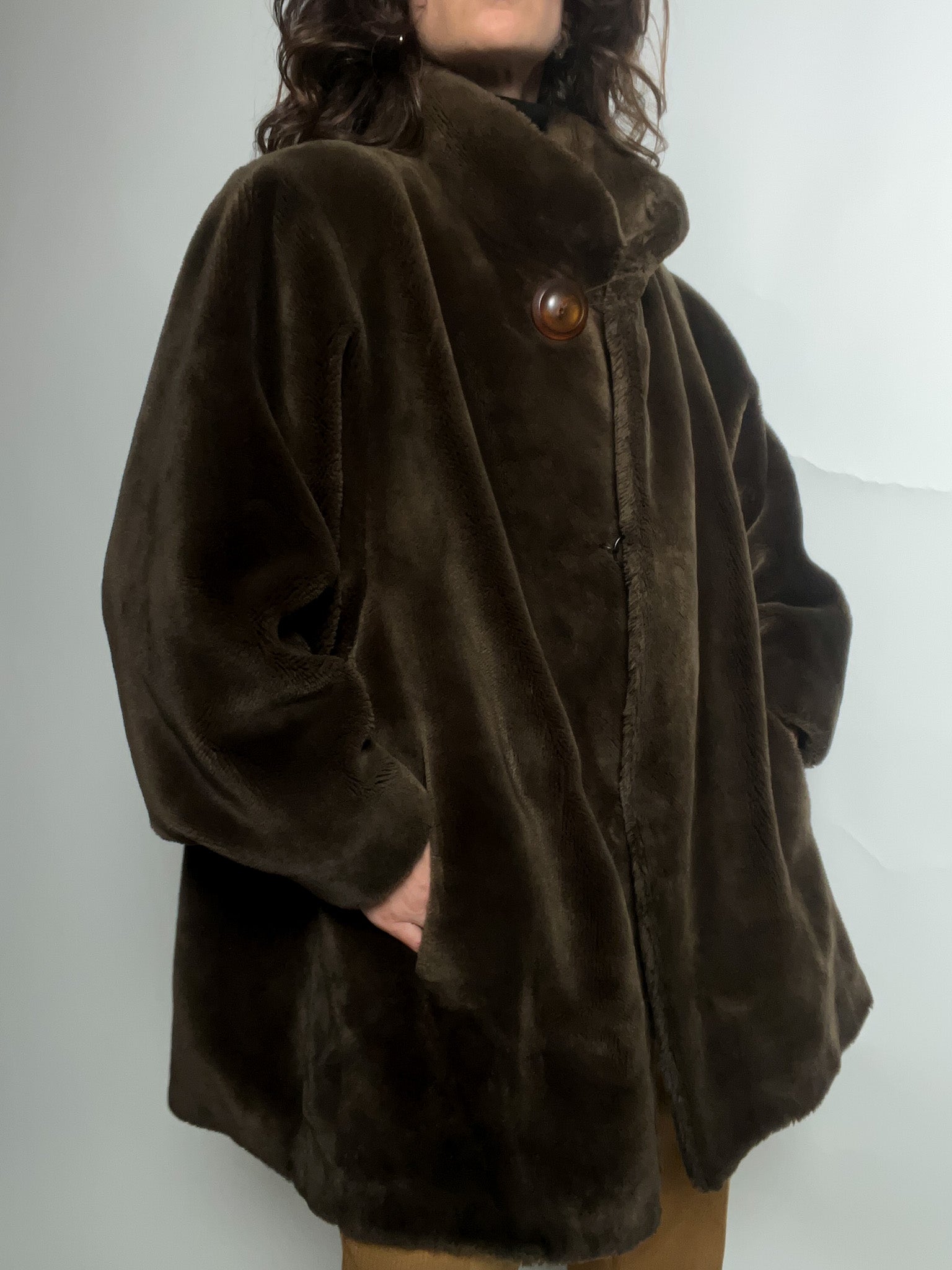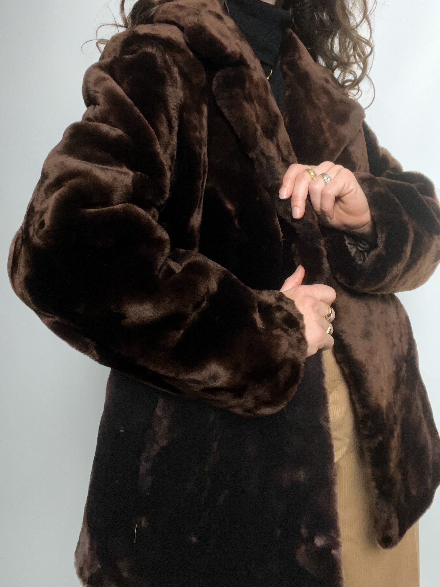 Vintage 90’s Dark Chocolate Faux Fur Coat with Deep Shawl Collar