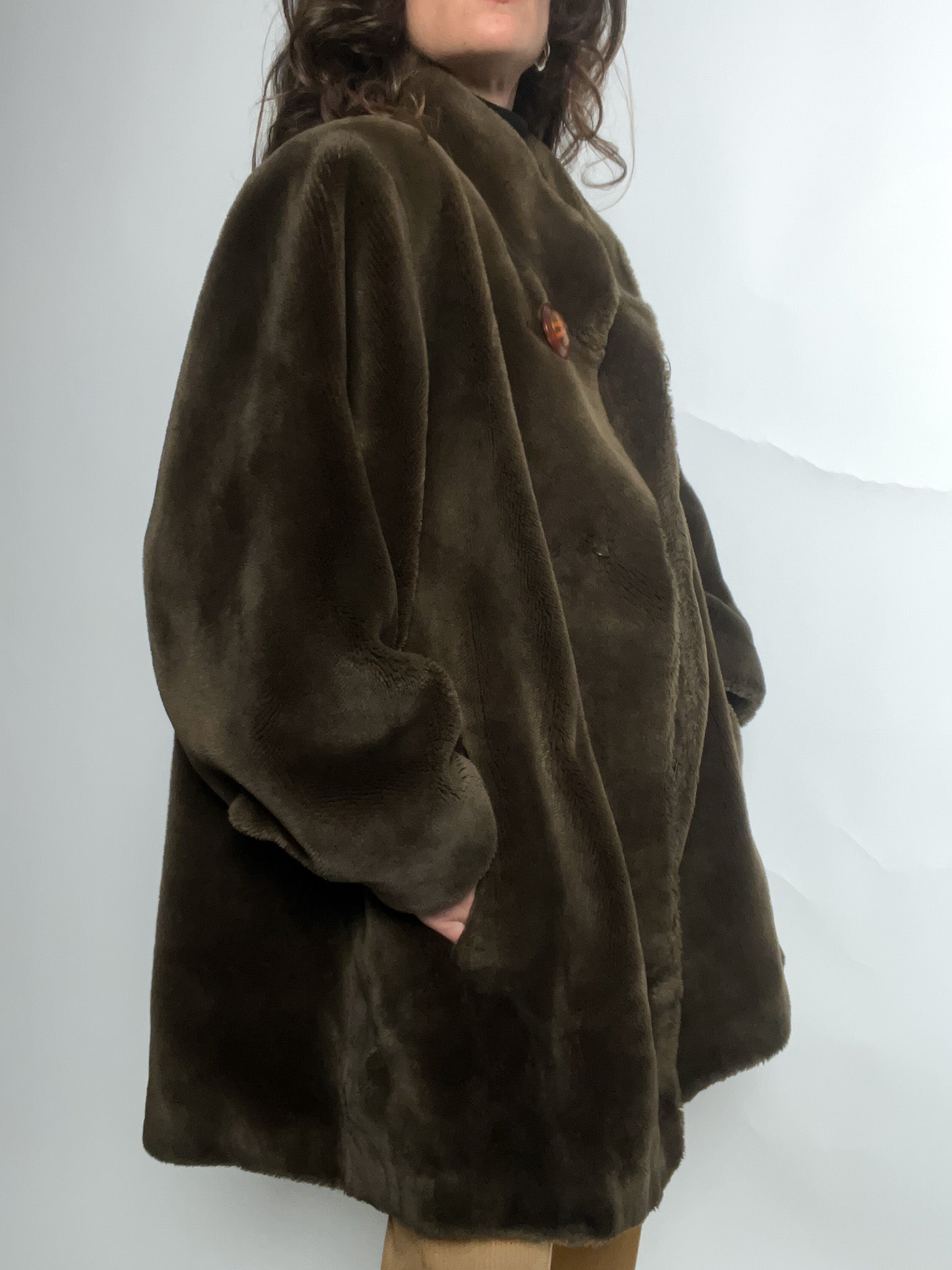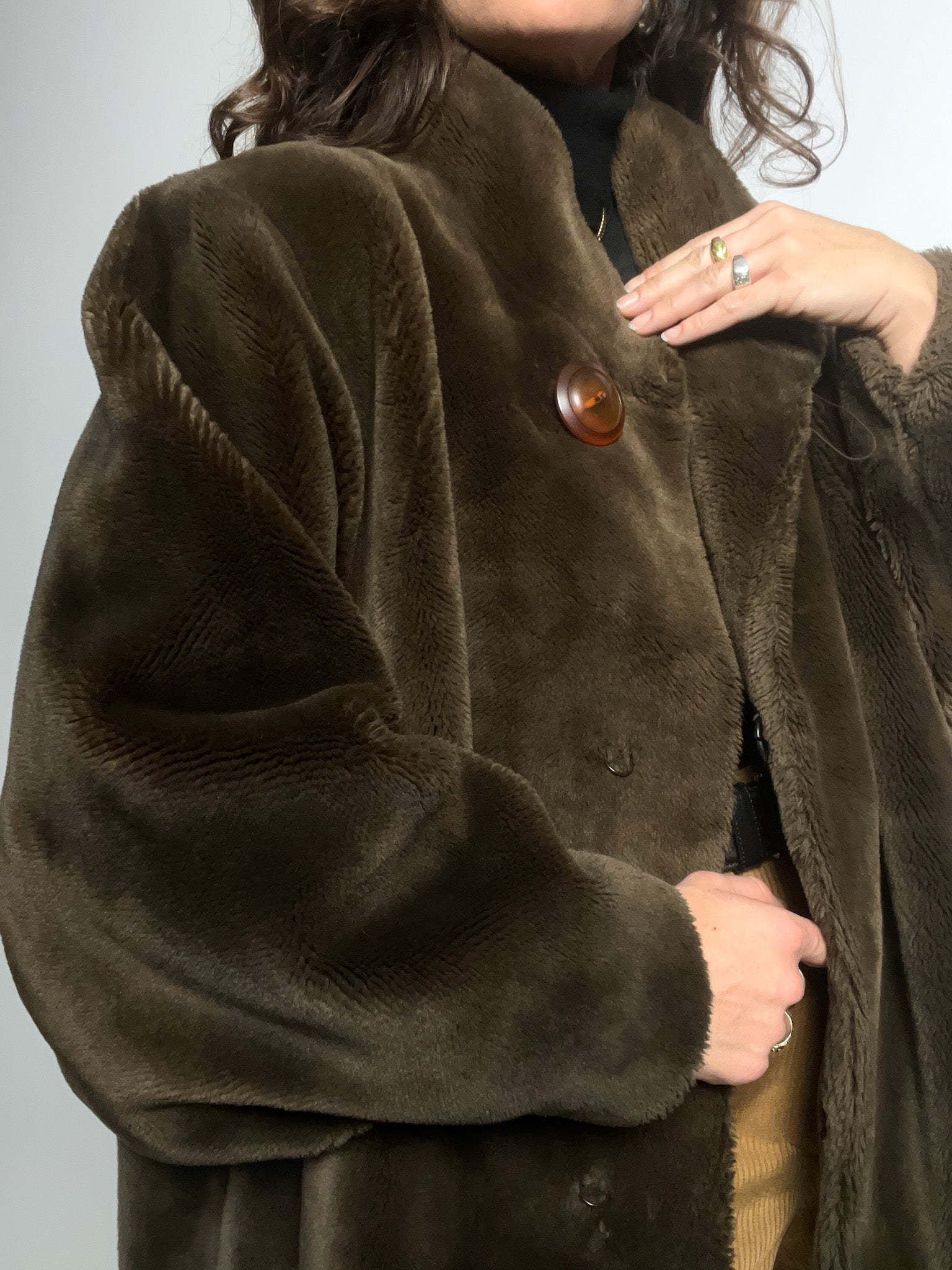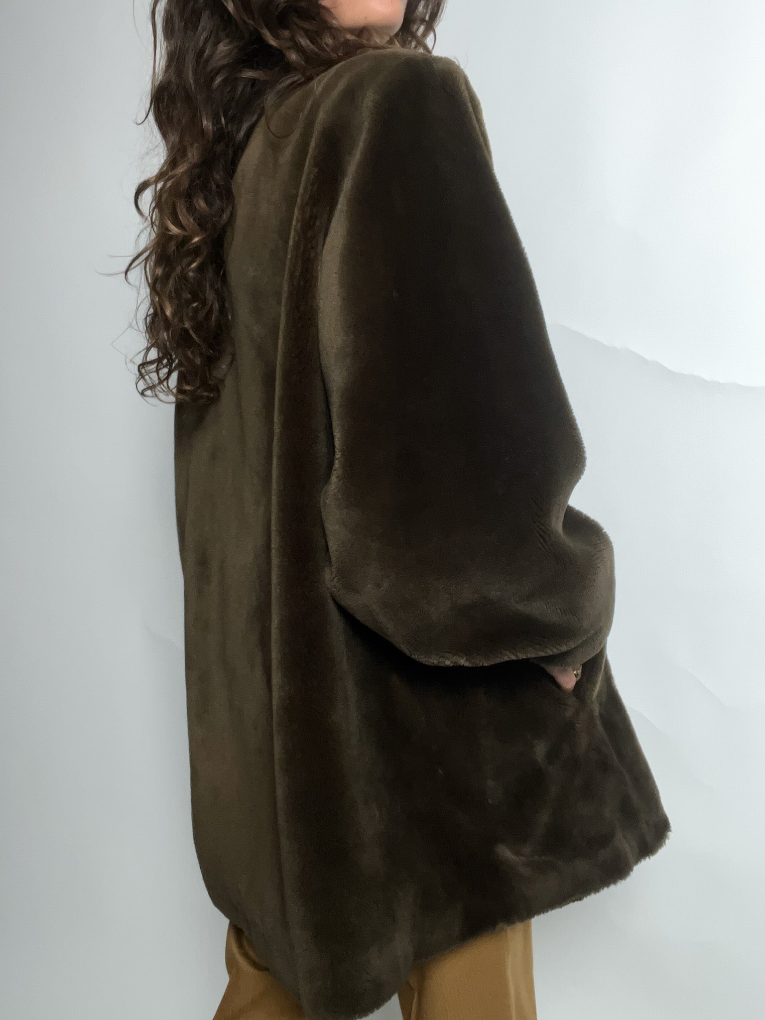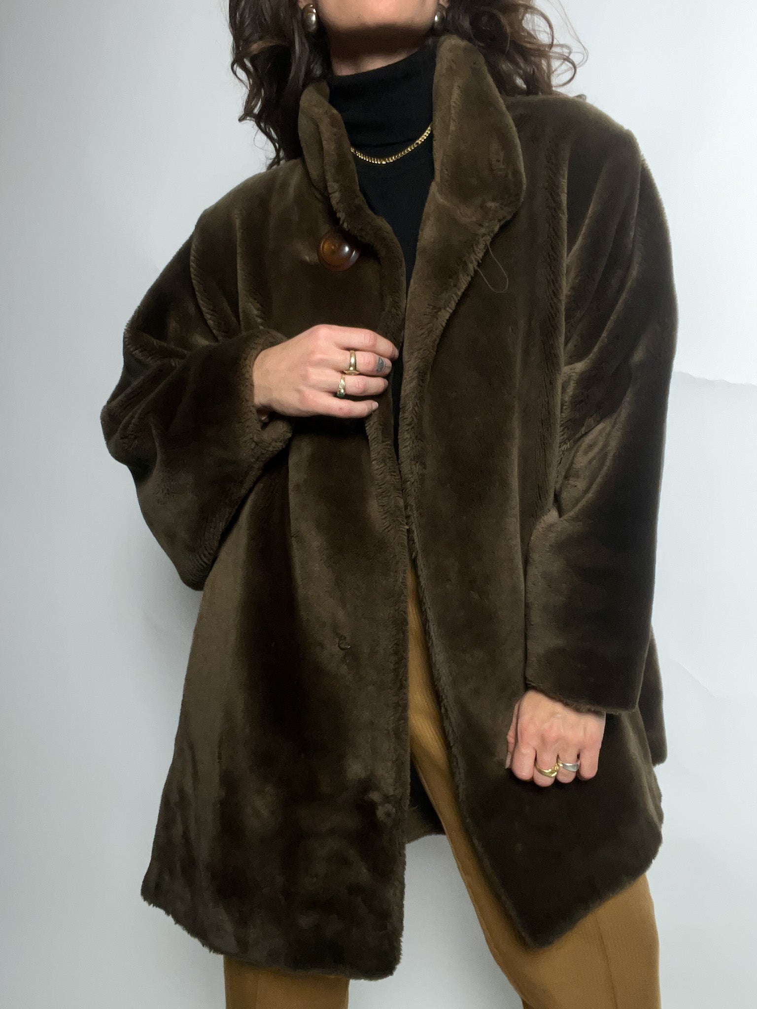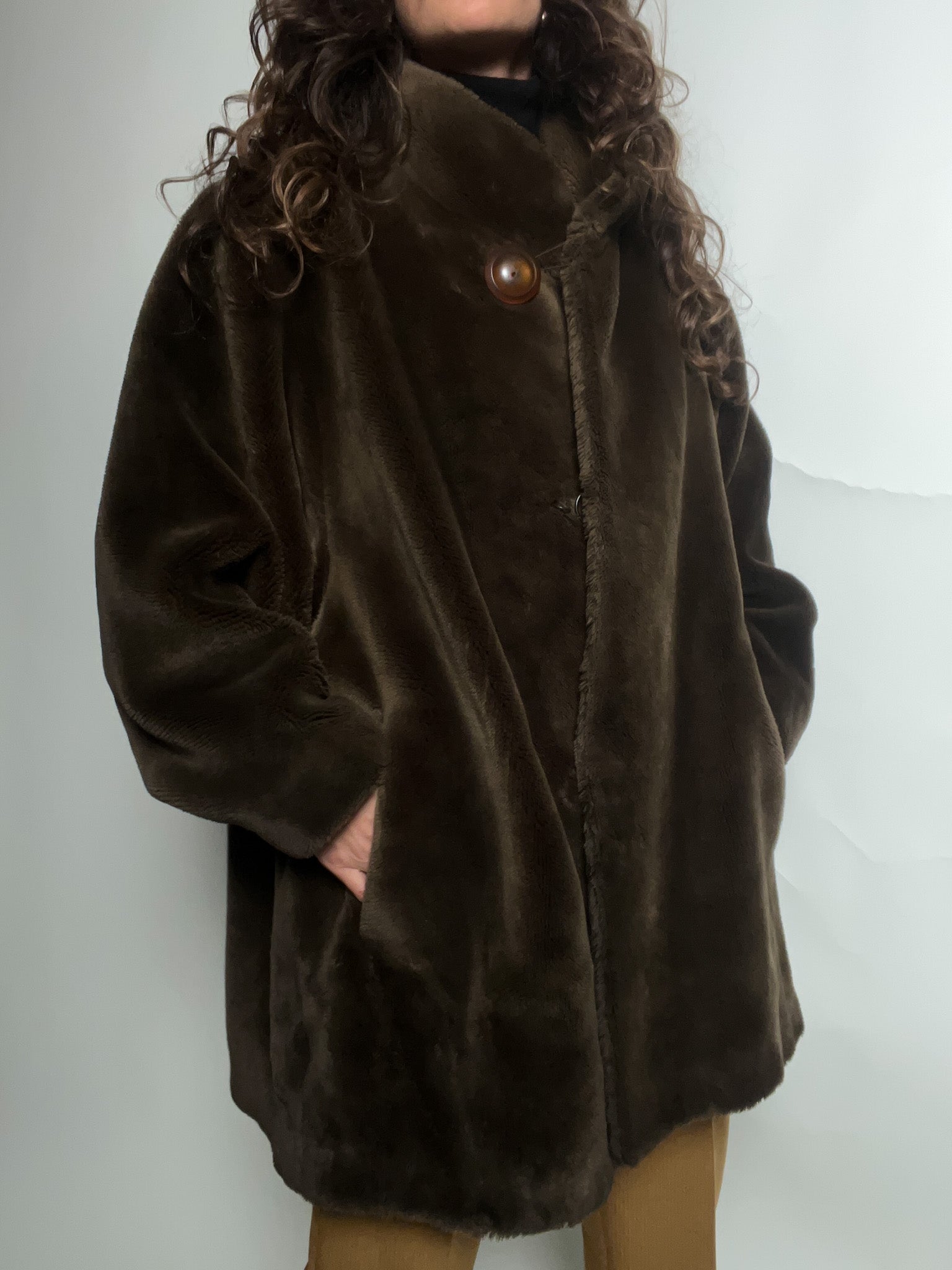 Vintage 90’s Dark Chocolate Faux Fur Coat with Deep Shawl Collar