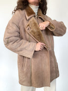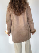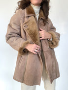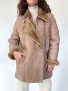 A warm embrace of soft suede and plush wool, this 70’s shearling coat radiates understated elegance. Its natural beige tone and clean, structured cut make it a timeless winter piece — effortlessly chic, undeniably authentic. The double-faced shearling construction ensures both warmth and durability, while the slightly oversized shape creates a flattering silhouette that feels both relaxed and confident. Every seam, collar curve, and fur-trimmed cuff reflects the meticulous craftsmanship of true vintage outerwear — designed to last, and to make a statement without trying.