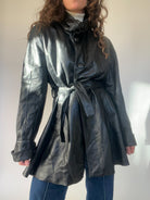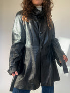 A striking 80’s silhouette that merges femininity and strength — this black leather coat features a flared cut that moves with attitude. Its high collar and sculpted structure bring that cinematic drama typical of the decade, while the belt subtly defines the waist. A statement piece for those who love bold shapes and timeless edge — designed for the women who own every room they walk into.
