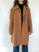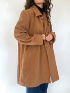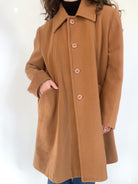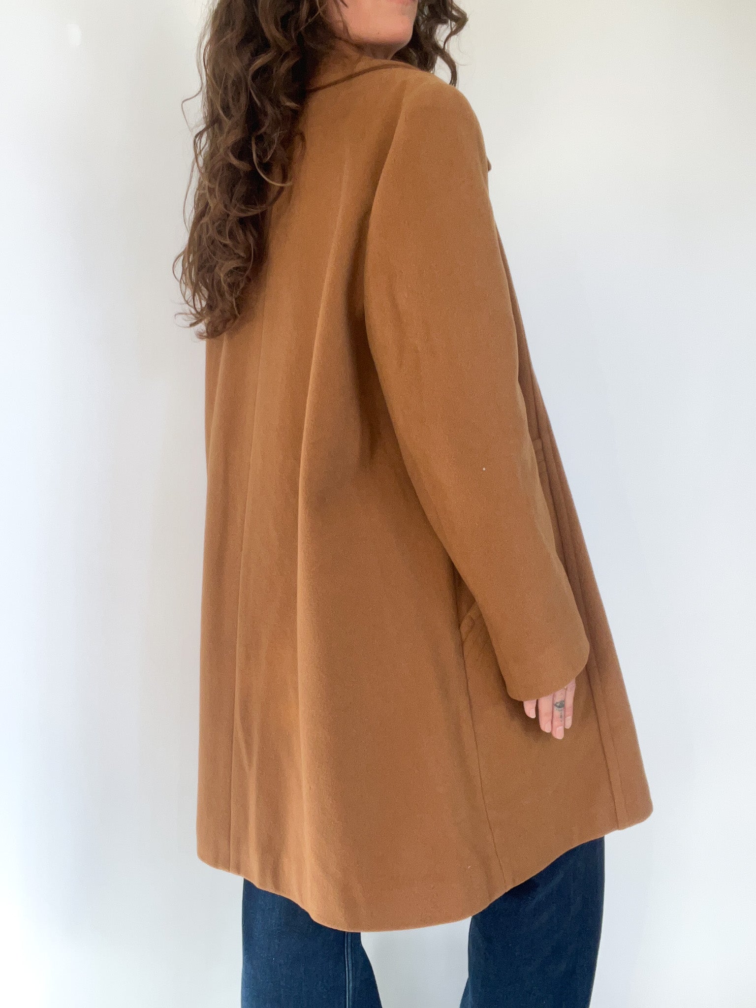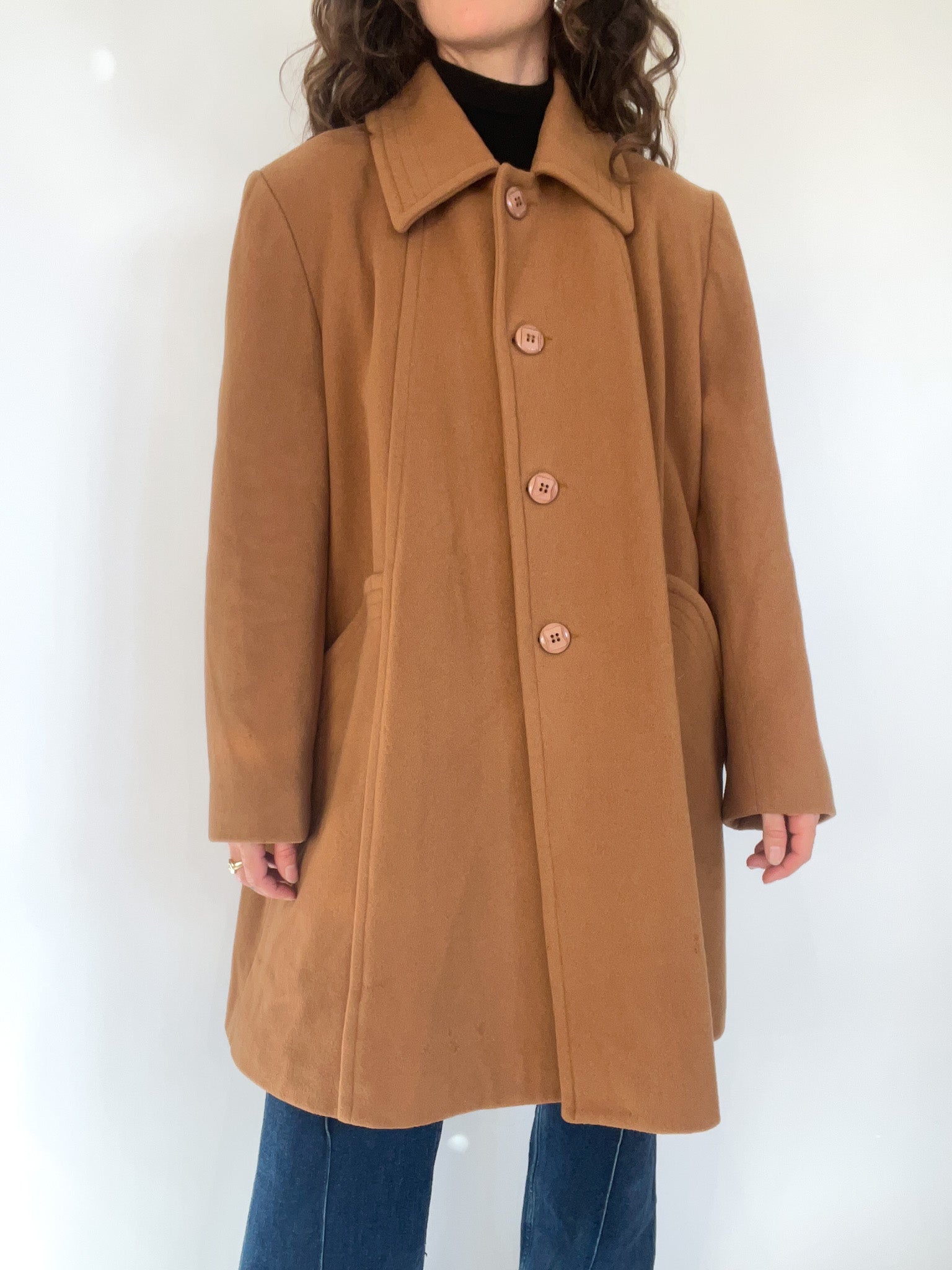 A beautiful expression of 1980s French refinement, this camel coat combines structure and softness in perfect balance. The slightly flared silhouette creates a graceful movement, while the rounded shoulders and large front pockets bring that touch of effortless charm. Its luxurious wool and cashmere blend makes it exceptionally smooth to the touch — an elevated essential that speaks of timeless quality and quiet confidence. A piece that embodies the heart of Skorpiones Vintage: distinctive, elegant, and full of character.
