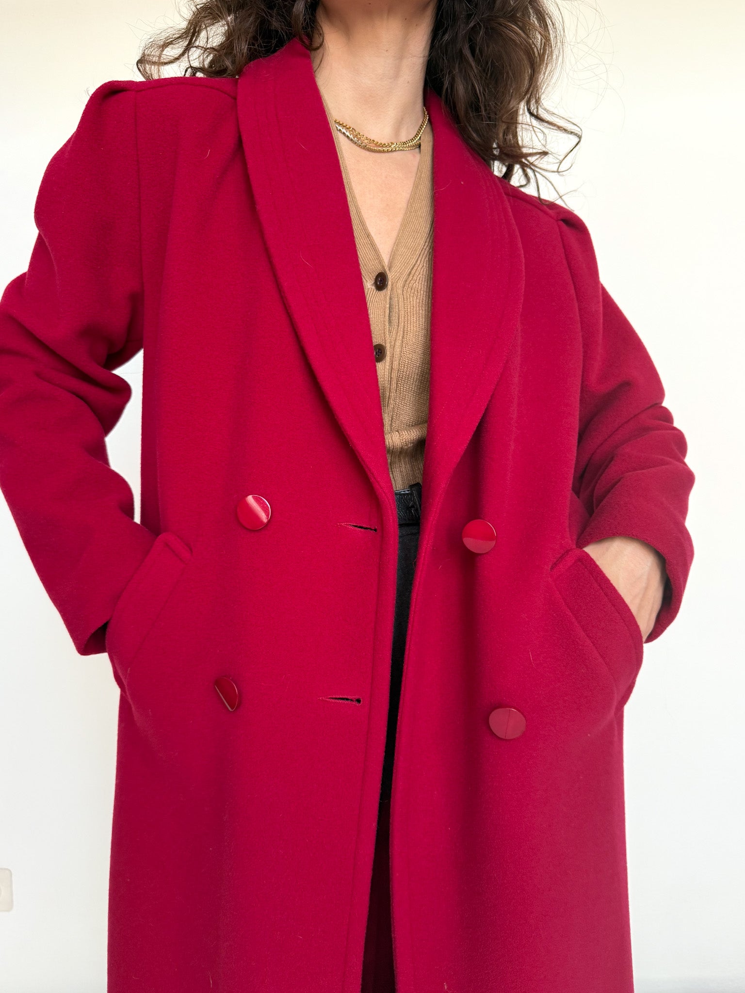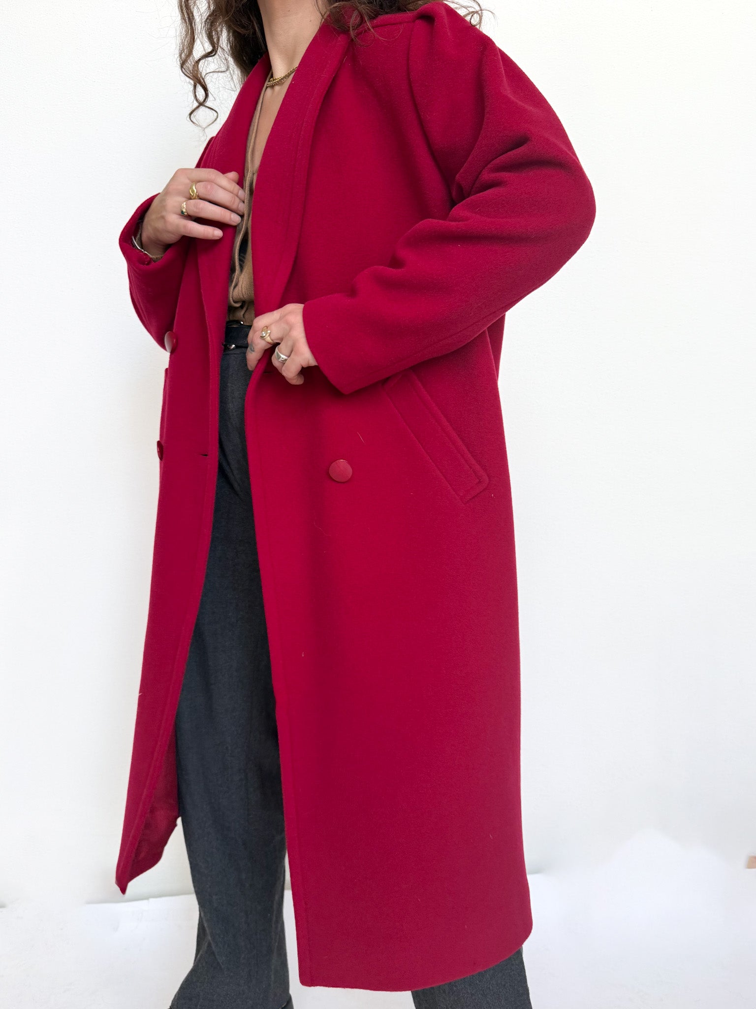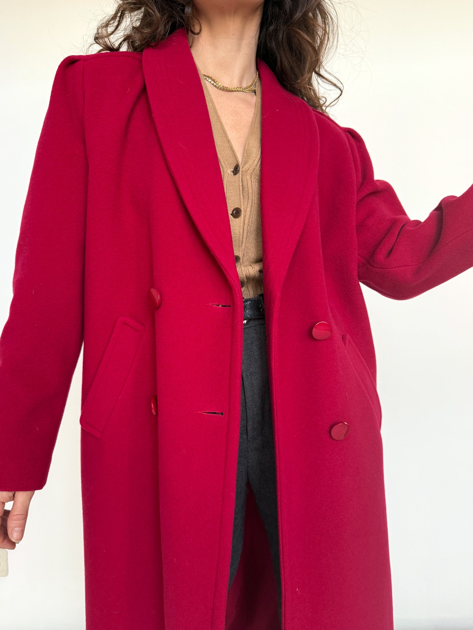 This vintage French coat stands out for its deep raspberry tone, both bold and incredibly refined. The structured double-breasted cut gives it a strong, elegant presence while remaining easy to wear every day. A timeless silhouette elevated by a vibrant color that instantly makes the look feel confident and polished. Chosen for its remarkable quality, its elegant construction and that rare balance between power and femininity.