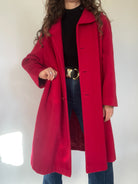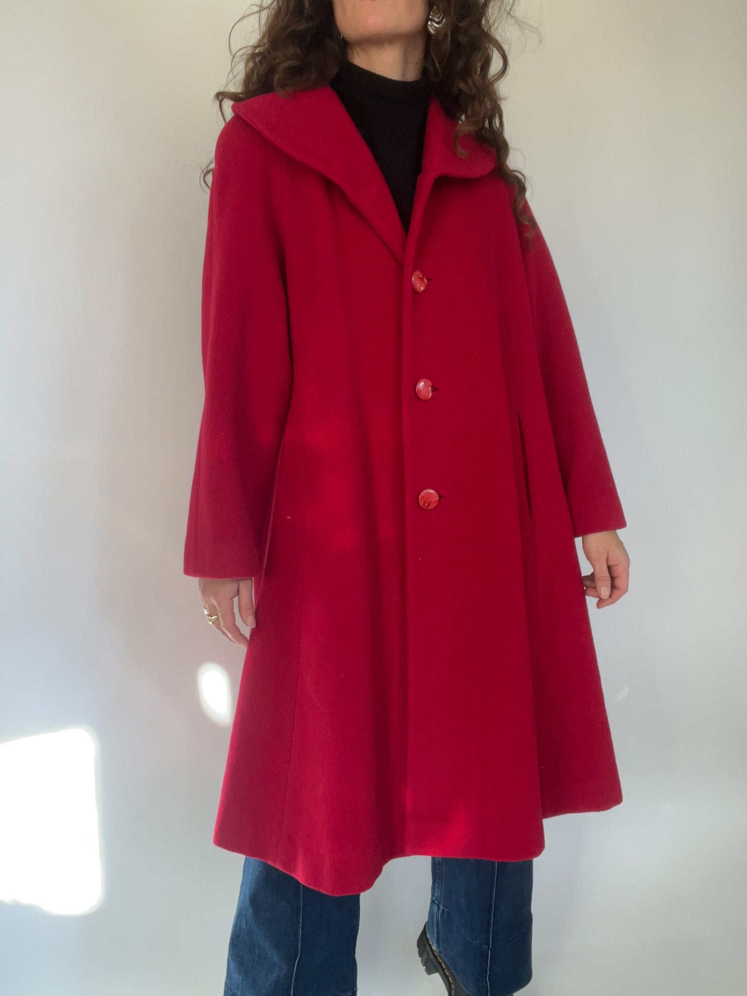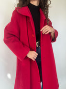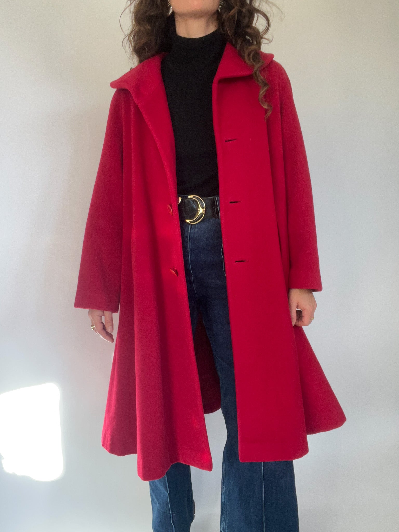 A bold yet timeless statement piece from the 1980s Italian wardrobe. This coat stands out for its sculptural collar and fluid A-line silhouette, offering both warmth and elegance. The vibrant red hue evokes confidence and femininity, while the wool–mohair blend gives it a soft, rich texture that moves gracefully with every step. Designed for the woman who dares to stand out while staying true to classic sophistication — the perfect embodiment of Skorpiones Vintage’s spirit: distinctive, empowering, and forever iconic.