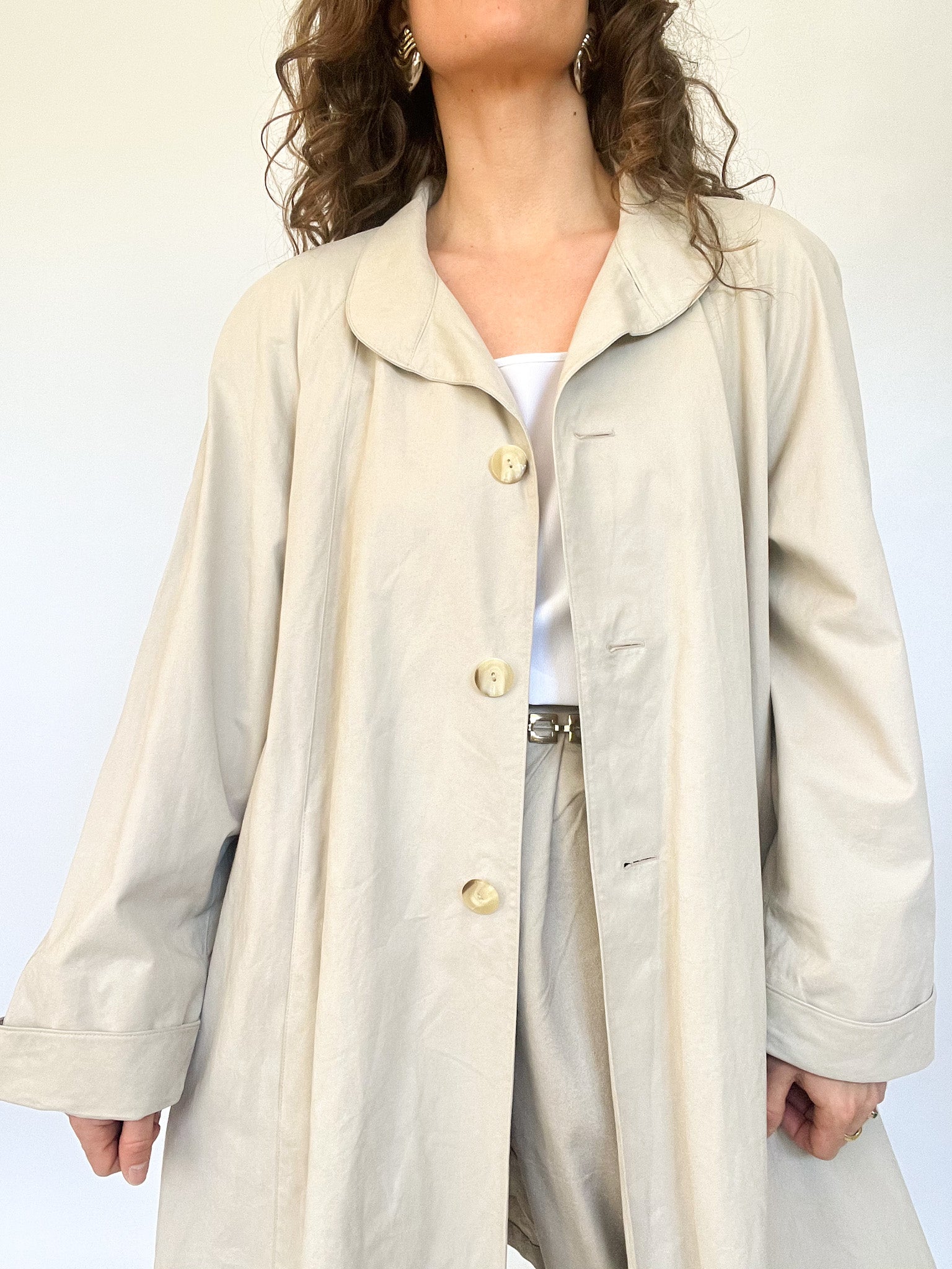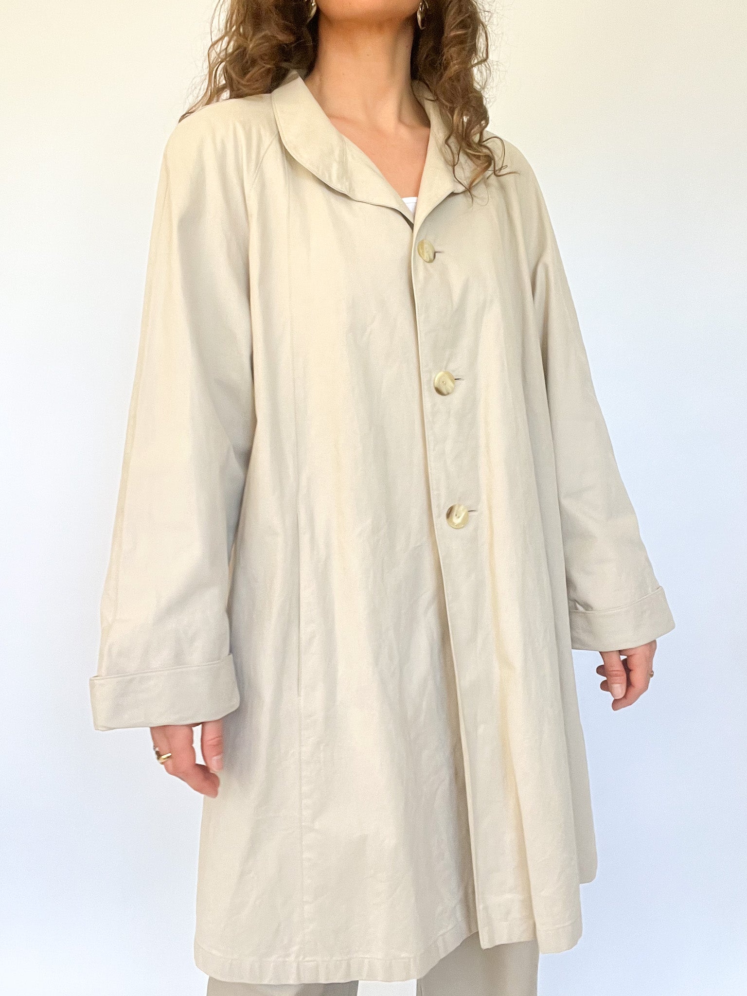Subtle drama meets understated quality in this wide-fit vintage trench. Made in Switzerland, it features an airy cotton fabric and flowing silhouette, ideal for layering across seasons. Its soft structure and button front embrace the art of simplicity—an elegant ally for breezy walks and timeless outfits.