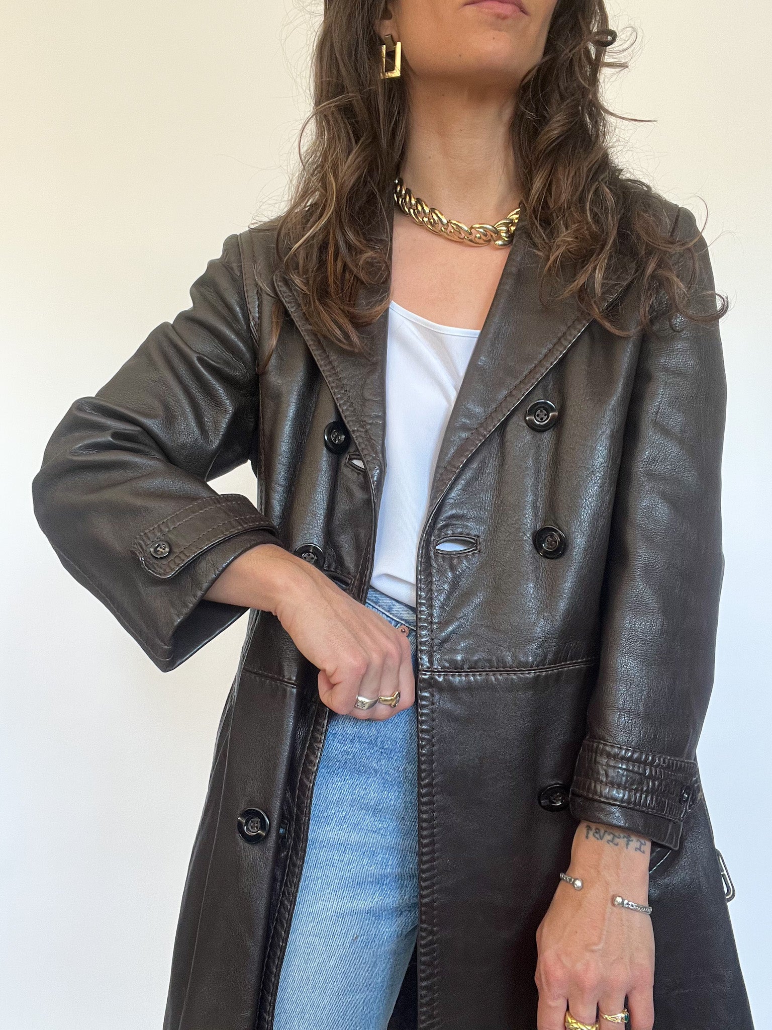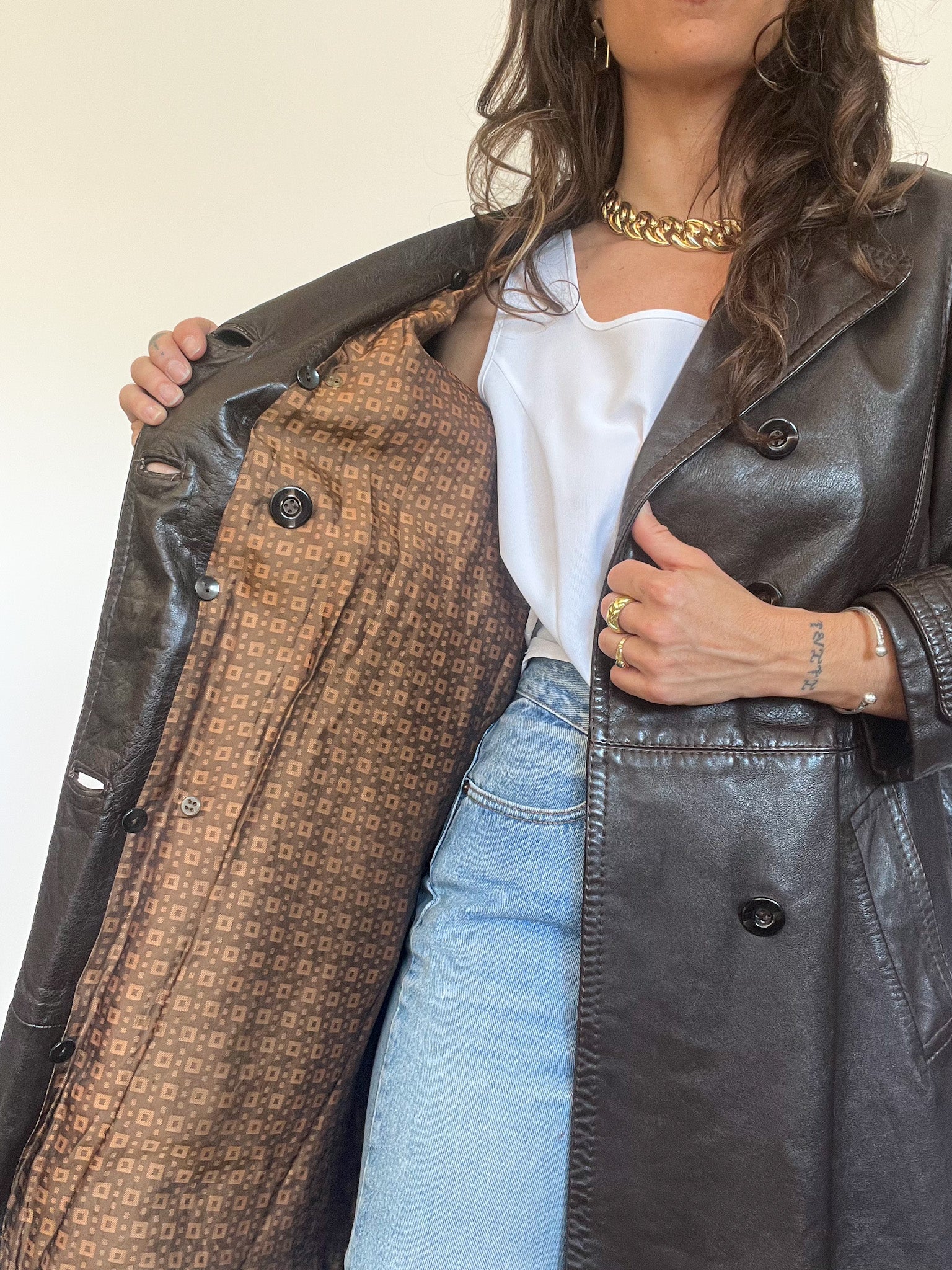Bold, structured and iconic. This vintage leather trench from the 80s brings a powerful silhouette in a deep chocolate tone, softened by its satin monogram lining. Featuring a sharp collar, double-breasted front and detachable belt, it’s the kind of piece that turns heads while standing the test of time. Made for those who want to express strength with elegance.