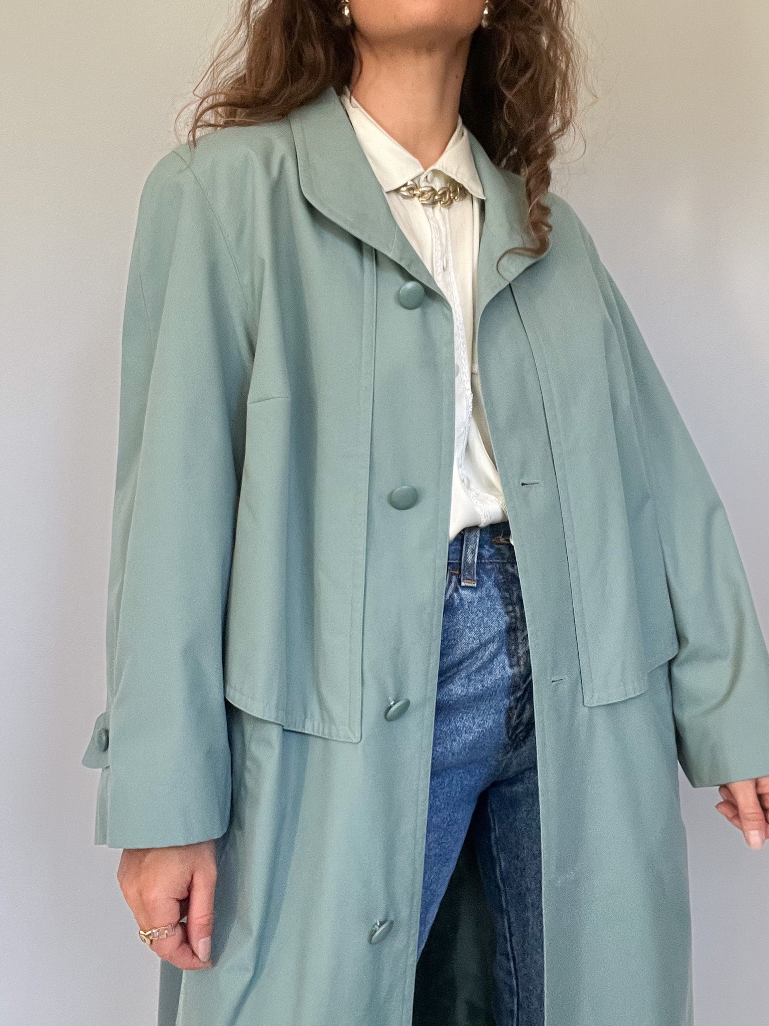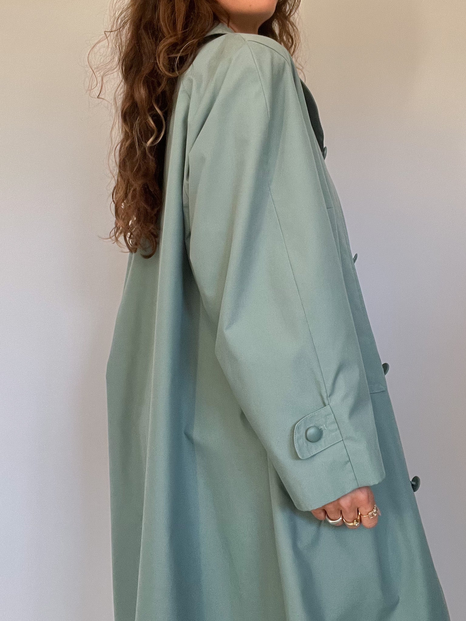 A statement trench in a rare mint green hue, designed with clean lines and a timeless silhouette. Its lightweight cotton-polyester blend makes it ideal for transitional weather, while the covered buttons and unique collar add a refined touch. A piece that speaks of quiet confidence and individuality — echoing Skorpiones Vintage’s mission to deliver unique and empowering garments.