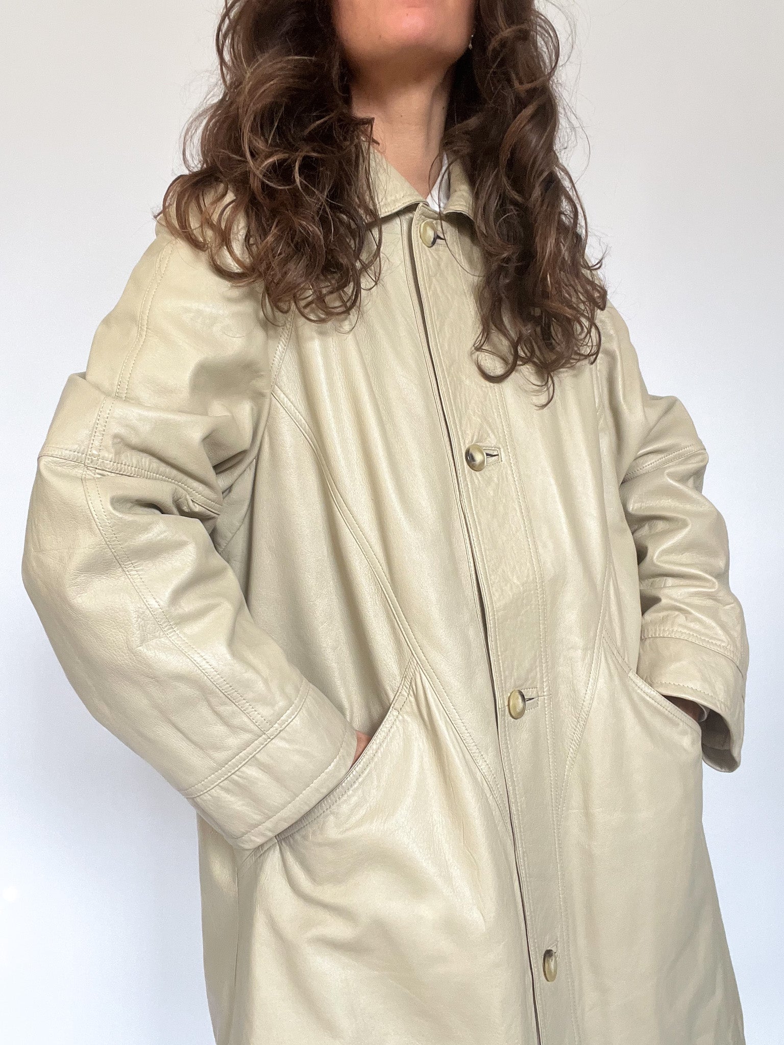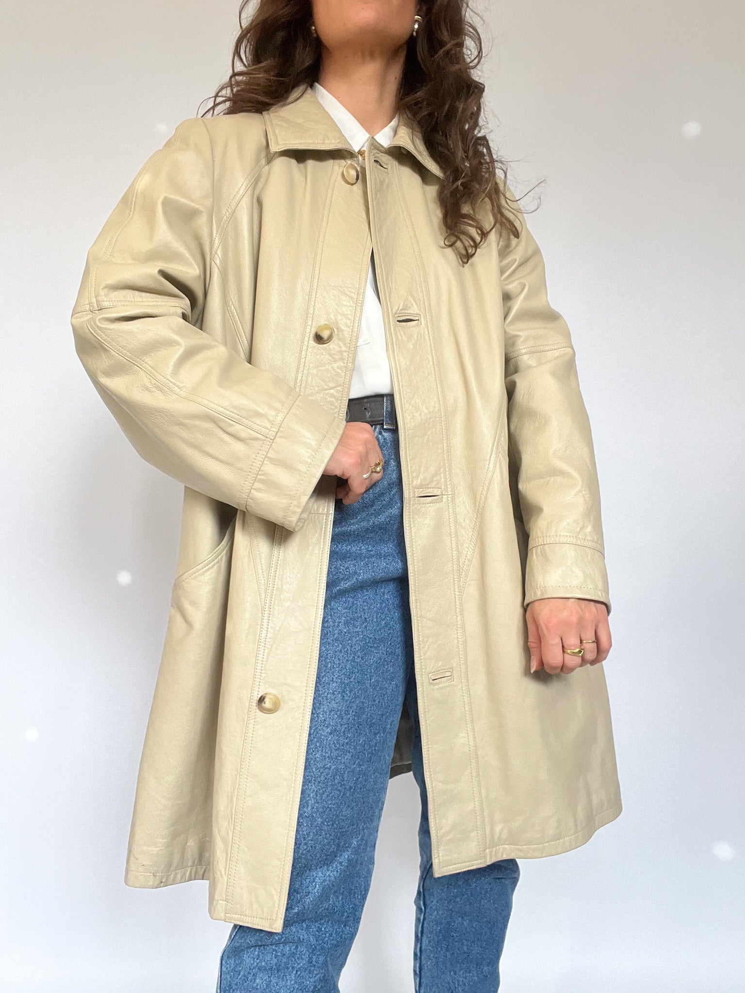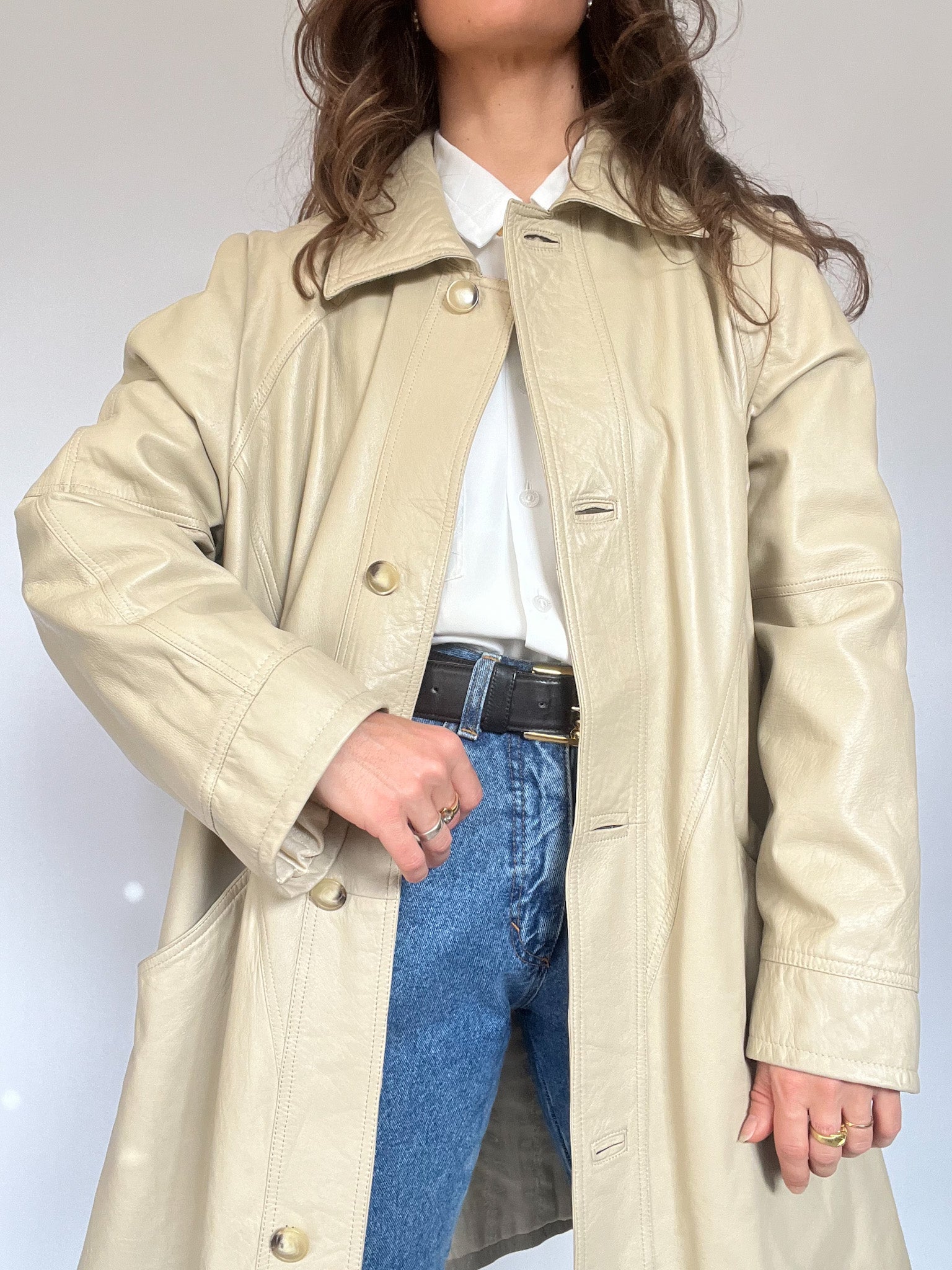This rare Italian-made leather coat stands as a timeless symbol of understated elegance. Crafted from a supple beige leather with a soft, natural sheen, it offers a refined silhouette and impeccable structure. The clean lines and luxurious finish reflect the essence of Italian craftsmanship – effortless, distinctive, and built to last. A versatile piece with that subtle wow effect, perfect for women who value character over trends.