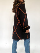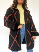 A statement vintage piece with a unique geometric design, this black and brown shearling coat blends warmth and style effortlessly. The oversized cut and bold contrast of soft black shearling against brown suede-like paneling create a striking visual effect. With a zip closure and cozy shearling-trimmed cuffs, this coat is designed to keep you warm while making a bold fashion statement.