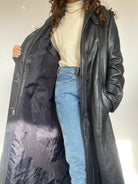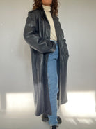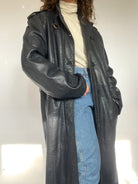 A striking longline leather trench coat that channels effortless vintage cool. Its structured silhouette and subtle military-inspired detailing make it a versatile statement piece, perfect for layering over any outfit.
