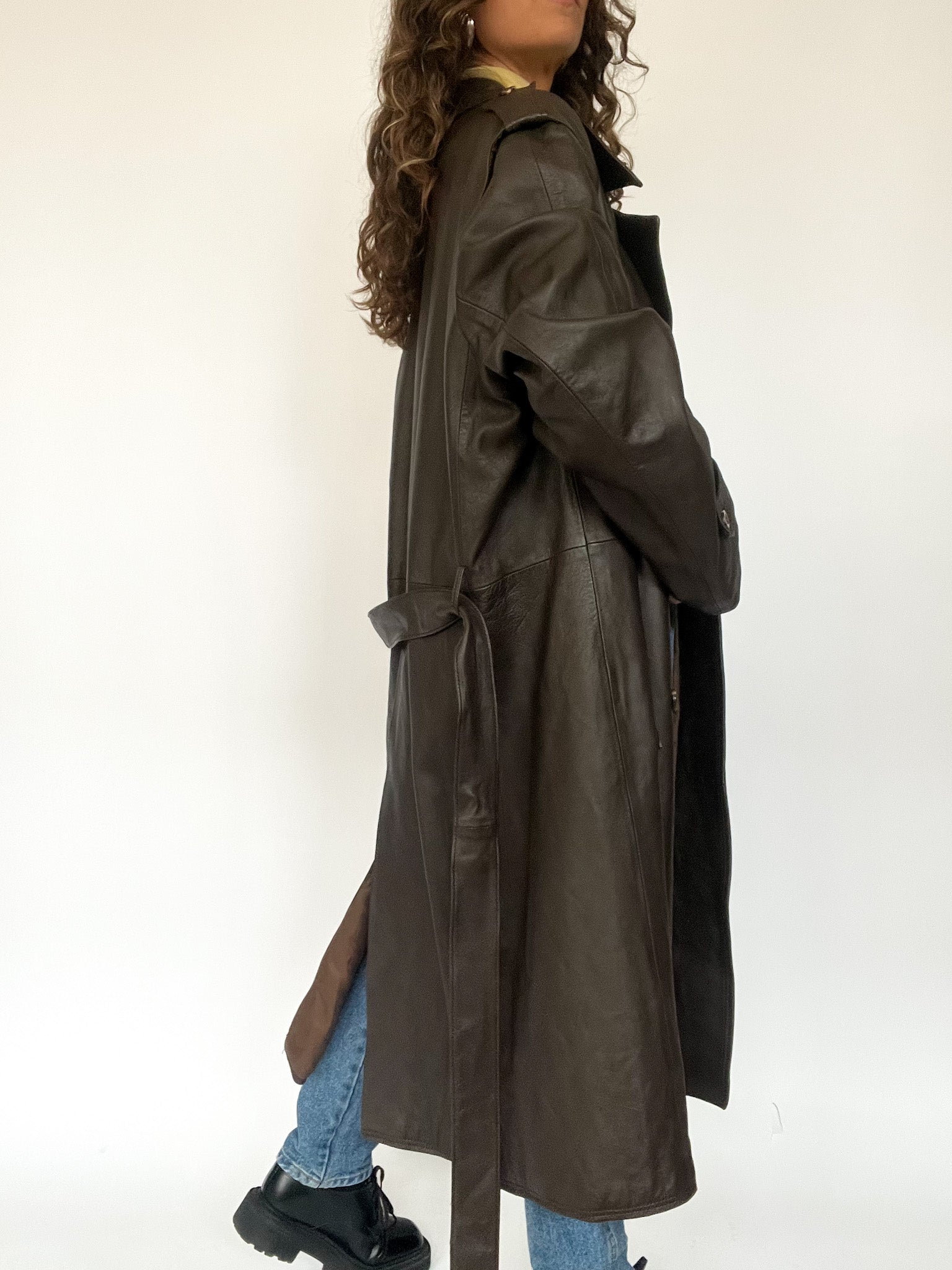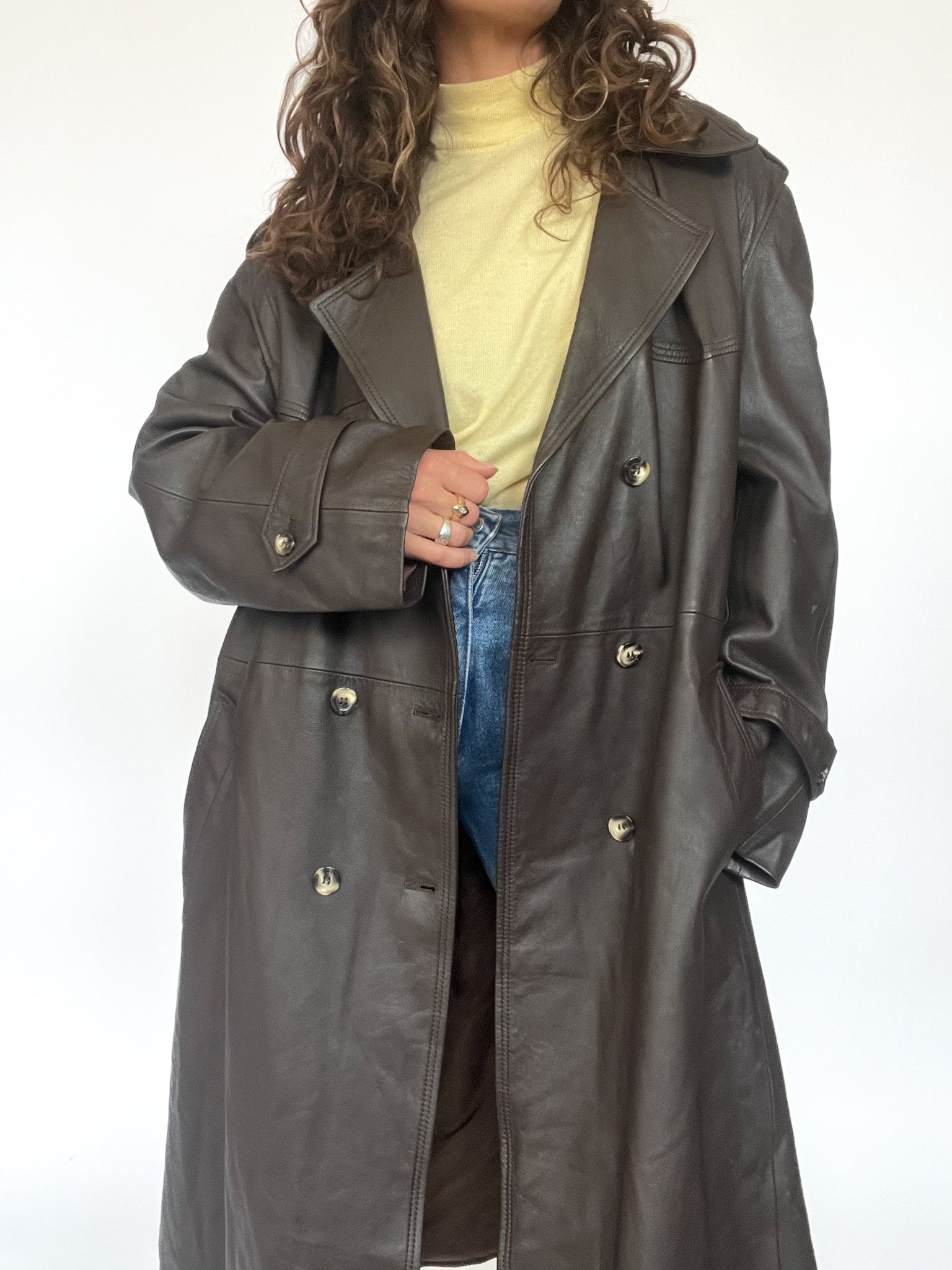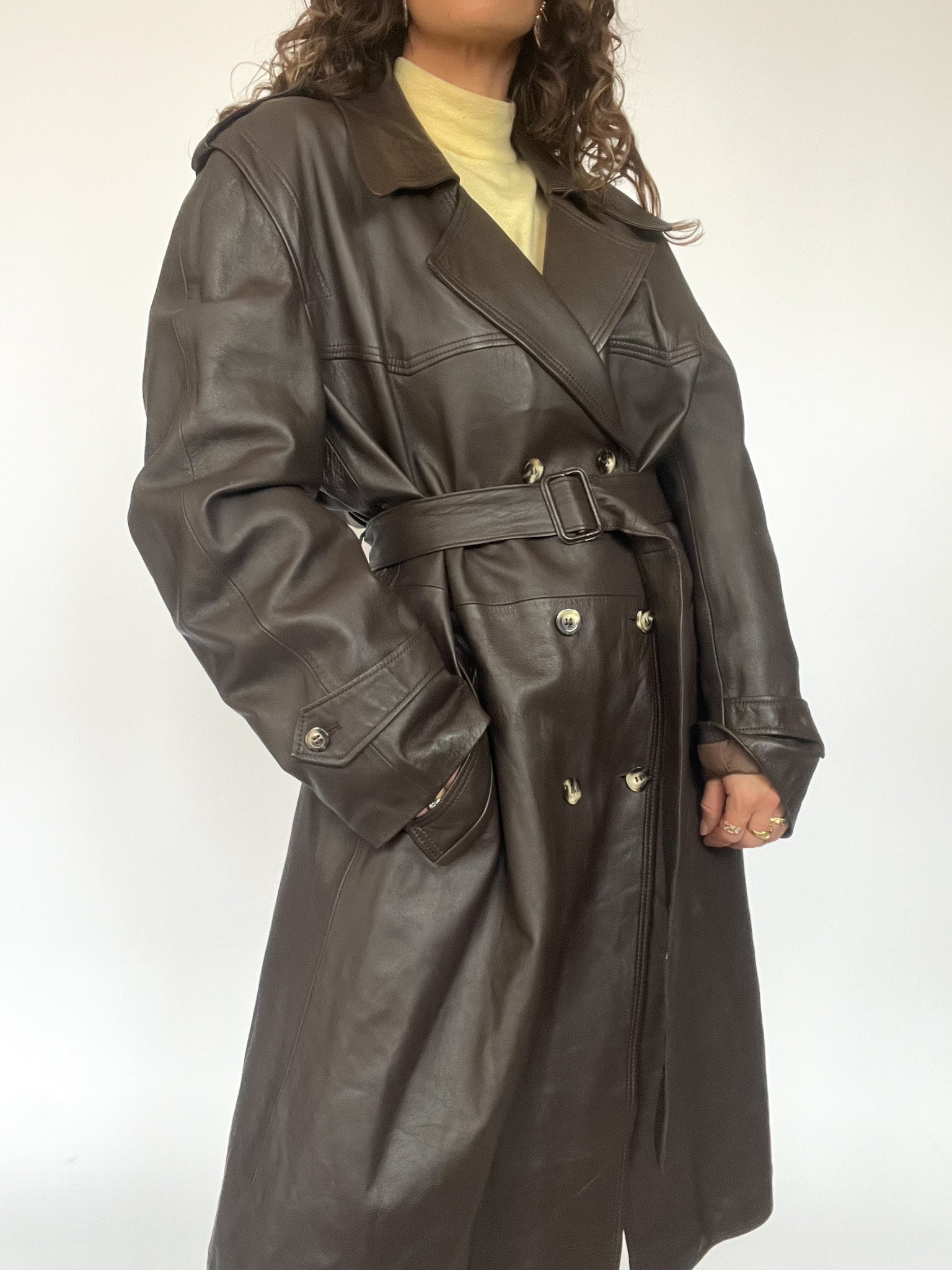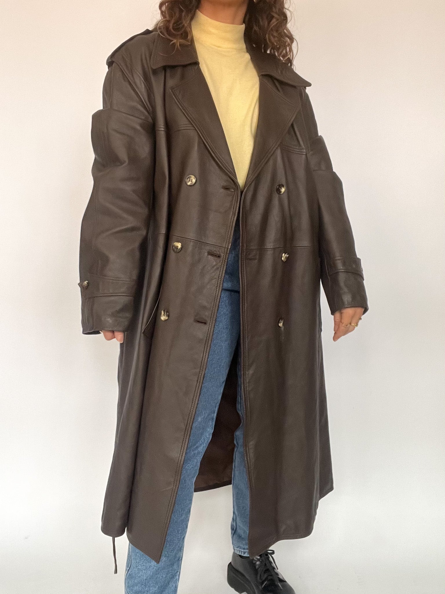 An iconic vintage brown leather trench coat that embodies timeless elegance with an edge. Crafted from supple leather with a deep, rich brown hue, this coat features a sophisticated double-breasted design, sharp lapels, and structured shoulders for a striking silhouette. The belted waist allows for a cinched or relaxed fit, making it both versatile and effortlessly chic. A true statement piece that seamlessly blends classic tailoring with bold attitude.