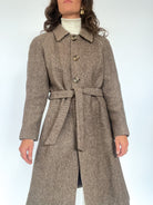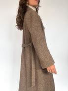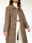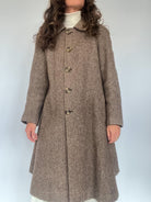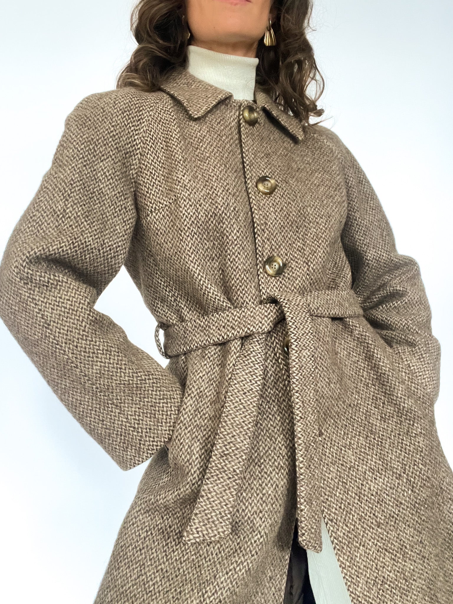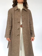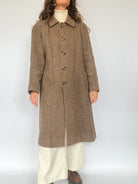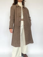 Step into timeless elegance with this vintage wool coat, designed to keep you warm while exuding sophistication. The herringbone pattern in earthy tones adds a refined touch, while the tailored cut ensures a flattering silhouette. Perfect for layering over winter outfits, this coat is a staple for the cold season.