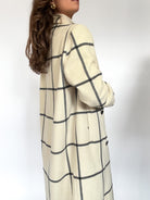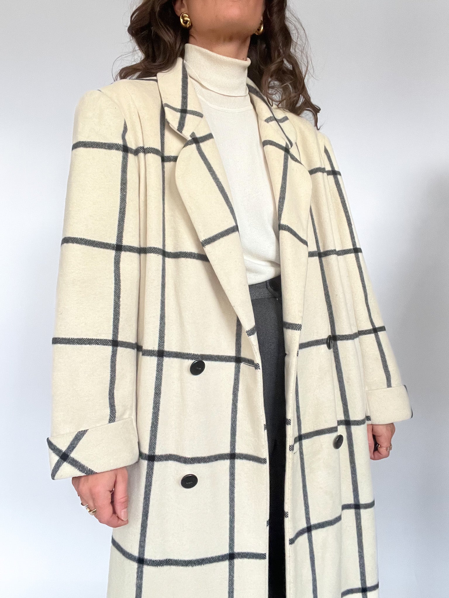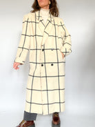A statement vintage coat in a luxurious cream hue, featuring a bold black windowpane checkered pattern. Its oversized, double-breasted design and structured lapels bring a refined yet effortlessly chic silhouette.