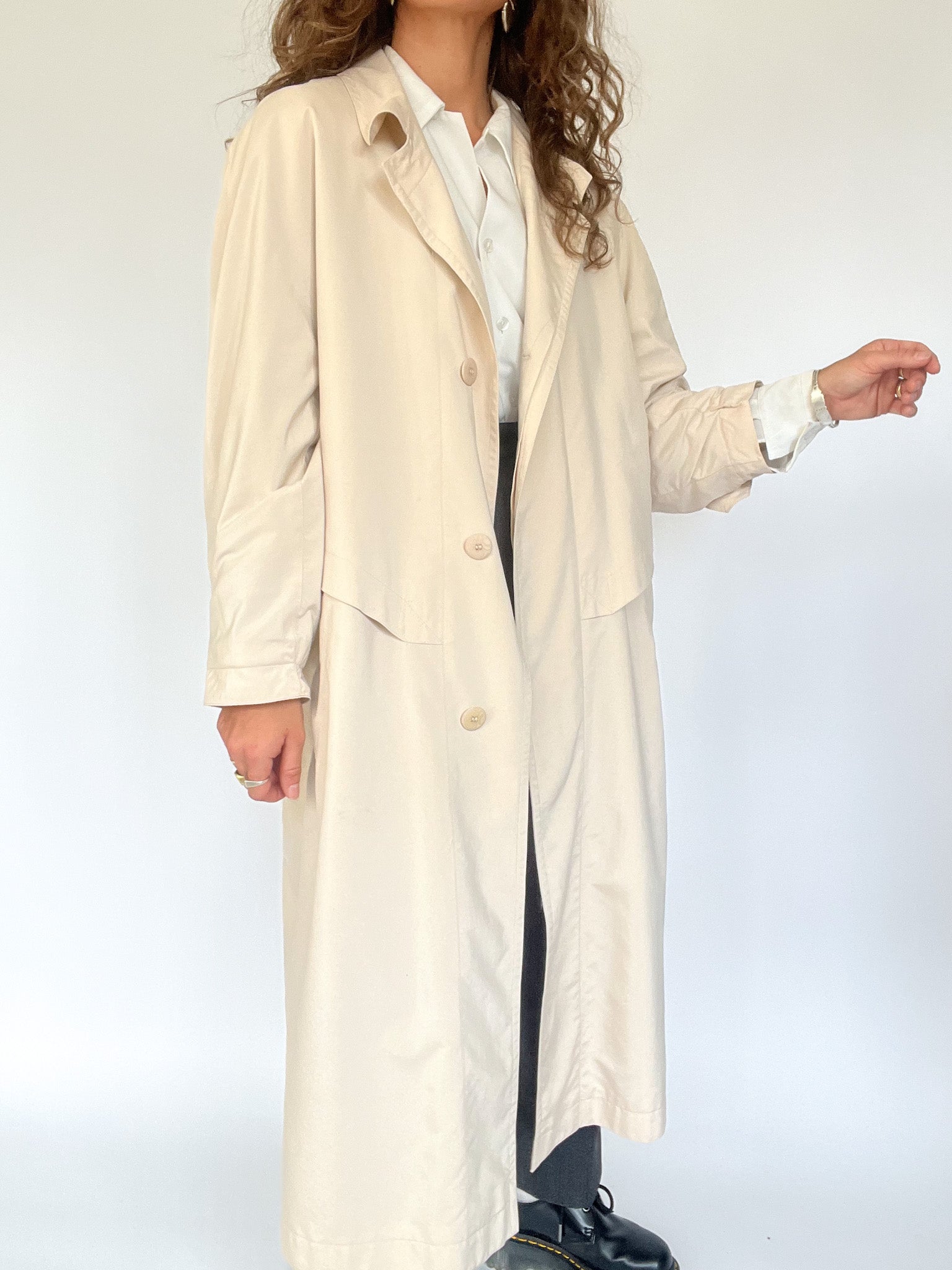 This long beige trench coat embodies timeless elegance. Its fluid and minimalist cut makes it a versatile piece, perfect for completing any outfit, whether for the office or a city outing. Slightly oversized, it offers a relaxed yet sophisticated look while providing optimal comfort. A wardrobe essential for a chic and timeless style.