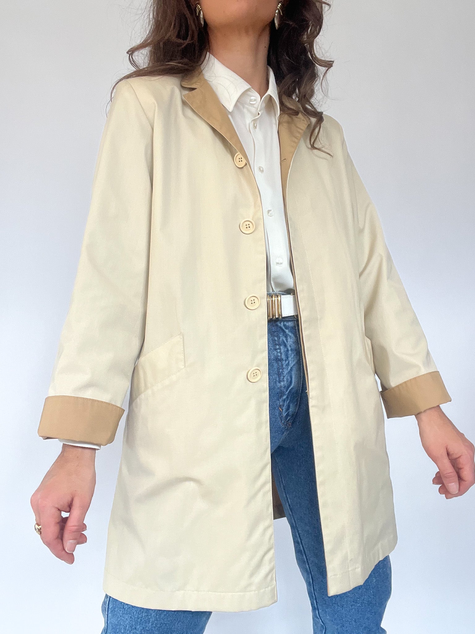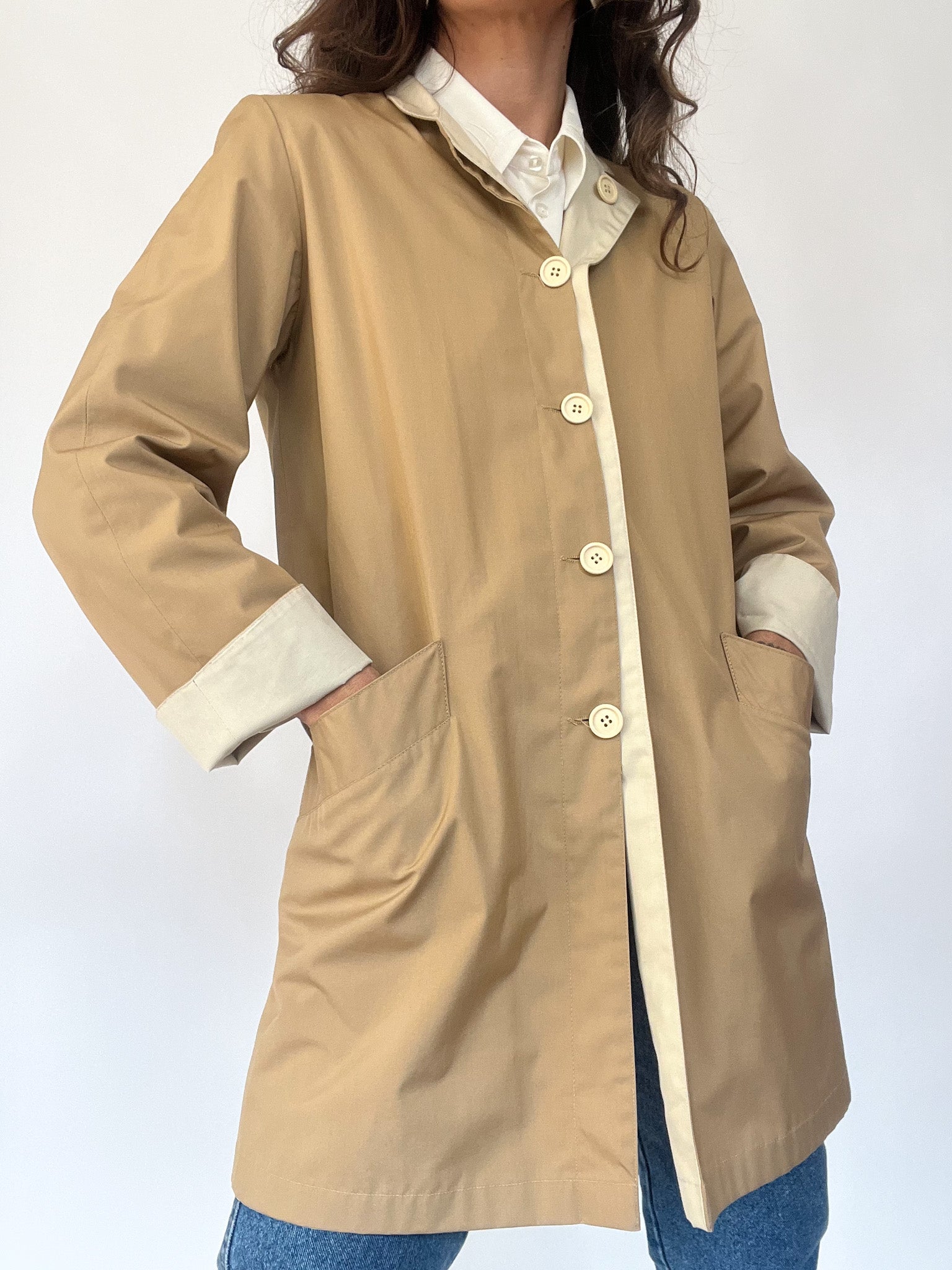A refined trench coat that blends minimalism and versatility. This reversible design offers two styling options: a light beige side for timeless elegance and a camel side for a bolder statement. With its straight cut and subtle collar, it remains effortlessly modern.