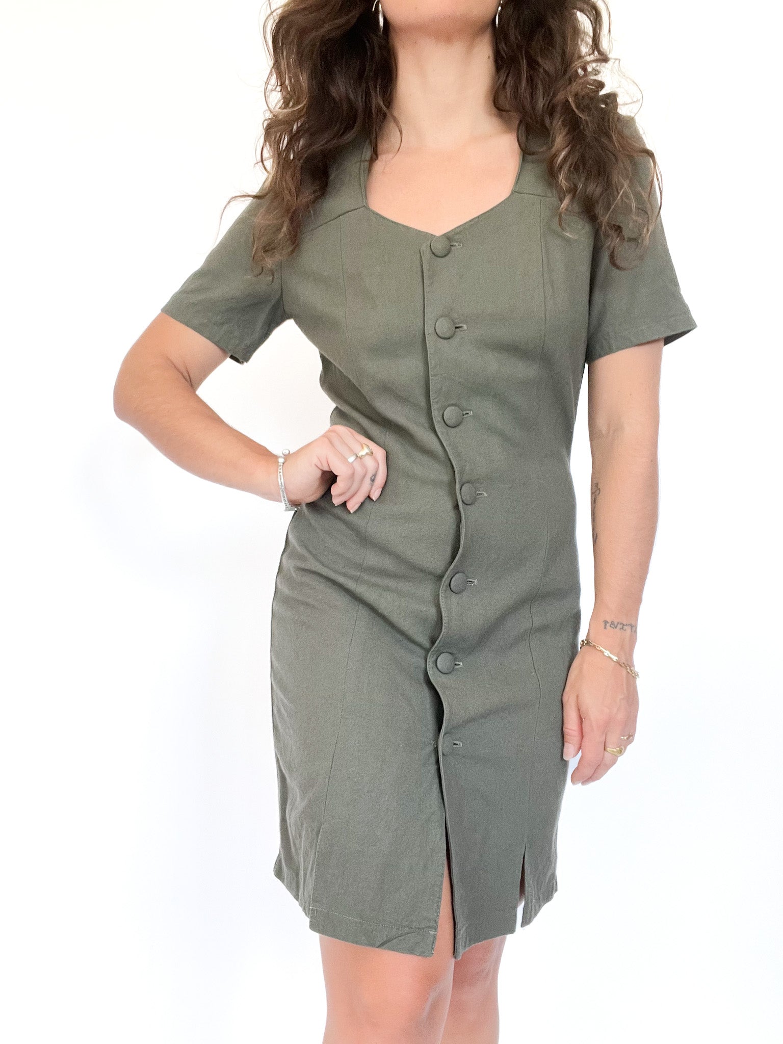 A refined 90’s silhouette designed for bold summer statements. This fitted olive green dress features a beautifully sculpted neckline and an off-centre button closure that elongates the figure. With its structured tailoring and soft linen-viscose blend, it hugs the body with ease while keeping a crisp, lightweight feel. It’s the kind of dress you reach for when you want to channel understated power—the kind that doesn’t shout but always gets noticed. A classic reimagined for warm days and cooler nights, curated with the eye of Skorpiones Vintage: where elegance meets singularity.