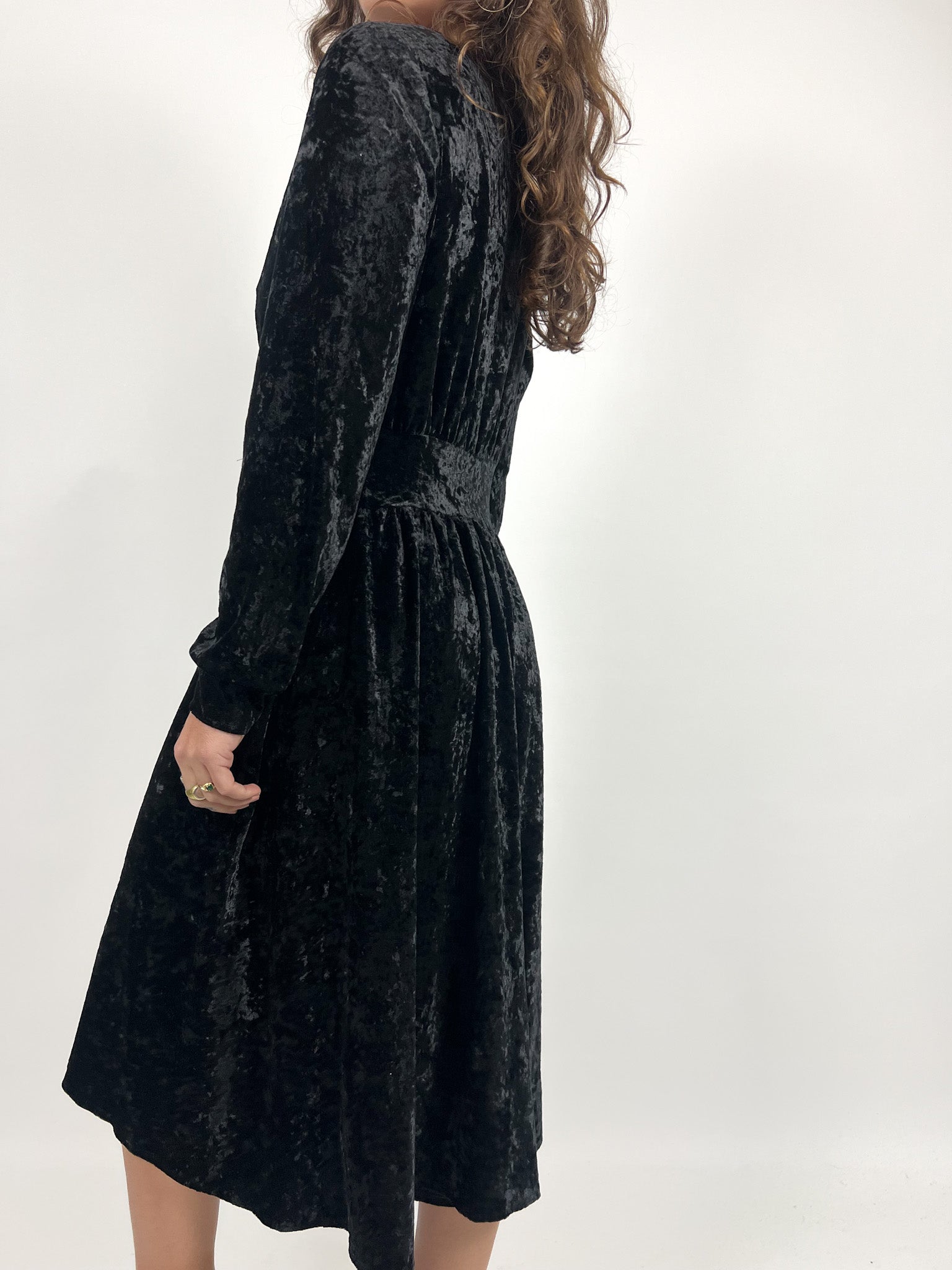 This exquisite vintage black velvet dress embodies timeless elegance and sophistication. The rich, textured velvet is complemented by a cinched waistline adorned with intricate golden floral buttons, adding a touch of vintage glamour. The flowing A-line skirt enhances movement, creating a graceful silhouette.